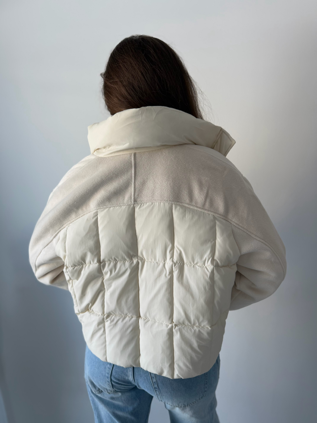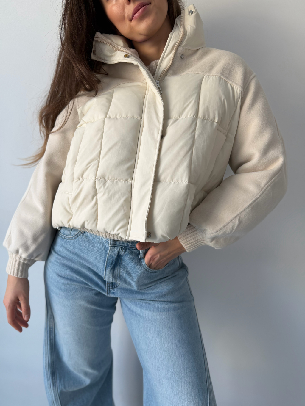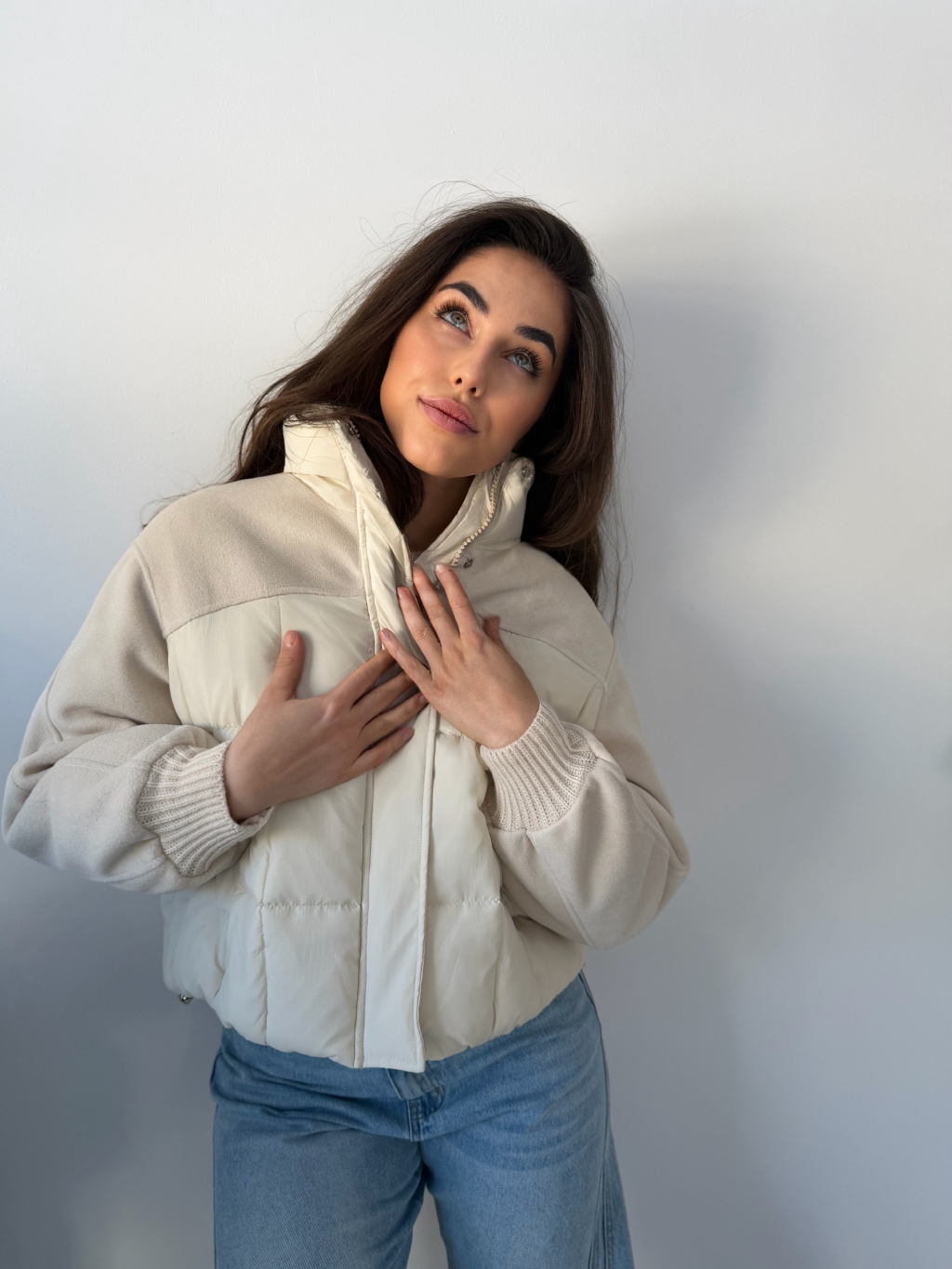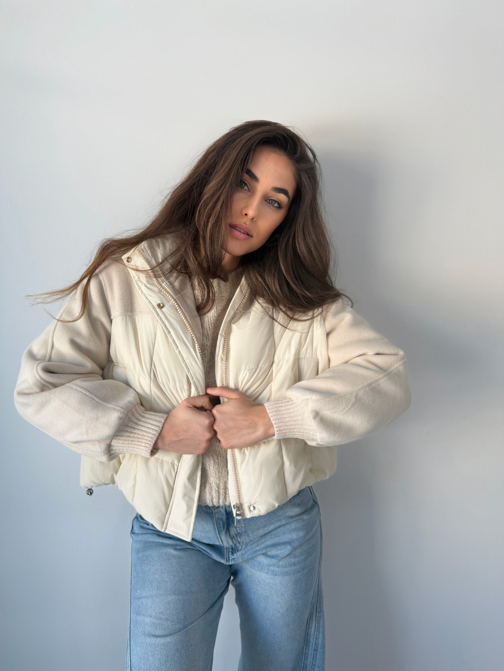 Krátká bunda bez kapuce kombinující dva materiály. Zapínání na zip. Dvě kapsy po stranách. Rukávy jsou zakončený úplety kolem zápěstí. Ve spodní části lze bundu stáhnout.