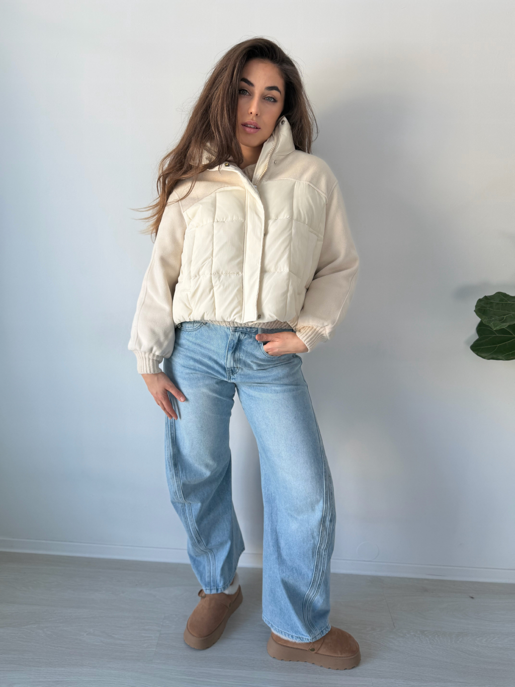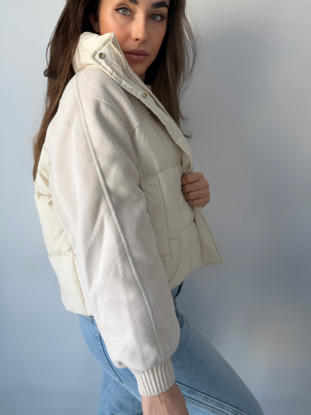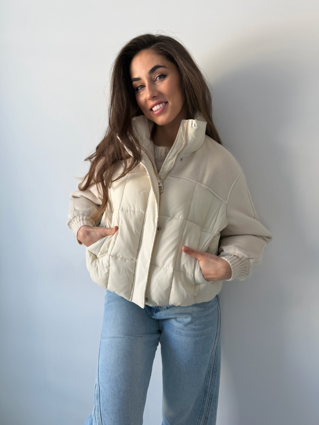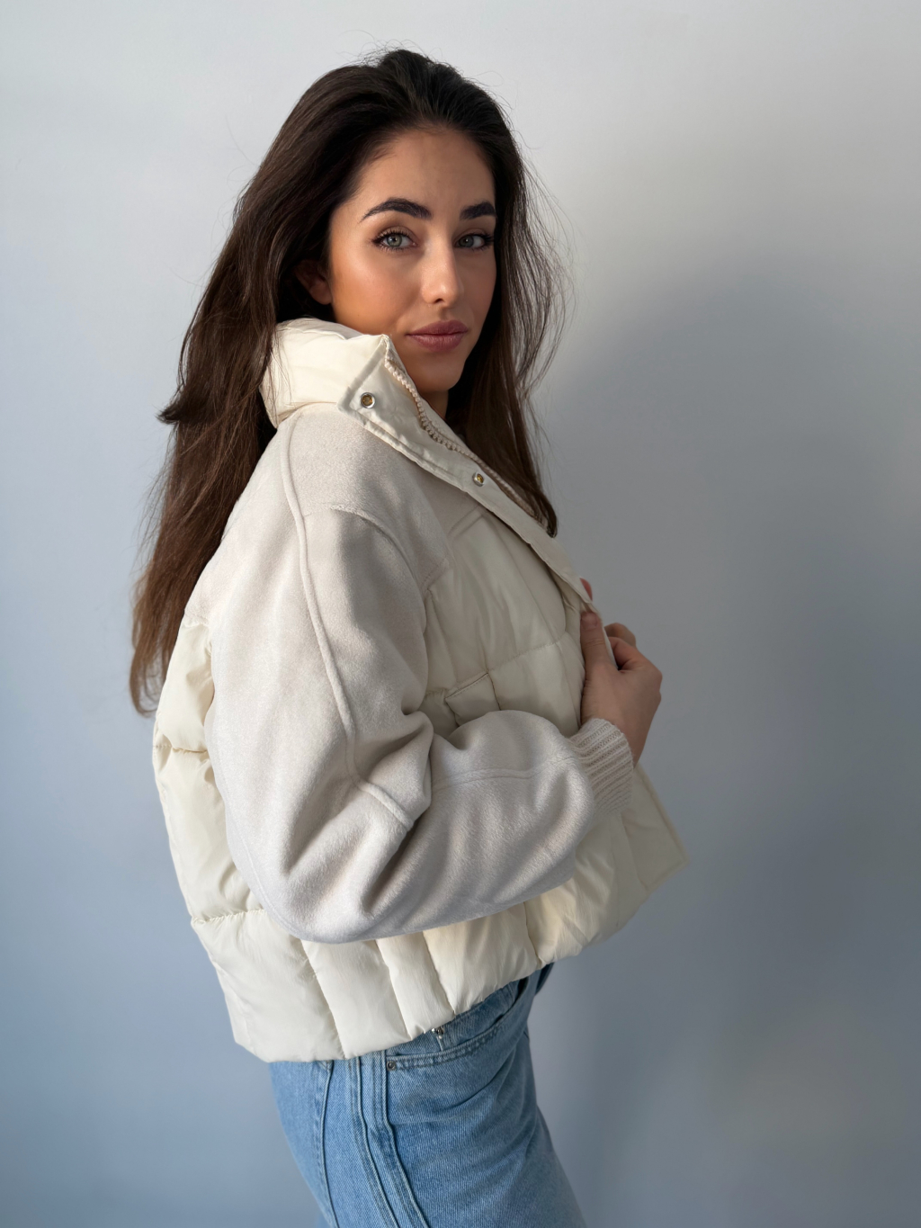Krátká bunda bez kapuce kombinující dva materiály. Zapínání na zip. Dvě kapsy po stranách. Rukávy jsou zakončený úplety kolem zápěstí. Ve spodní části lze bundu stáhnout.