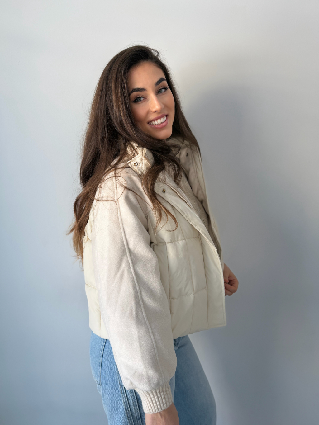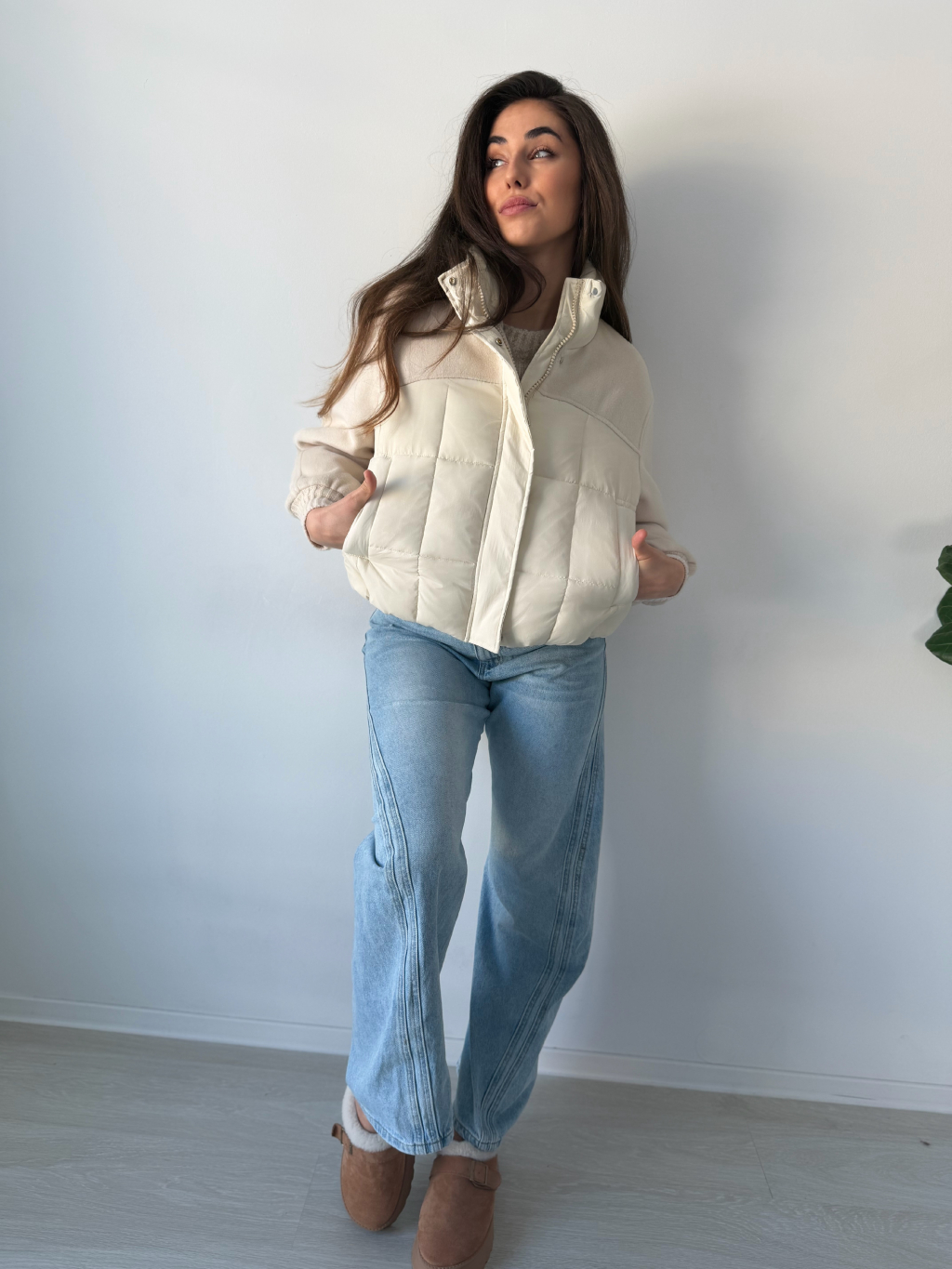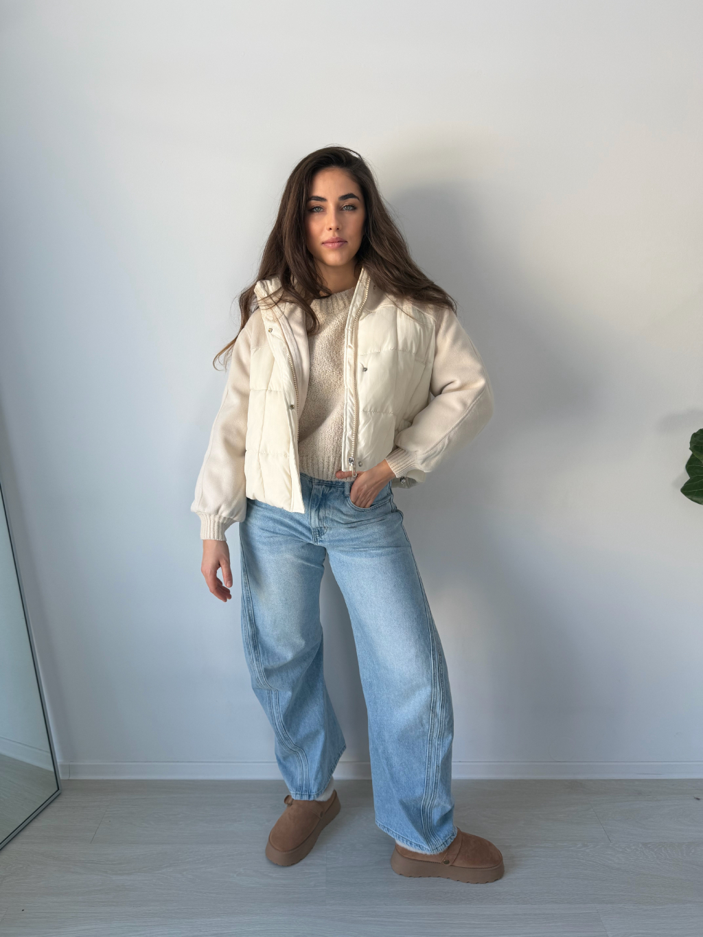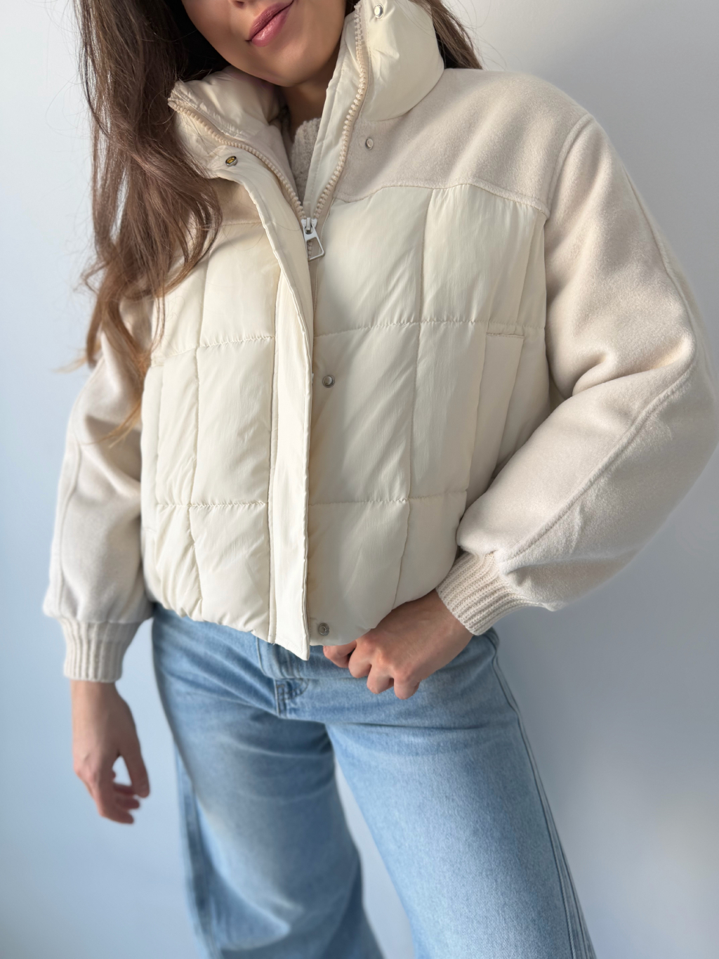 Krátká bunda bez kapuce kombinující dva materiály. Zapínání na zip. Dvě kapsy po stranách. Rukávy jsou zakončený úplety kolem zápěstí. Ve spodní části lze bundu stáhnout.