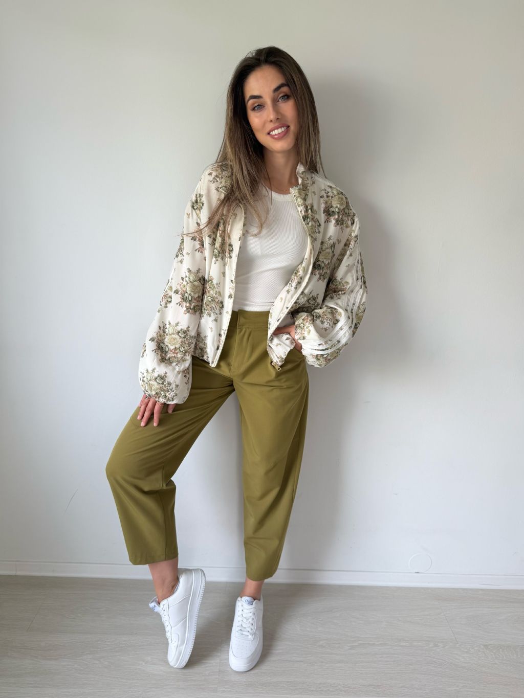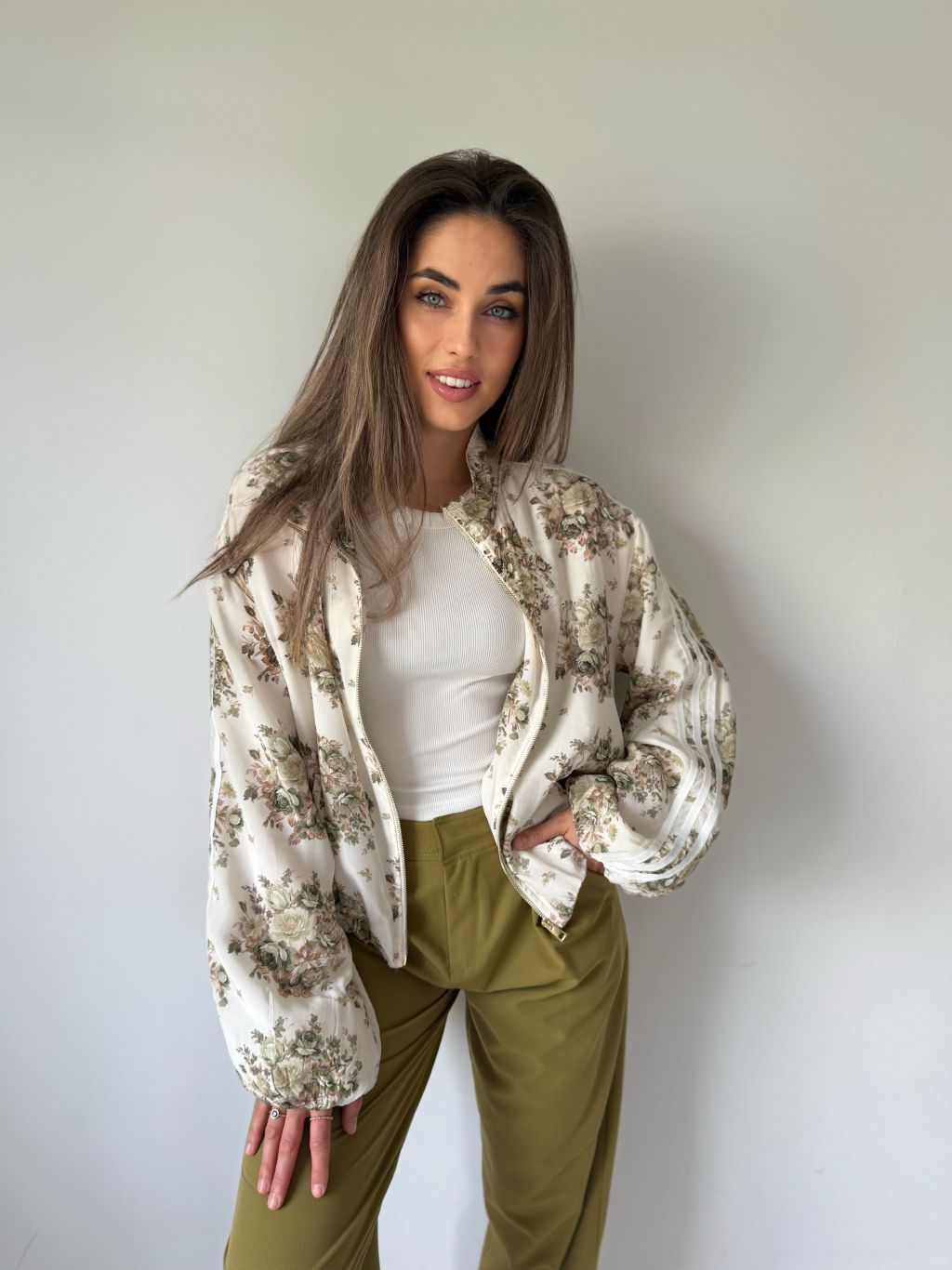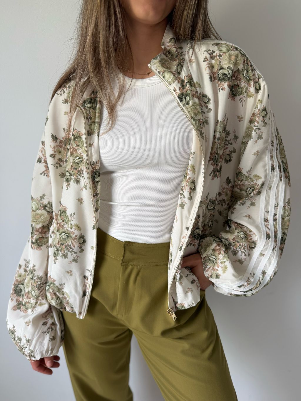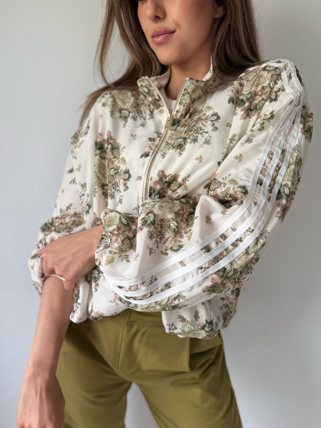 Lehká bundička se zapínáním na zip. Na rukávech tři pruhy. Dvě praktické kapsy. Dole pružná guma.
