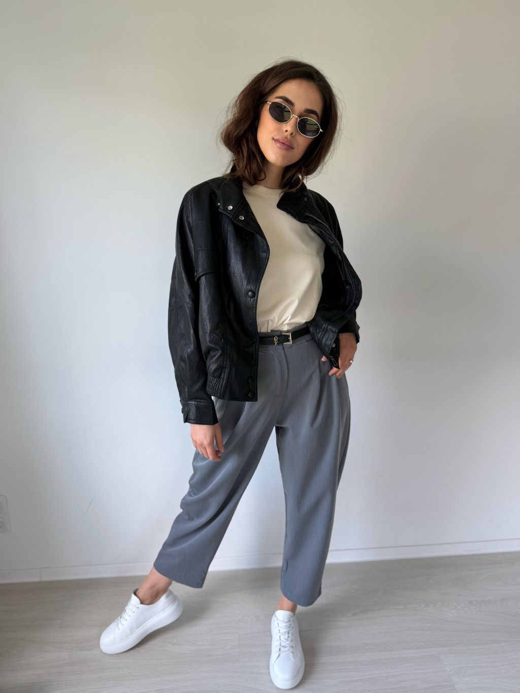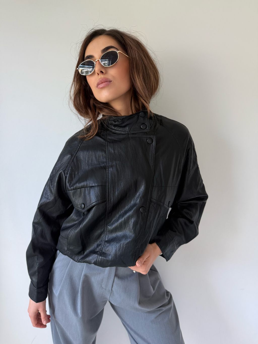 Lehká, koženková bunda se zapínáním na zip a s překladem na cvok. Dole pružná guma. Dvě šikmé kapsy. Dvě rovné falešné kapsy na cvok.