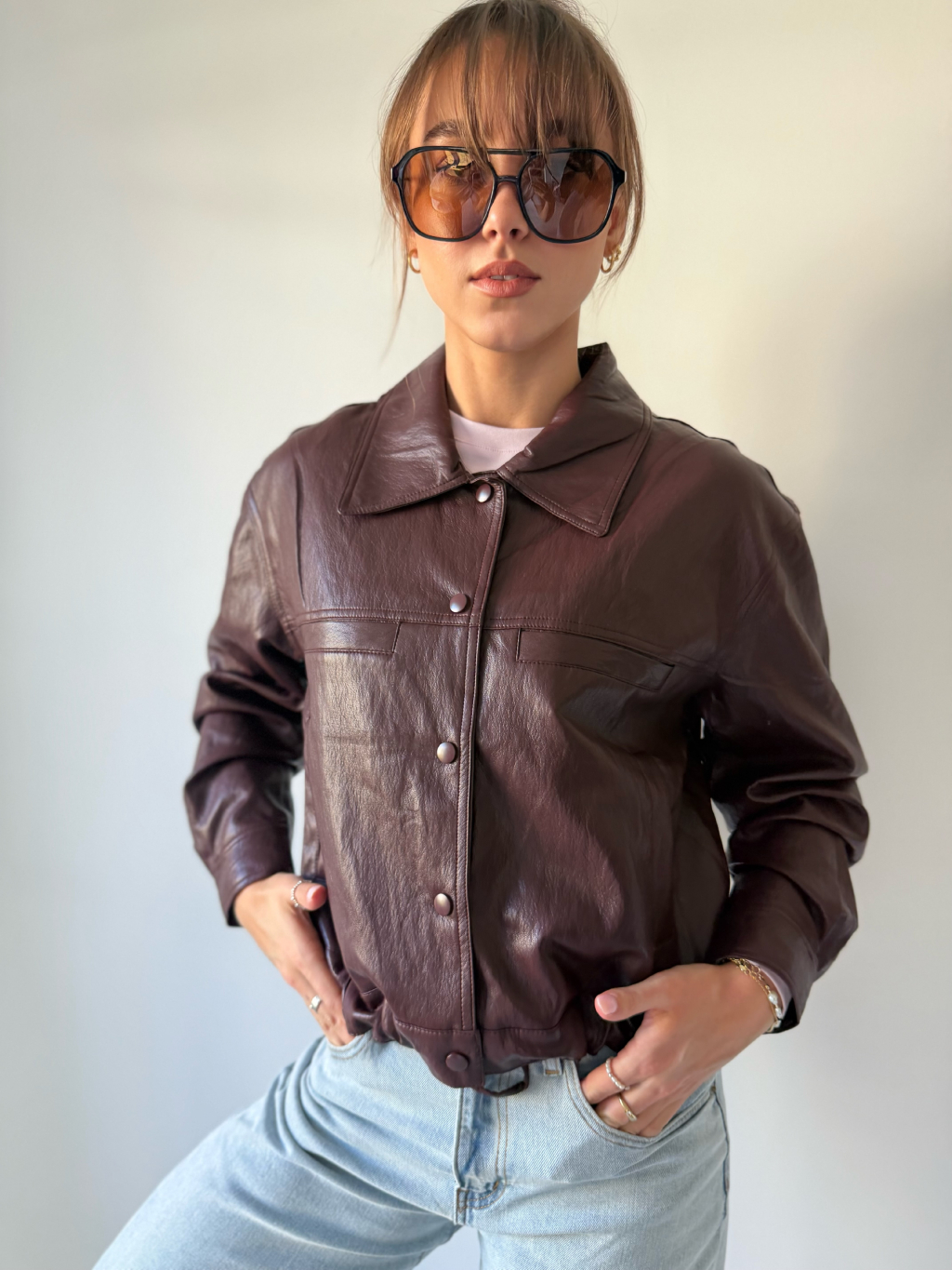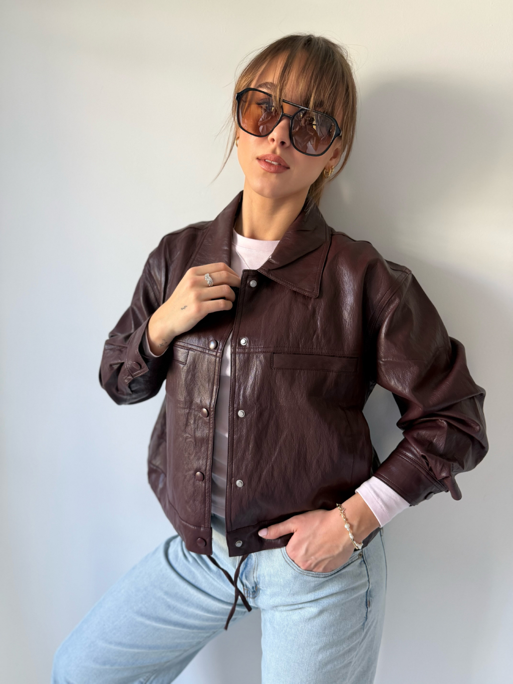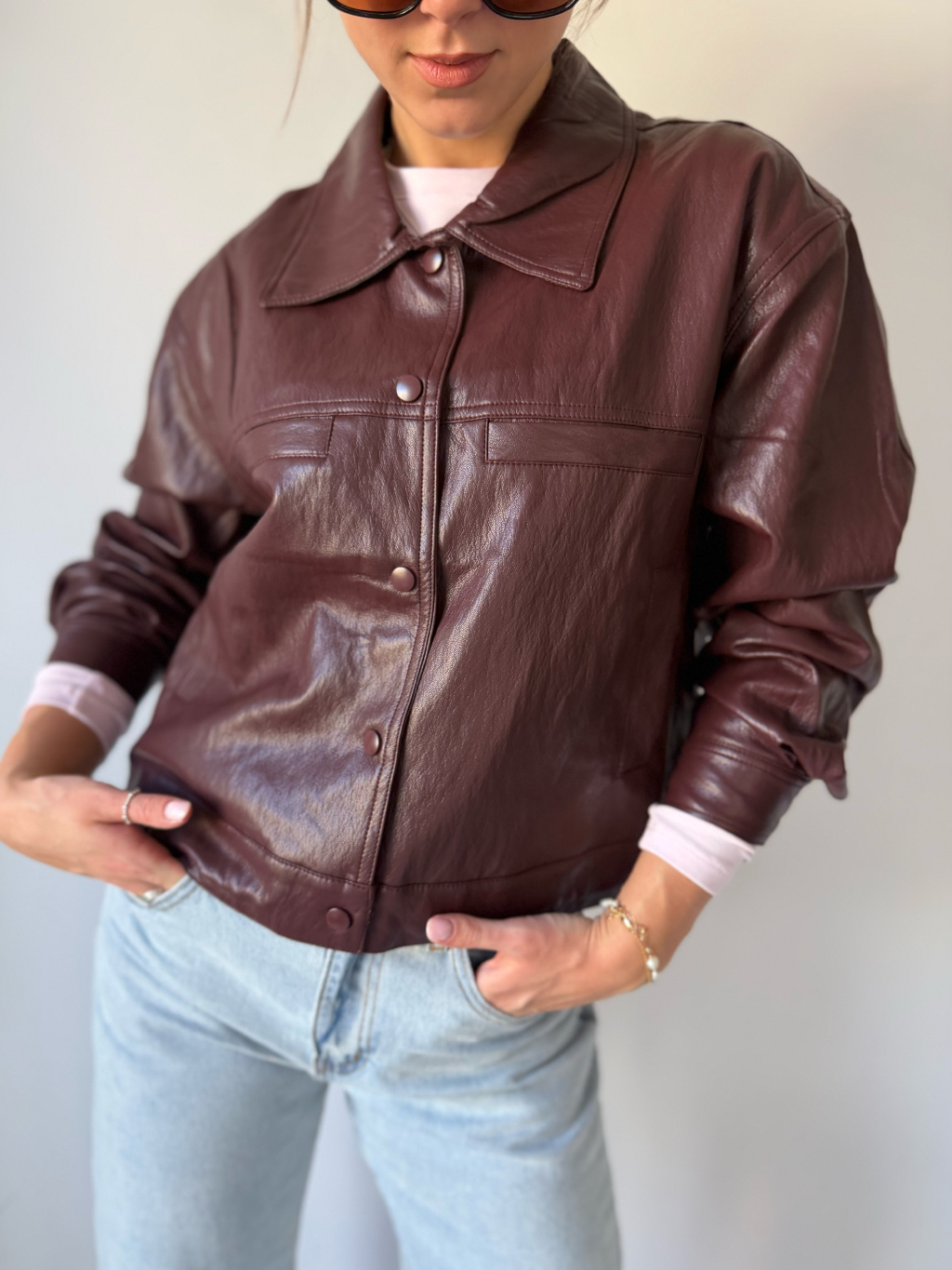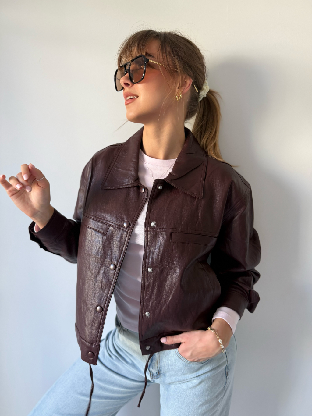 Koženková bunda se zapínáním na cvoky. Dvě falešné náprsní kapsy. Dvě kapsy po stranách. Ve spodním lemu jsou šňůrky na stažení.