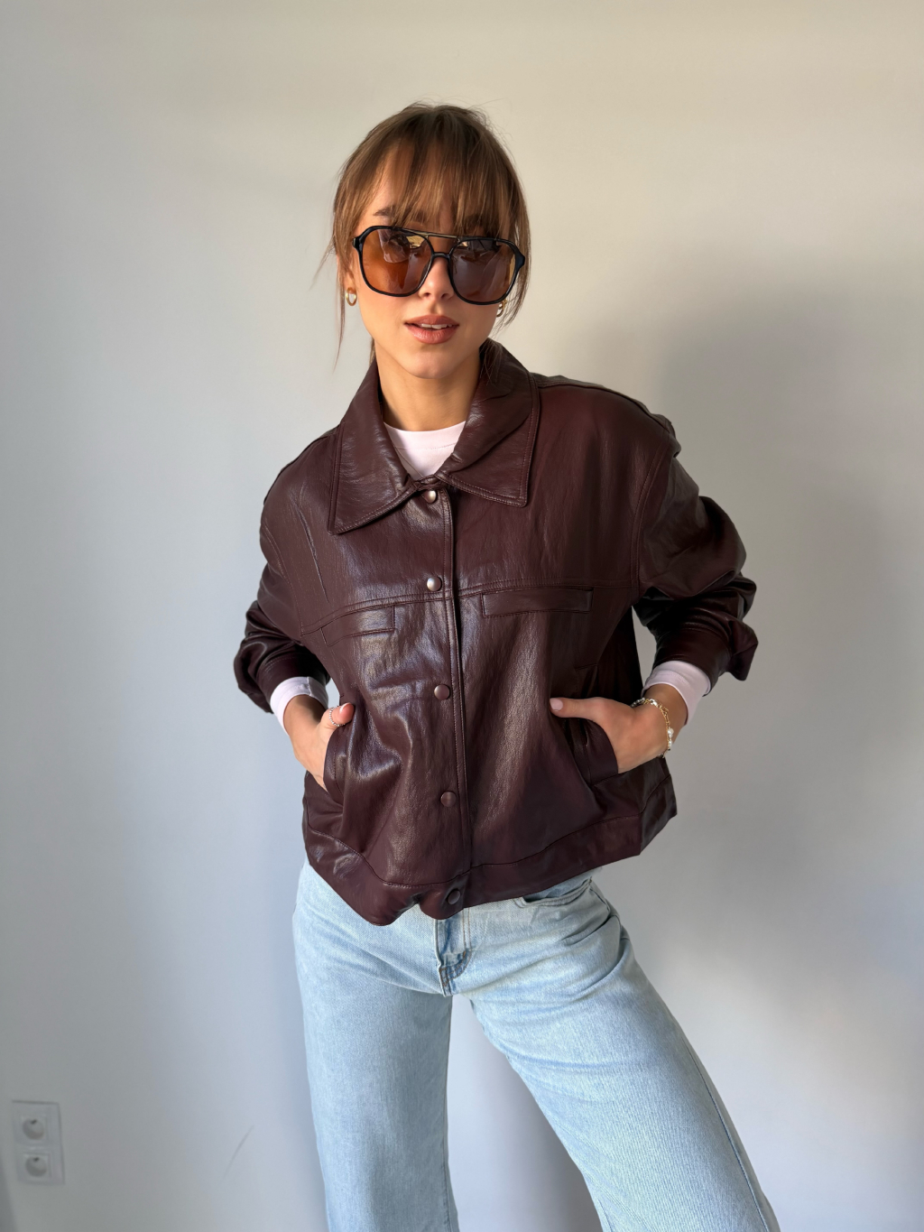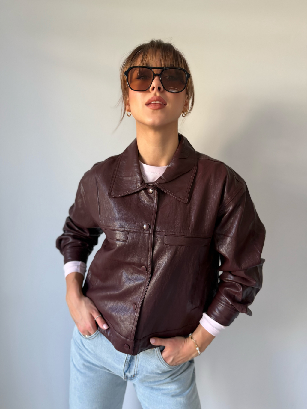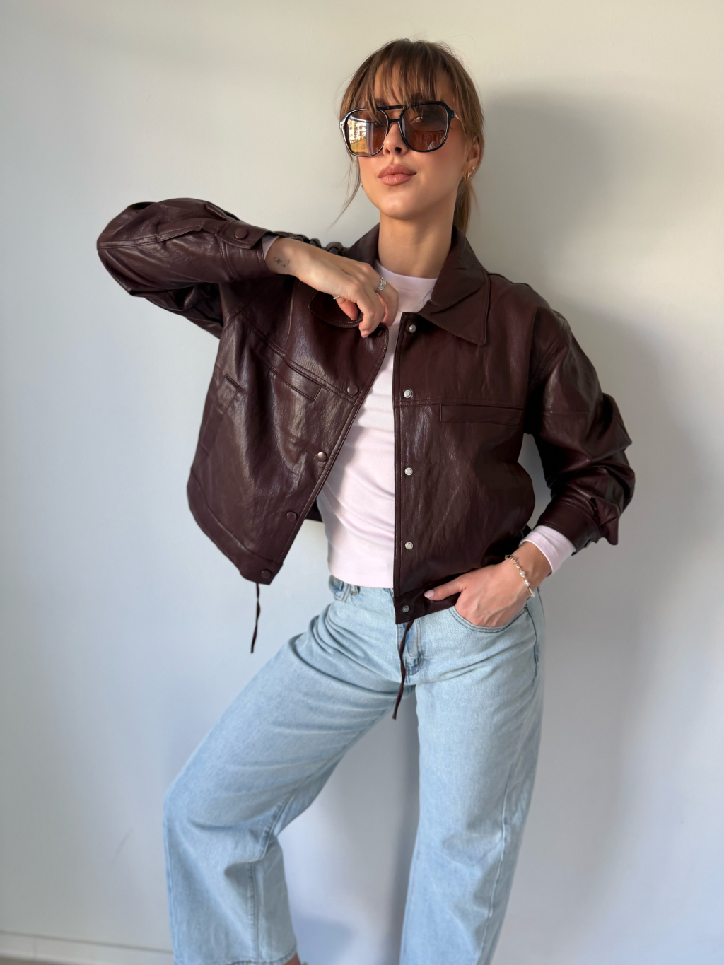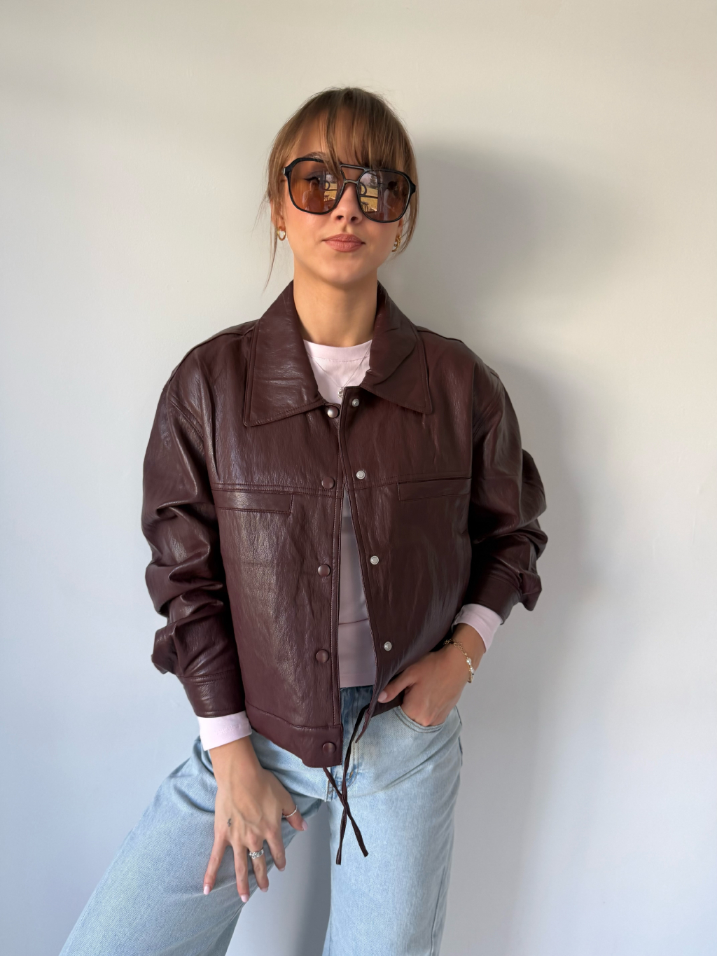 Koženková bunda se zapínáním na cvoky. Dvě falešné náprsní kapsy. Dvě kapsy po stranách. Ve spodním lemu jsou šňůrky na stažení.