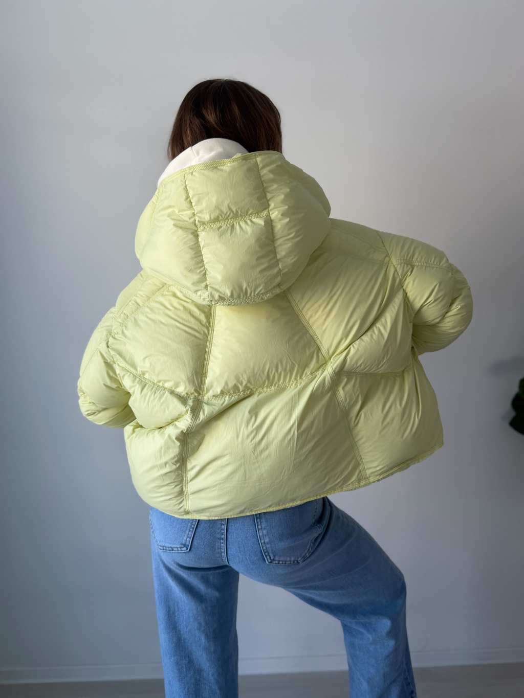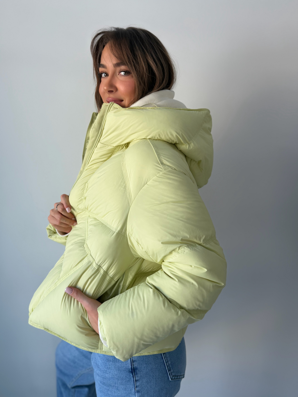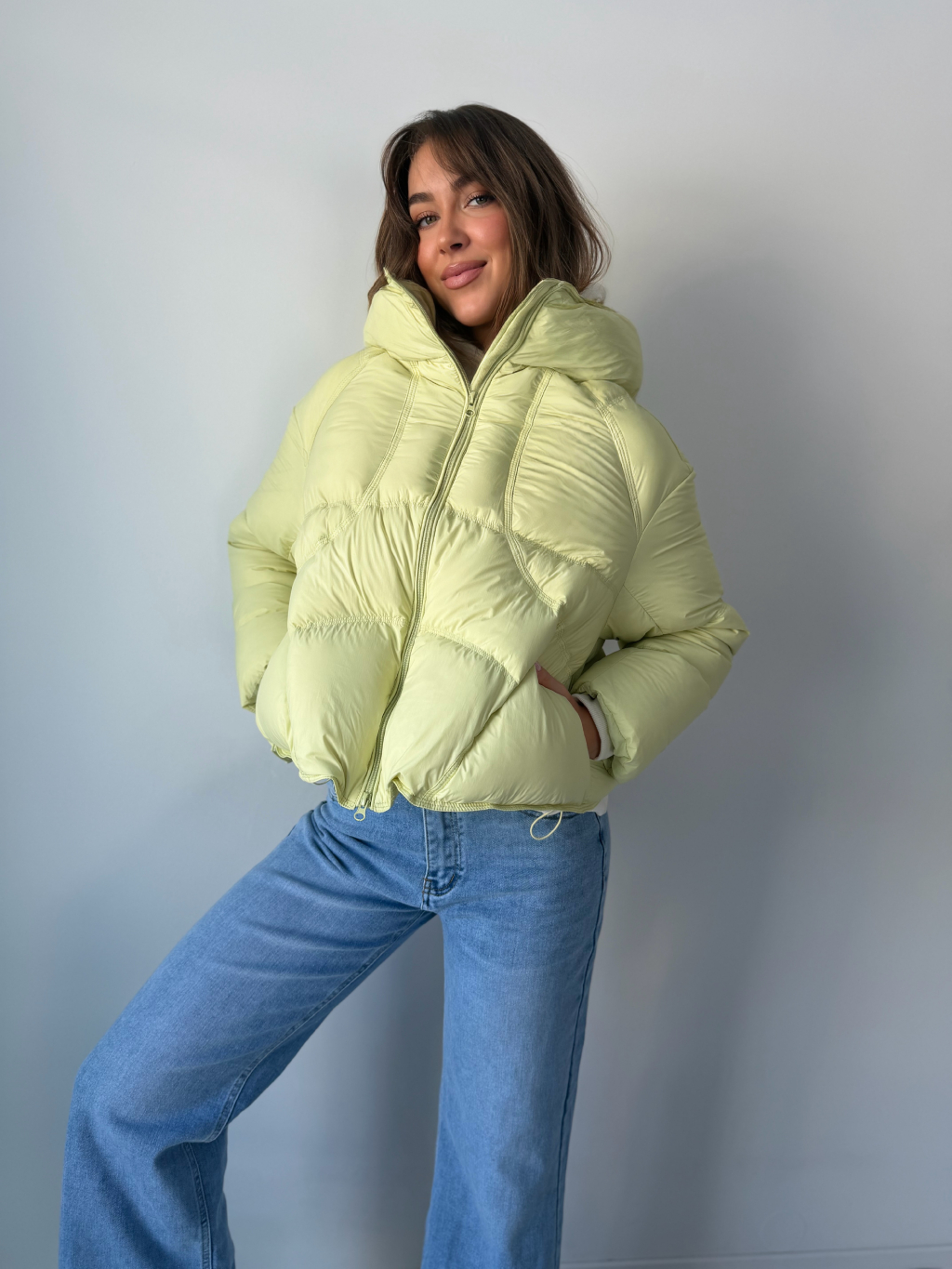 Luxusní trendy bunda s příměsí peří. Asymetrické prošívání. Kapuce i spodní část lemu na stažení. Kapsy po stranách.