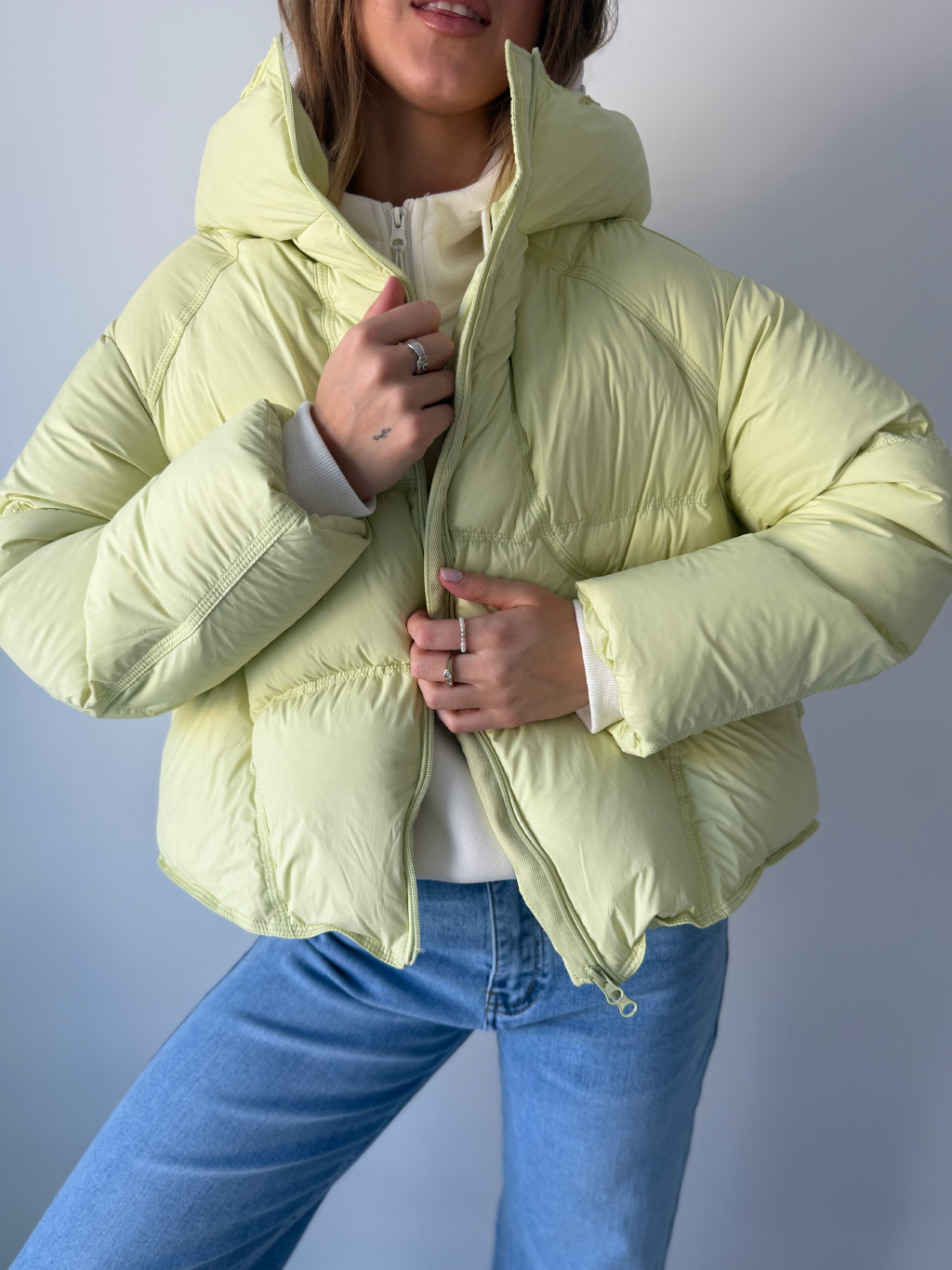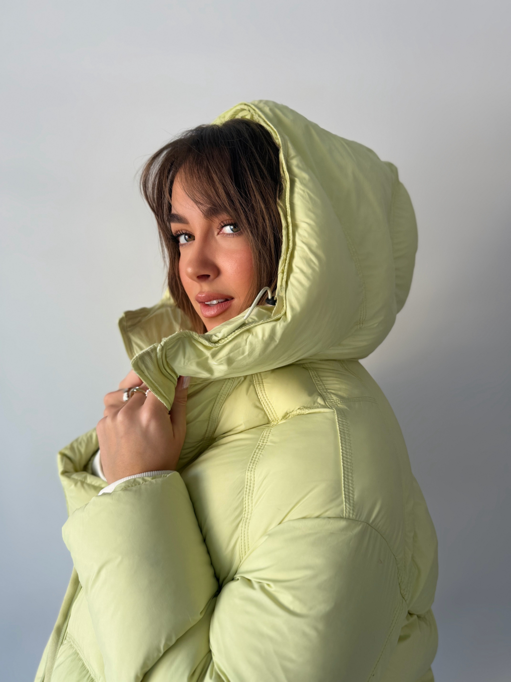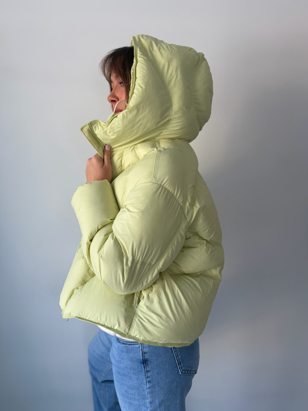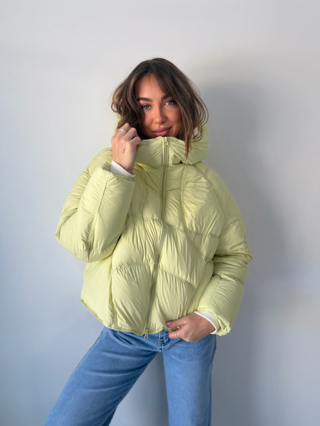 Luxusní trendy bunda s příměsí peří. Asymetrické prošívání. Kapuce i spodní část lemu na stažení. Kapsy po stranách.
