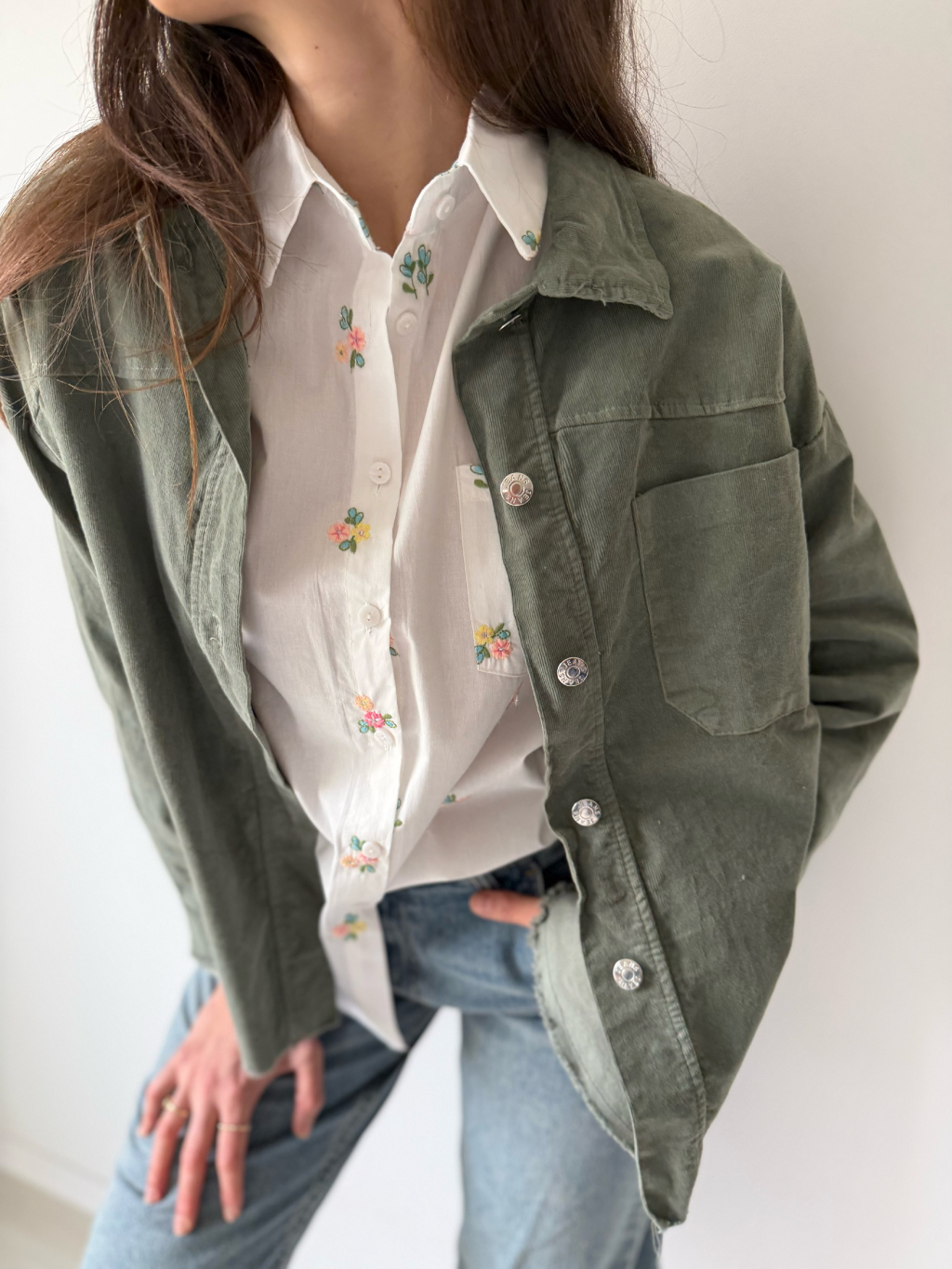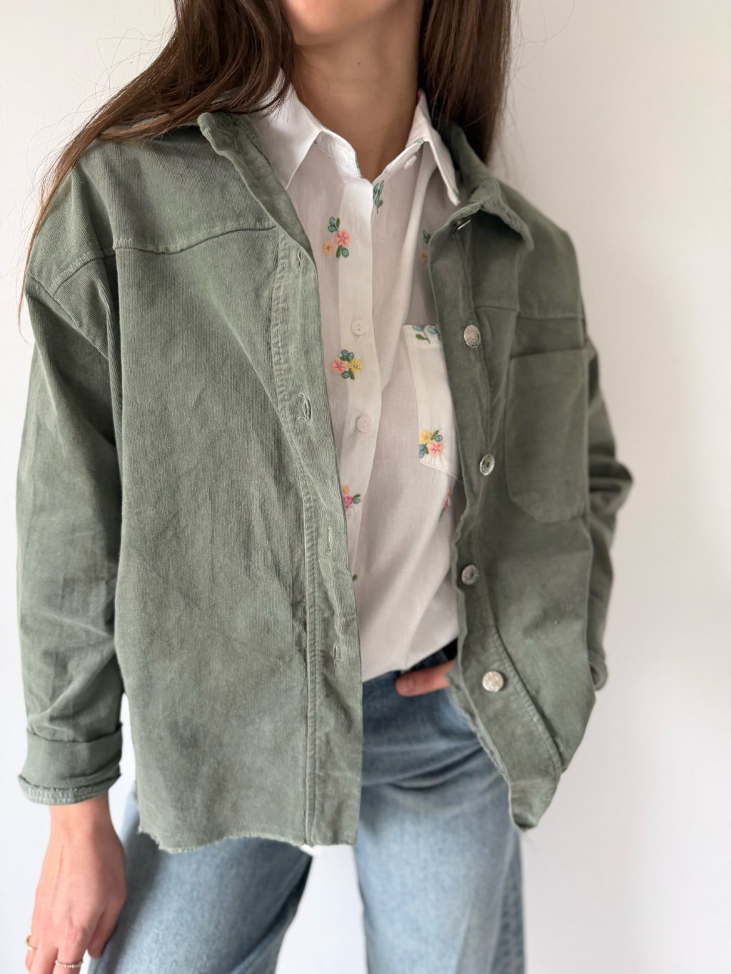 Manšestrová košile se zapínáním na knoflíky. Dvě kapsy ukryté ve stranách. Jedna náprsní kapsa. Spodní lem košile je roztřepený.