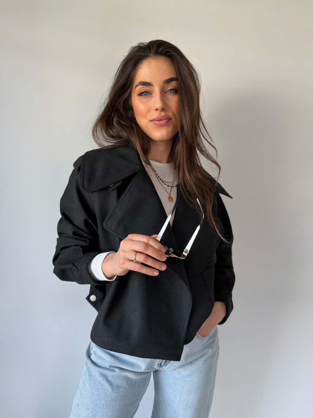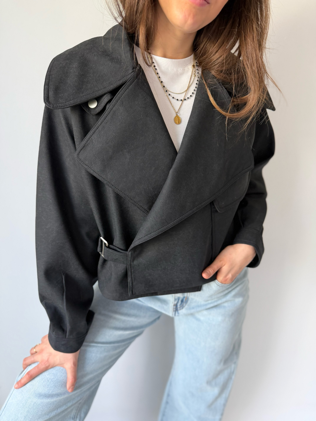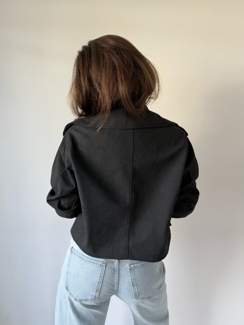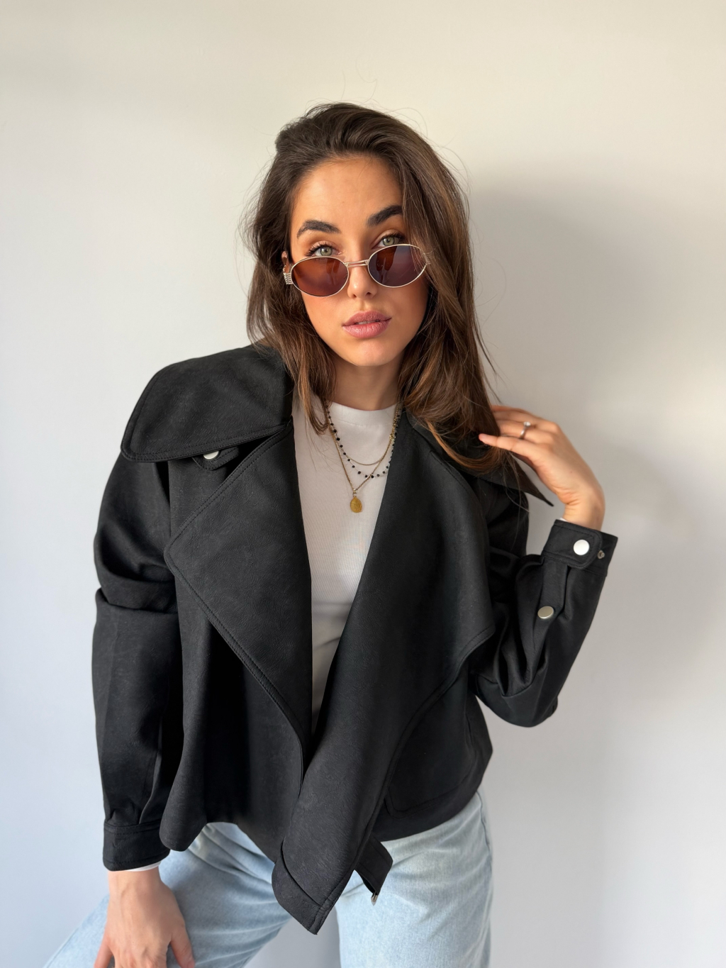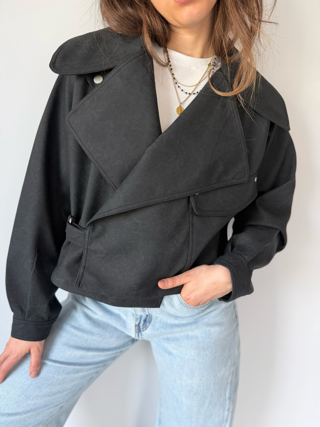 Černá matná bunda s kříženým zapínáním na přezku s cvok. Jedna velká výrazná kapsa.