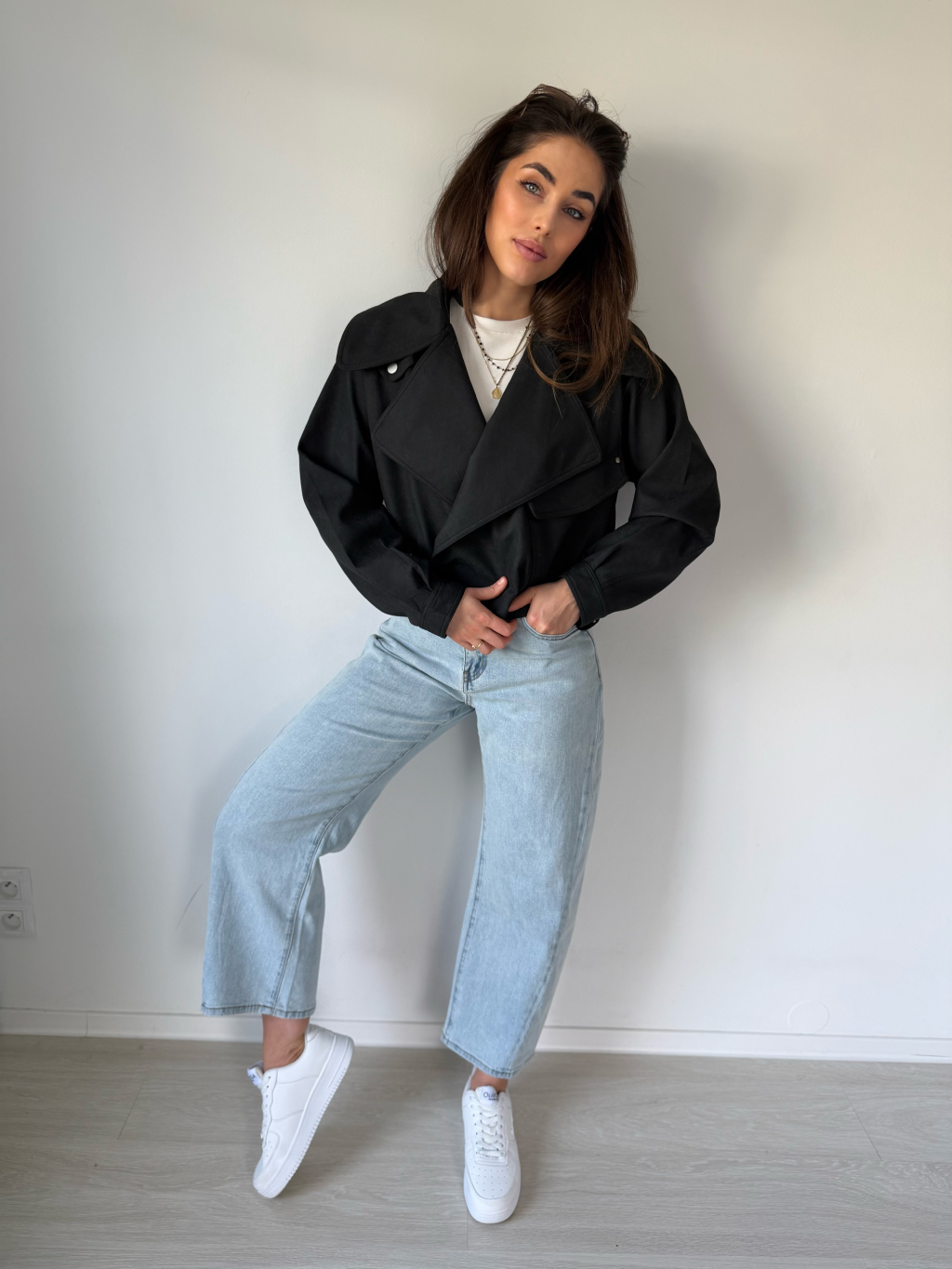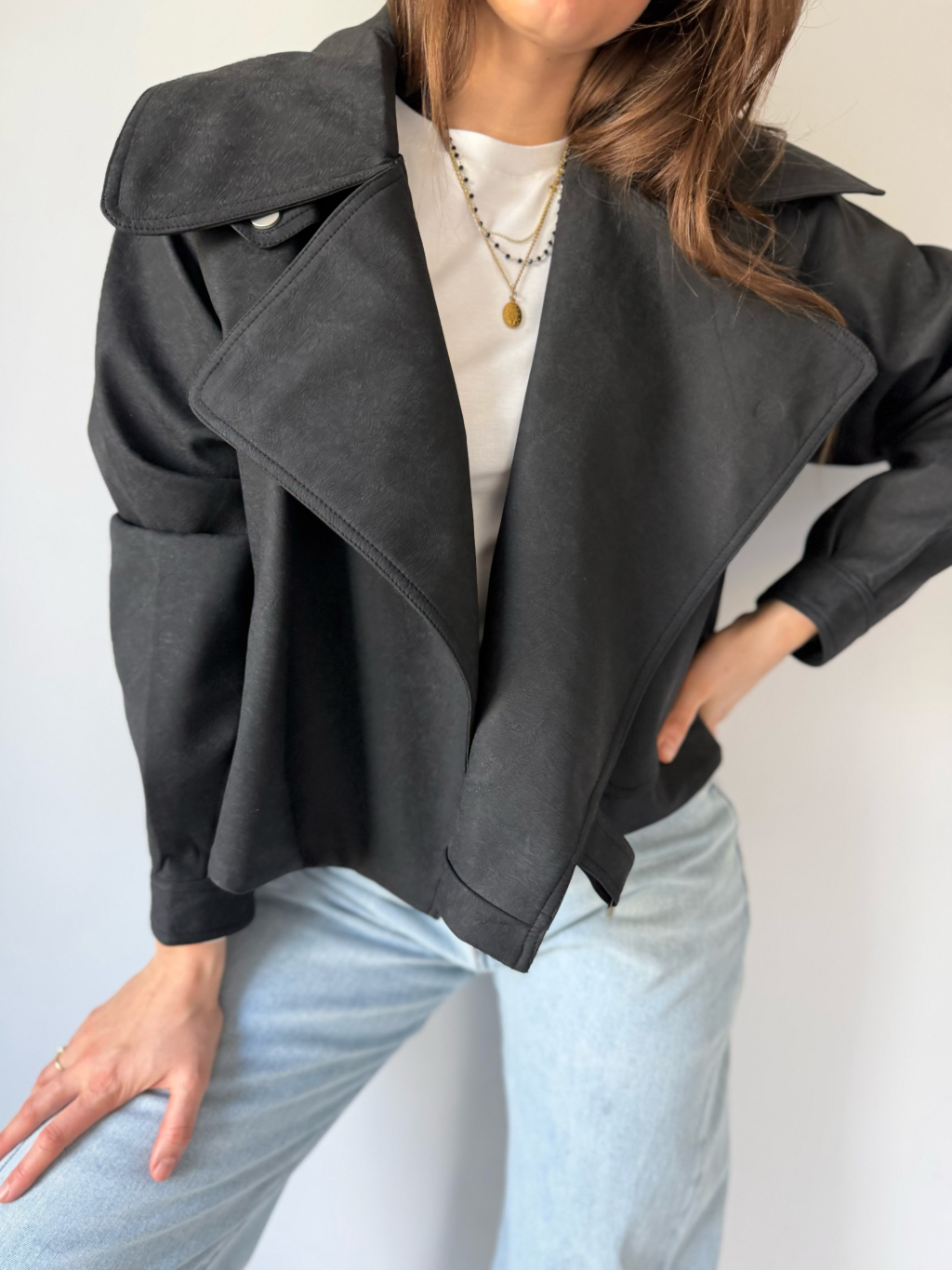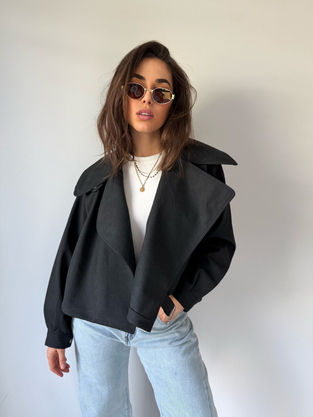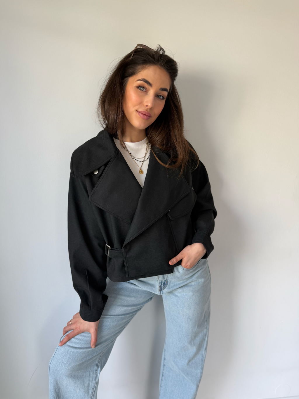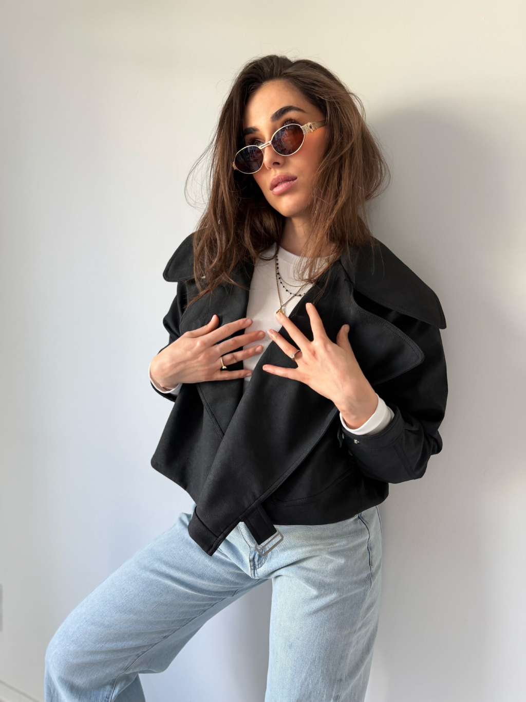 Černá matná bunda s kříženým zapínáním na přezku s cvok. Jedna velká výrazná kapsa.