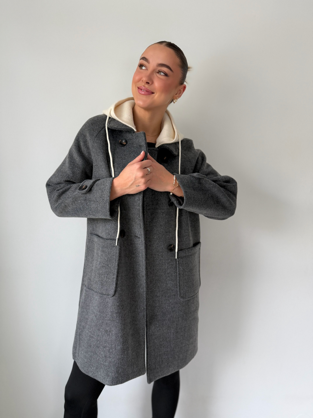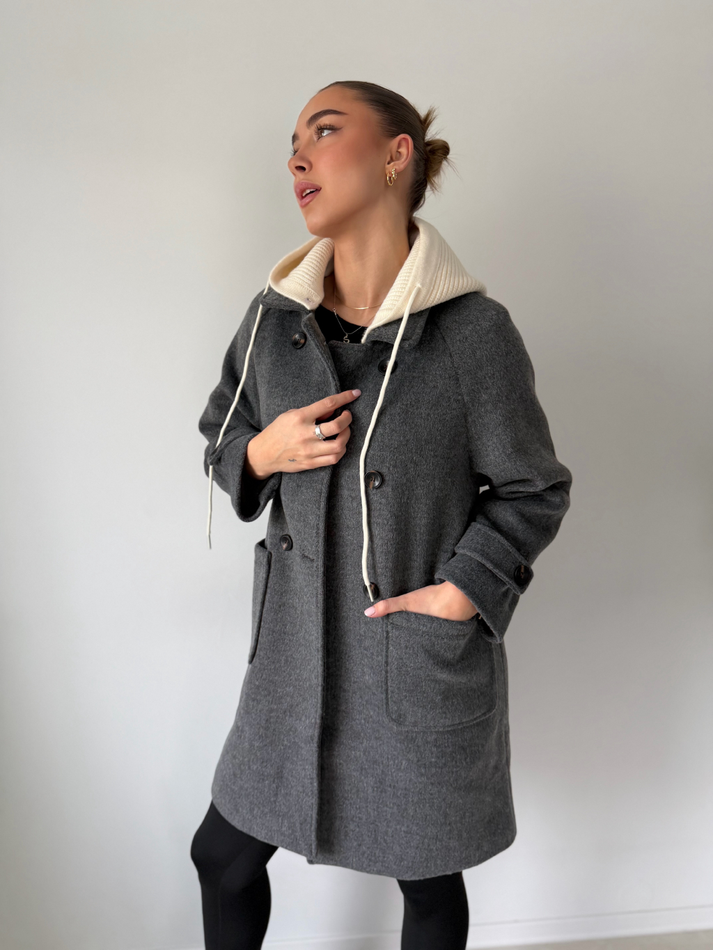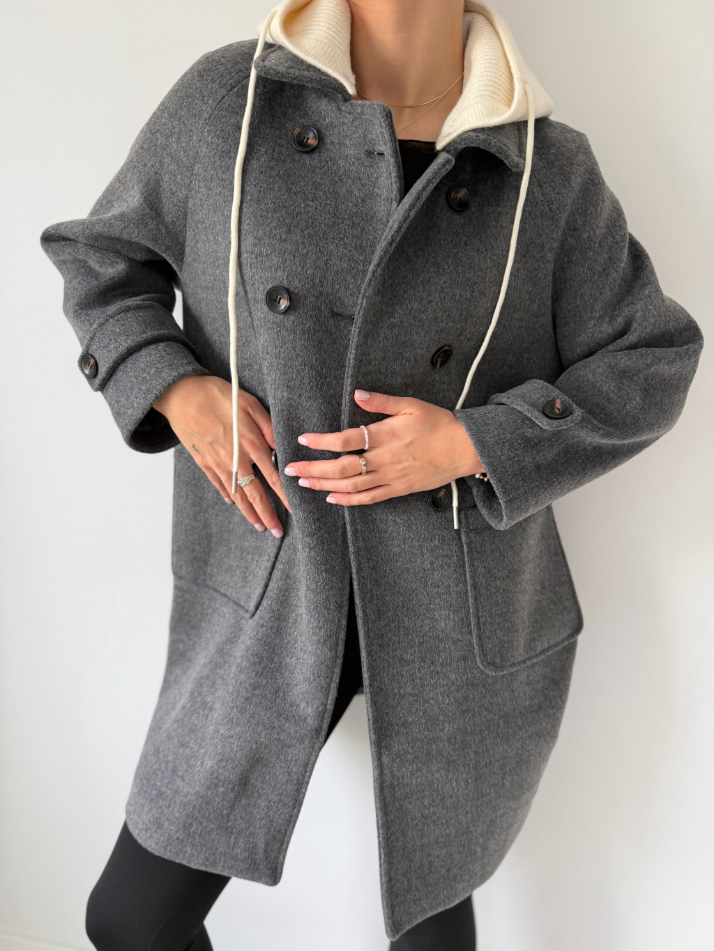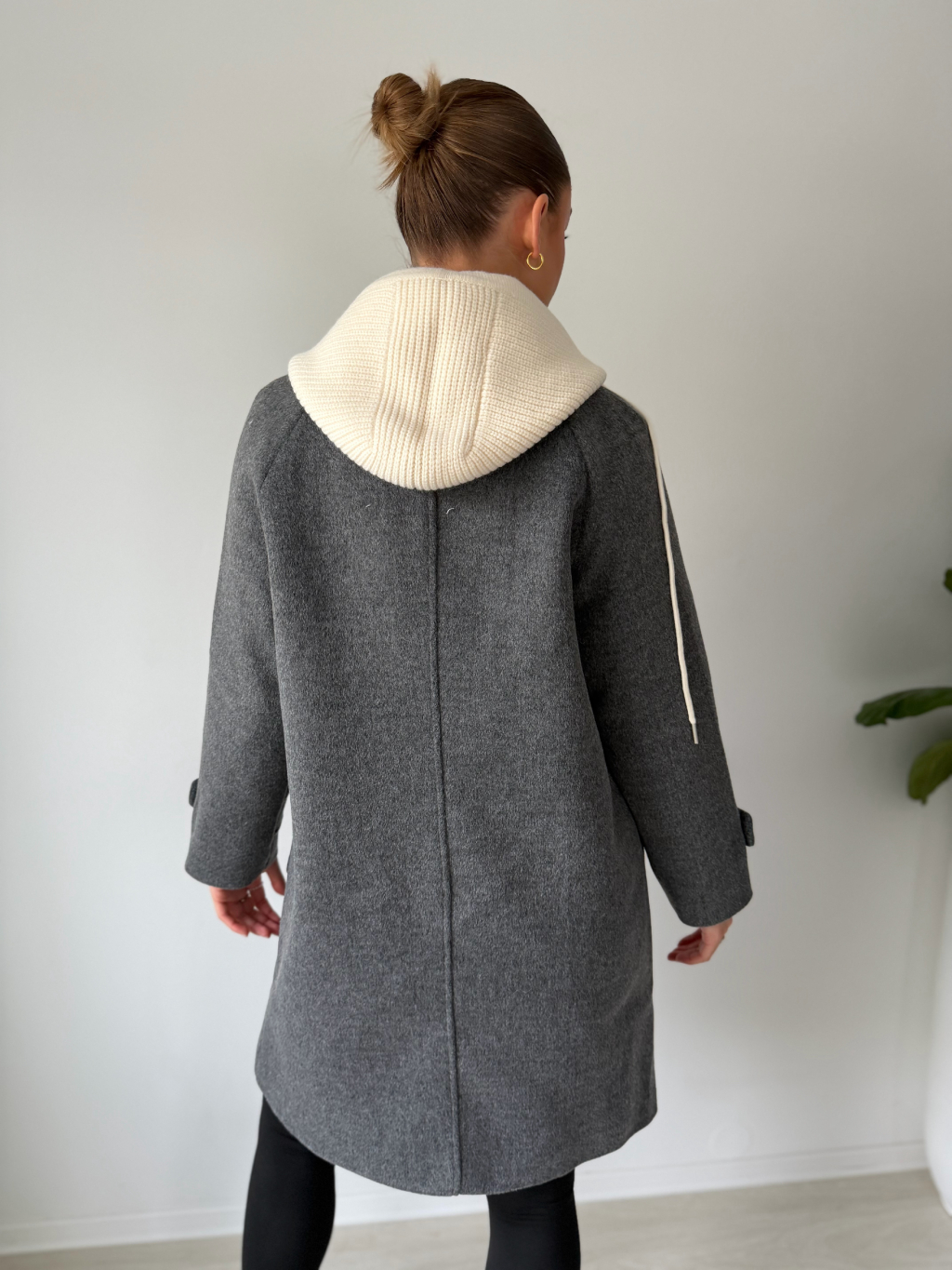 Kabát z velmi žádaného merina se zapínáním na knoflíky. Odepínací pletená kapuce se šňůrkami.