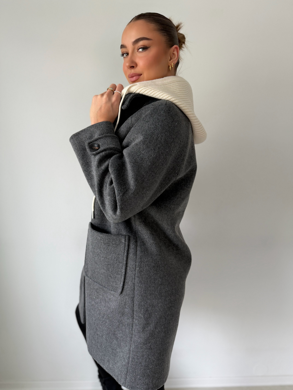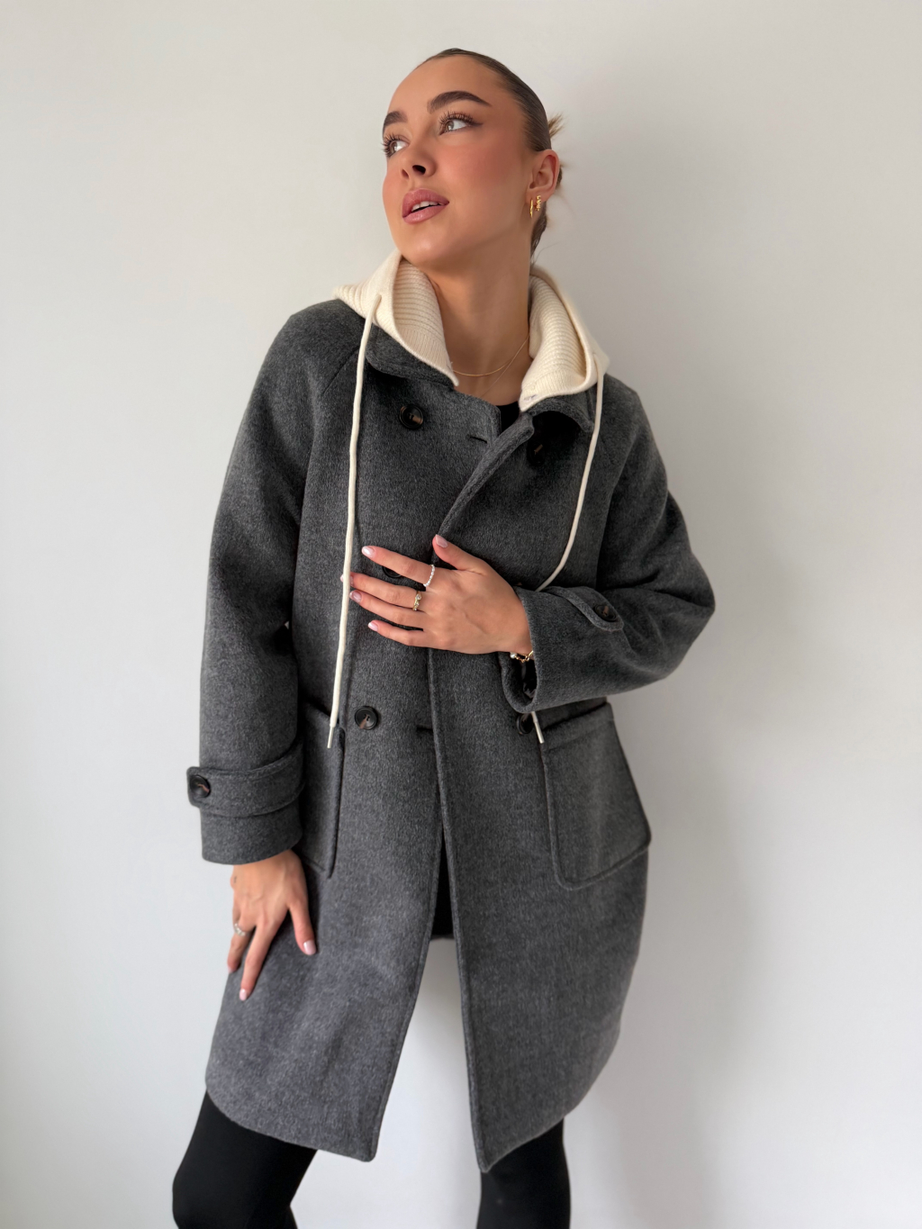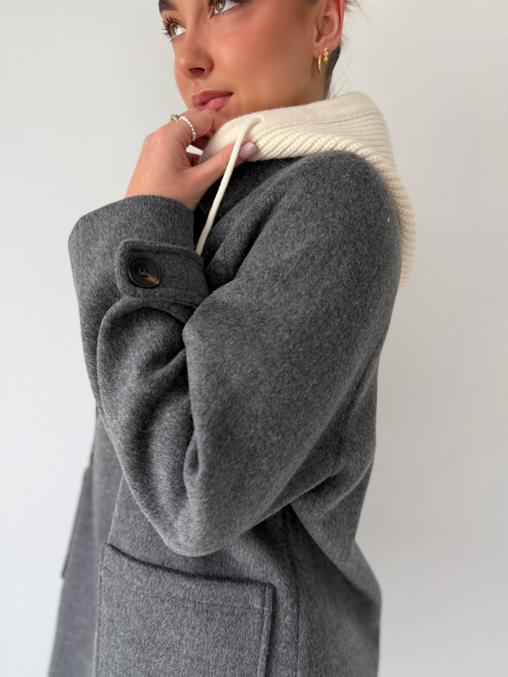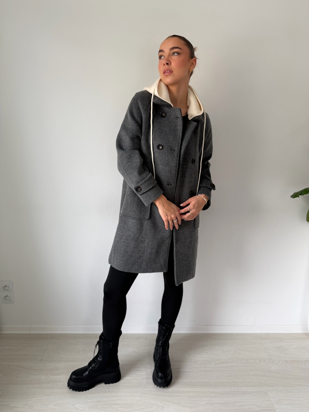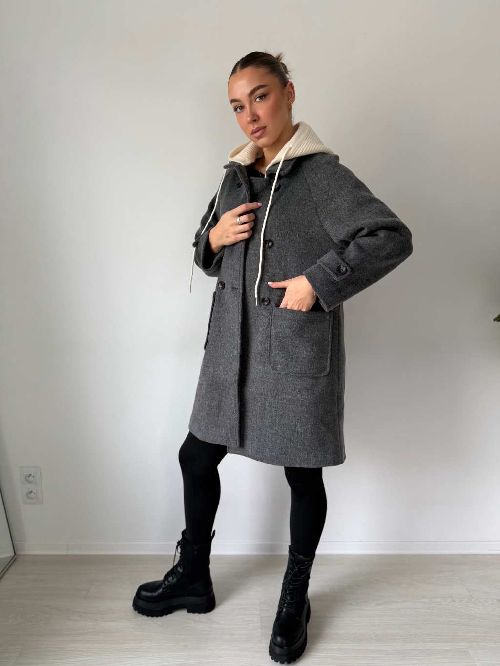 Kabát z velmi žádaného merina se zapínáním na knoflíky. Odepínací pletená kapuce se šňůrkami.