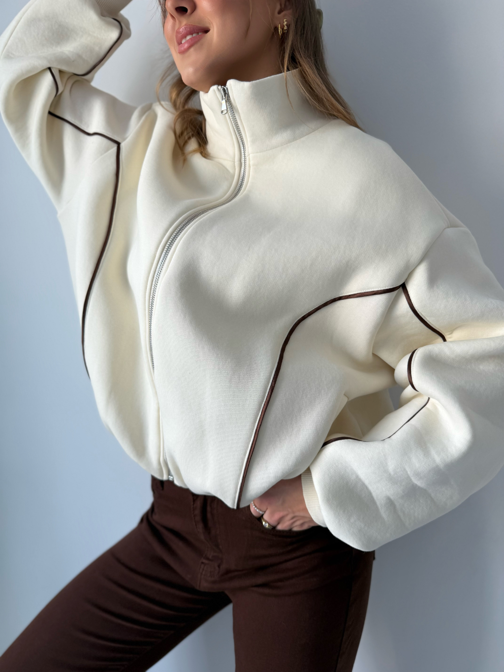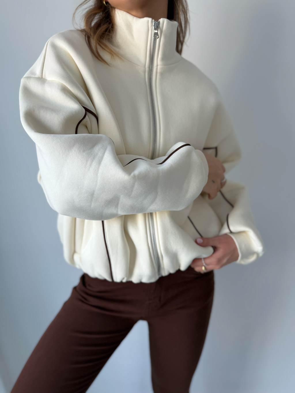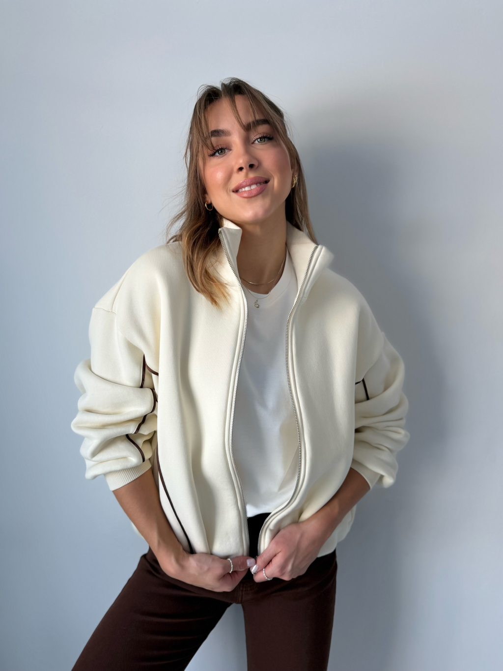 Stylový mikinový bomber se stojacím límcem. Díky designovému pruhu přes rukáv až k pasu má bomber sportovně-elegantní vzhled. Zapínání na zip, guma ve spodním lemu a dvě kapsy pro praktické využití.