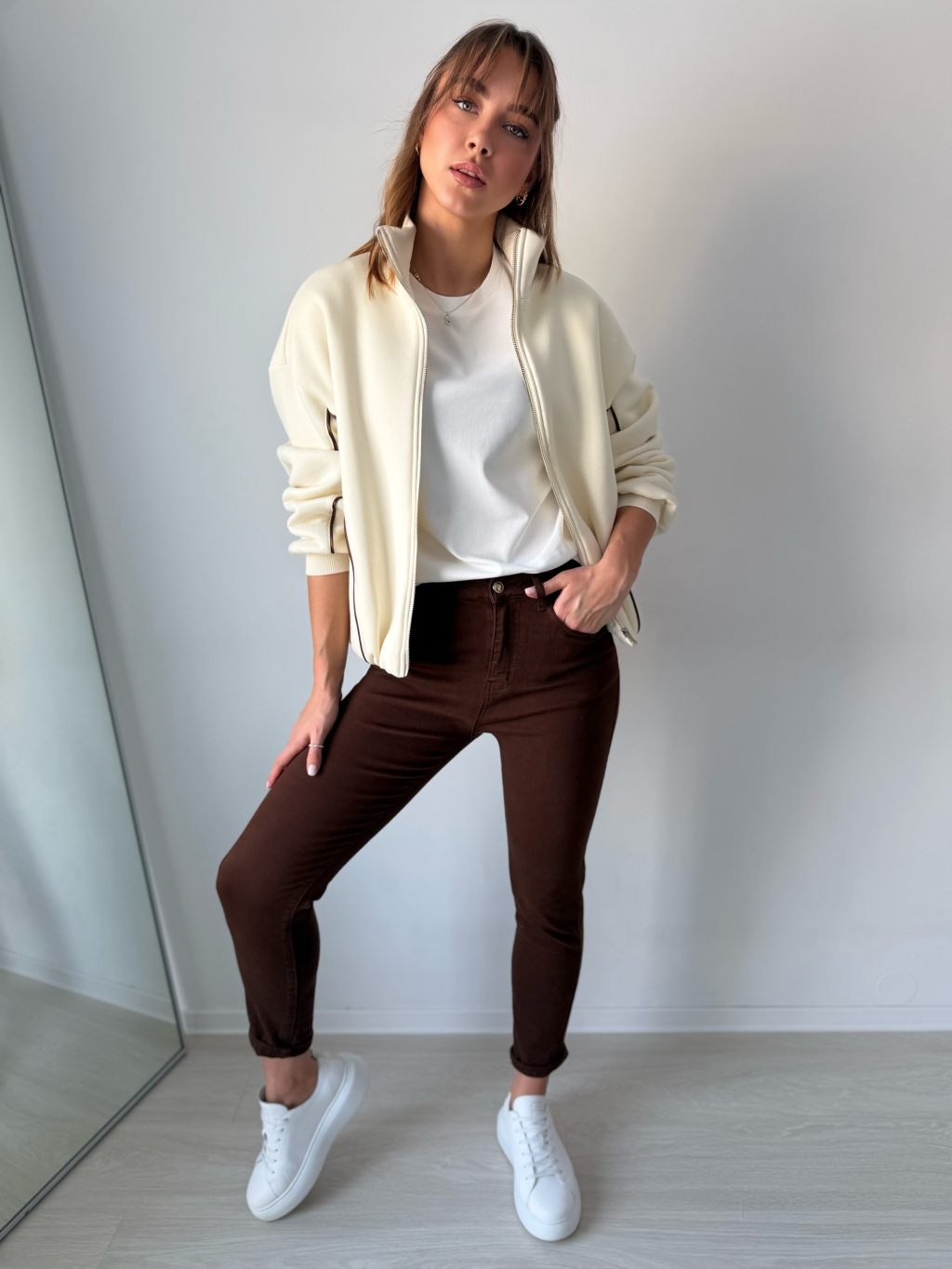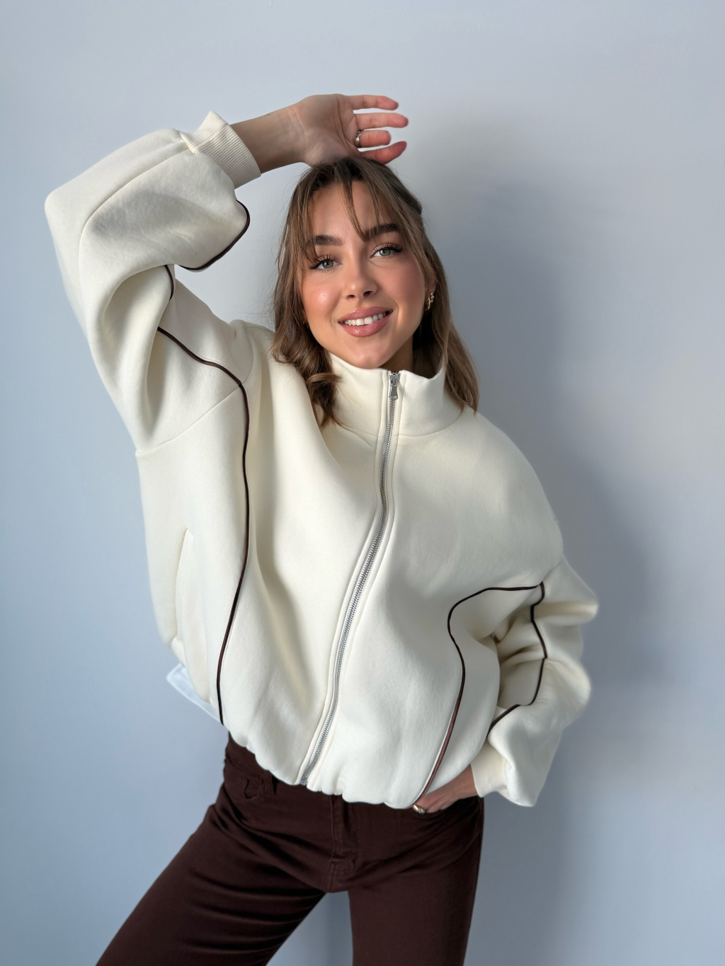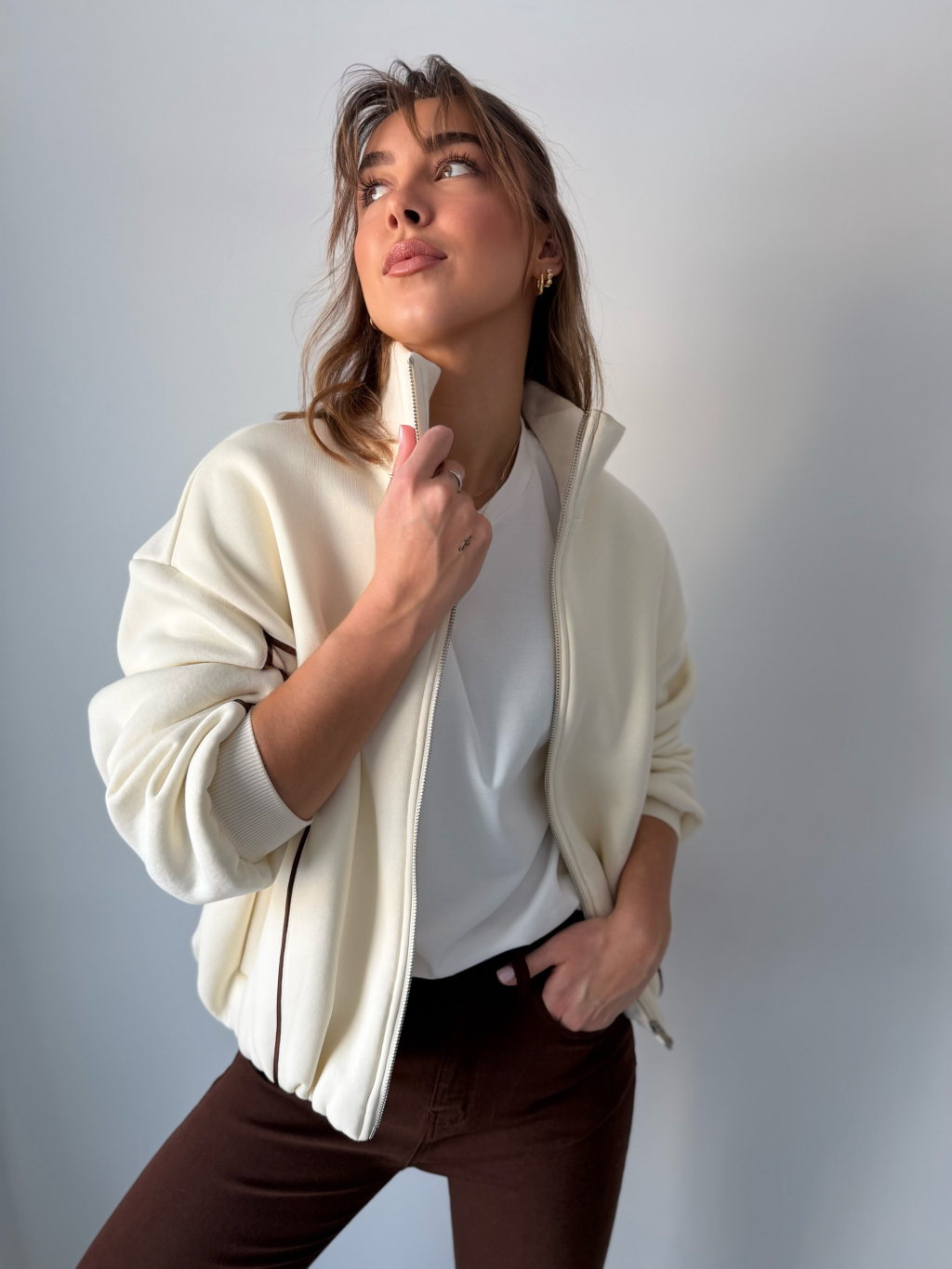 Stylový mikinový bomber se stojacím límcem. Díky designovému pruhu přes rukáv až k pasu má bomber sportovně-elegantní vzhled. Zapínání na zip, guma ve spodním lemu a dvě kapsy pro praktické využití.
