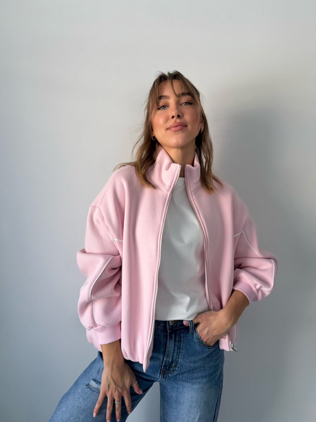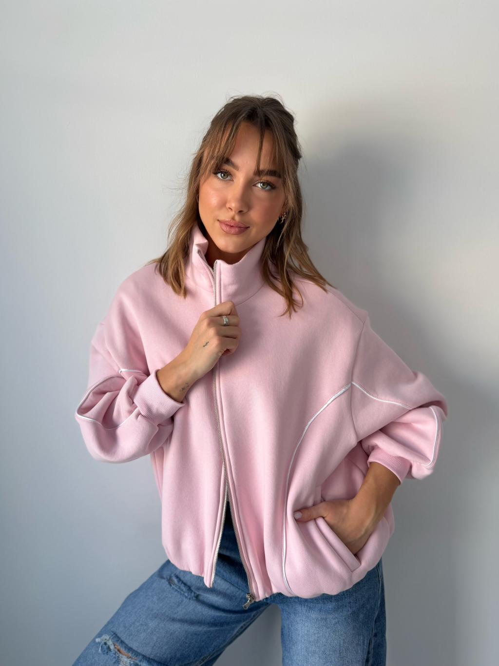 Stylový mikinový bomber se stojacím límcem. Díky designovému pruhu přes rukáv až k pasu má bomber sportovně-elegantní vzhled. Zapínání na zip, guma ve spodním lemu a dvě kapsy pro praktické využití.
