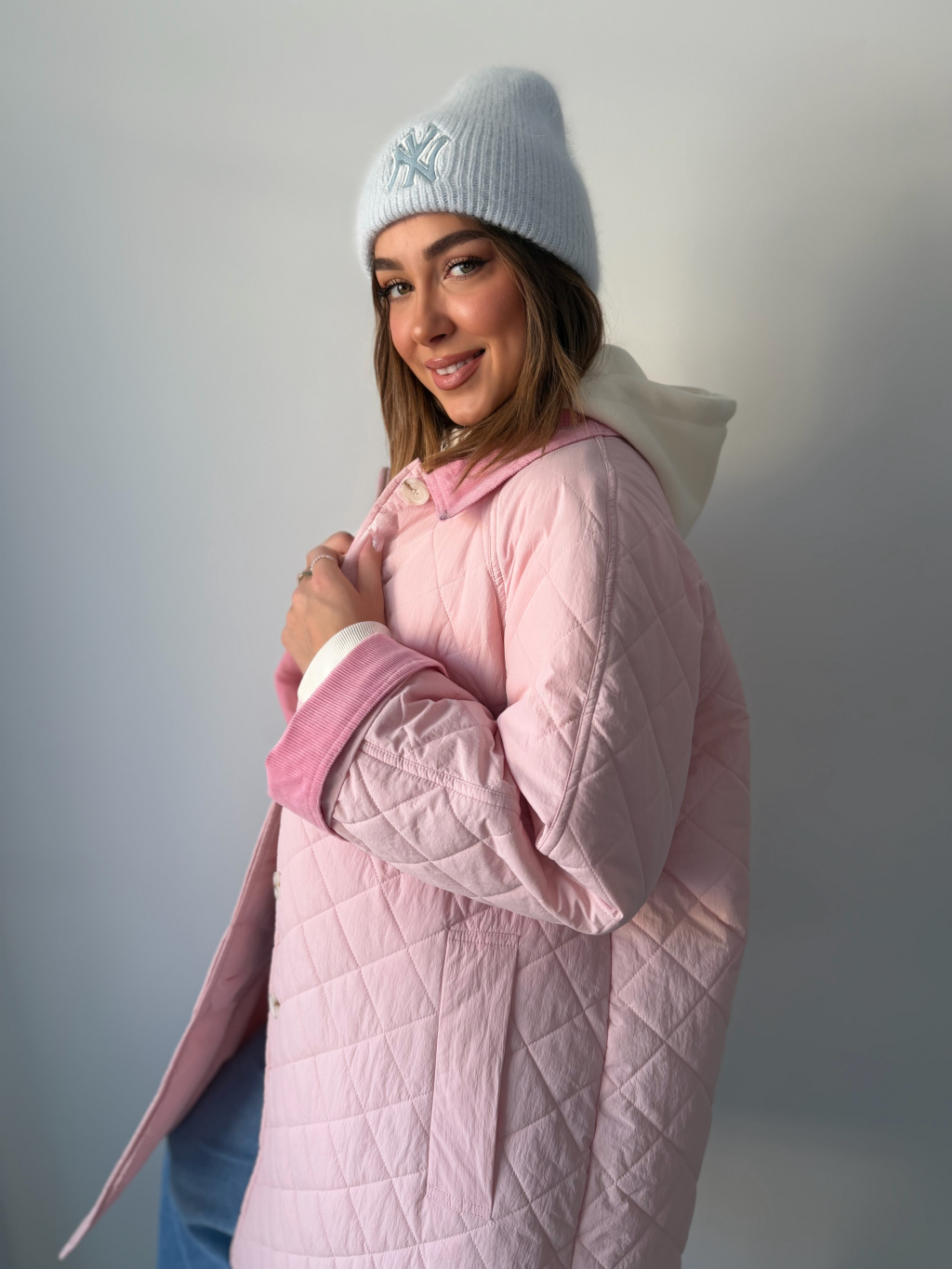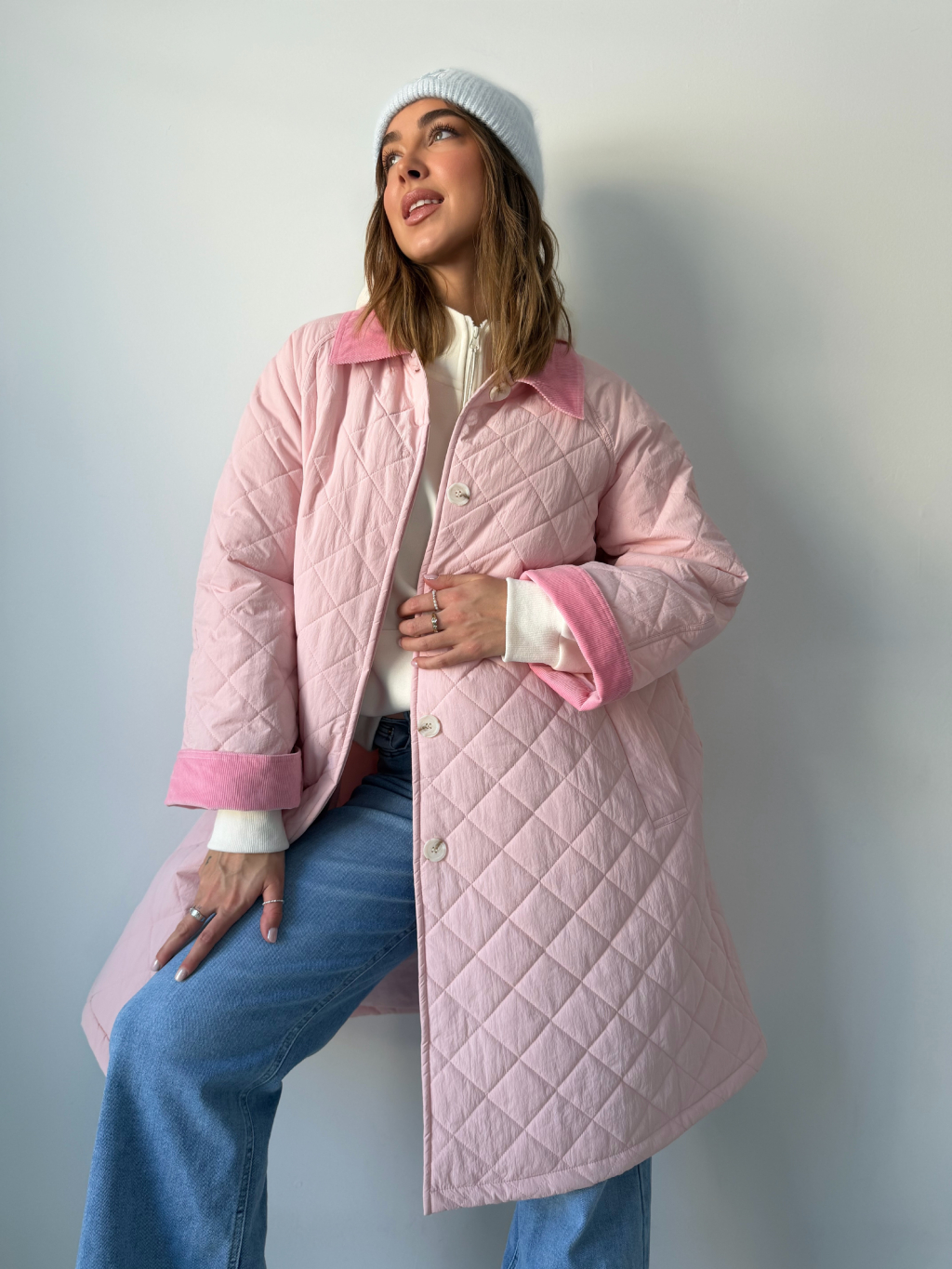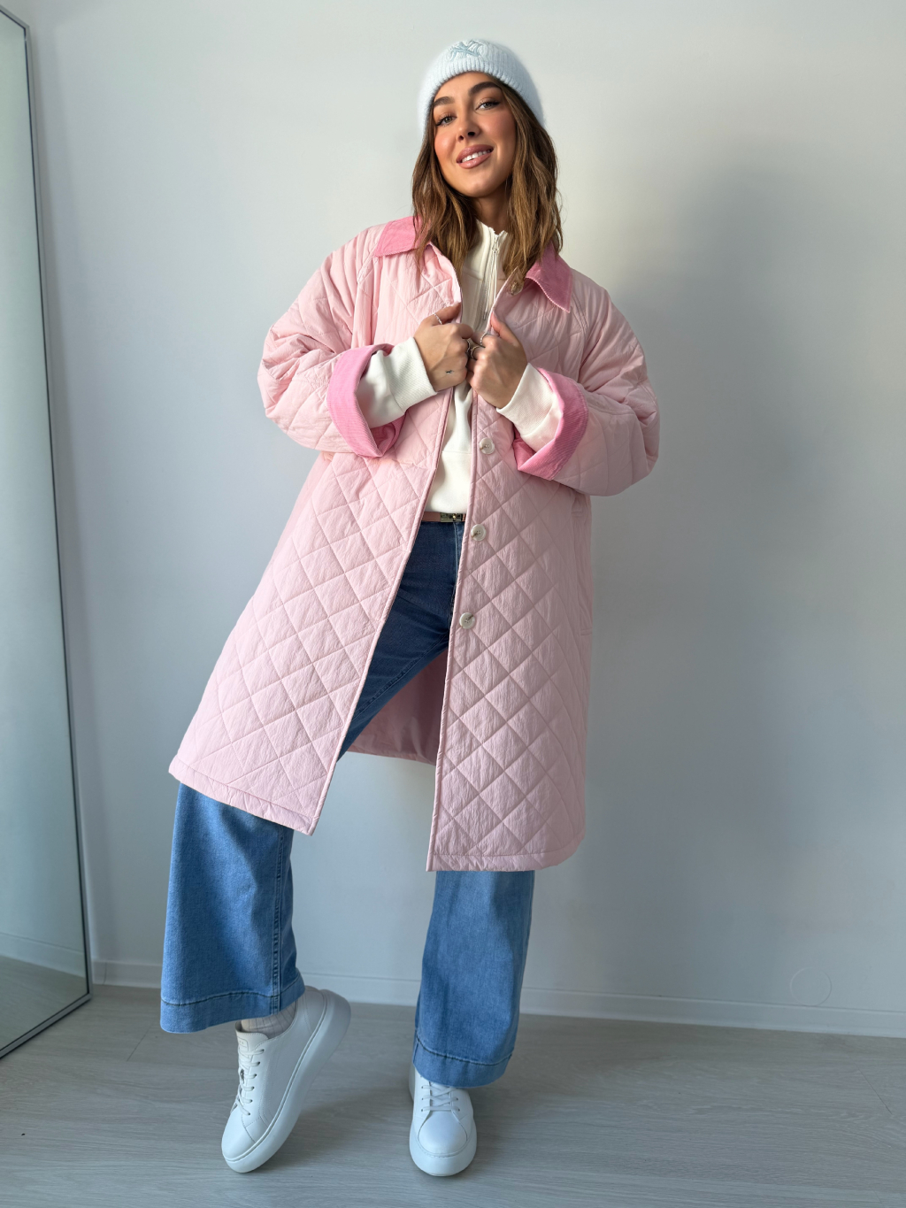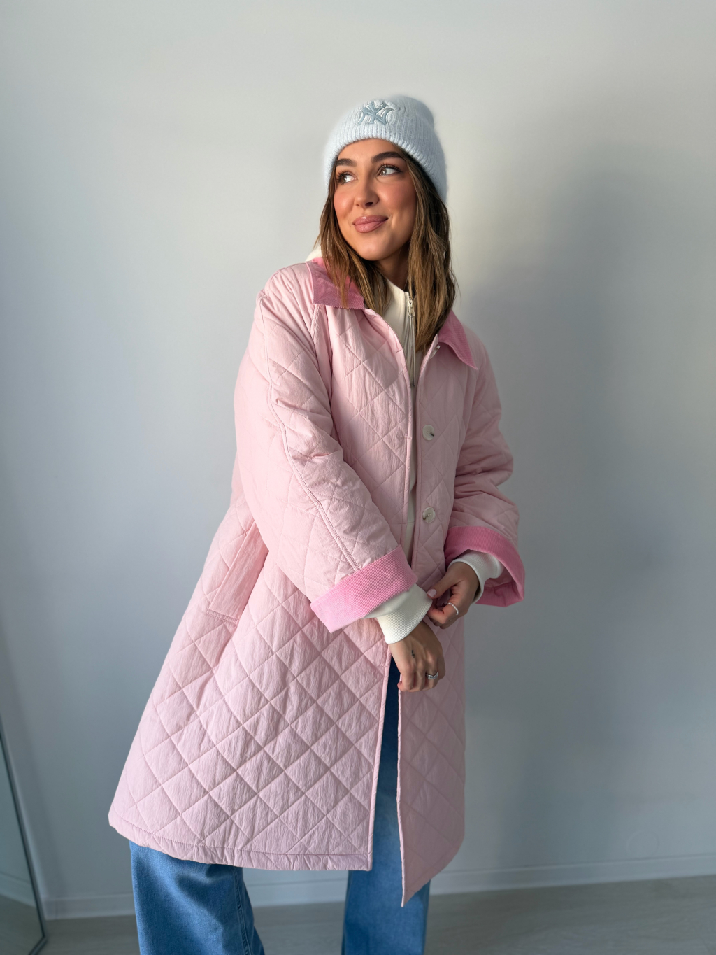 Stylová oversize dlouhá prošívaná bunda se zapínáním na knoflíky. Dvě praktické kapsy. Manšestrové ohnuté kraje na rukávech a límečku dodávají bundě výrazný detail.