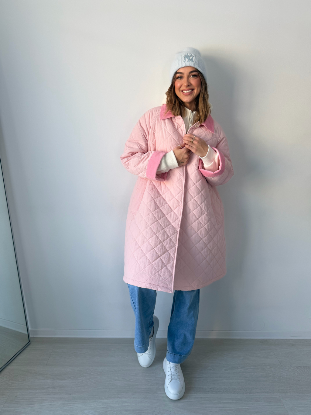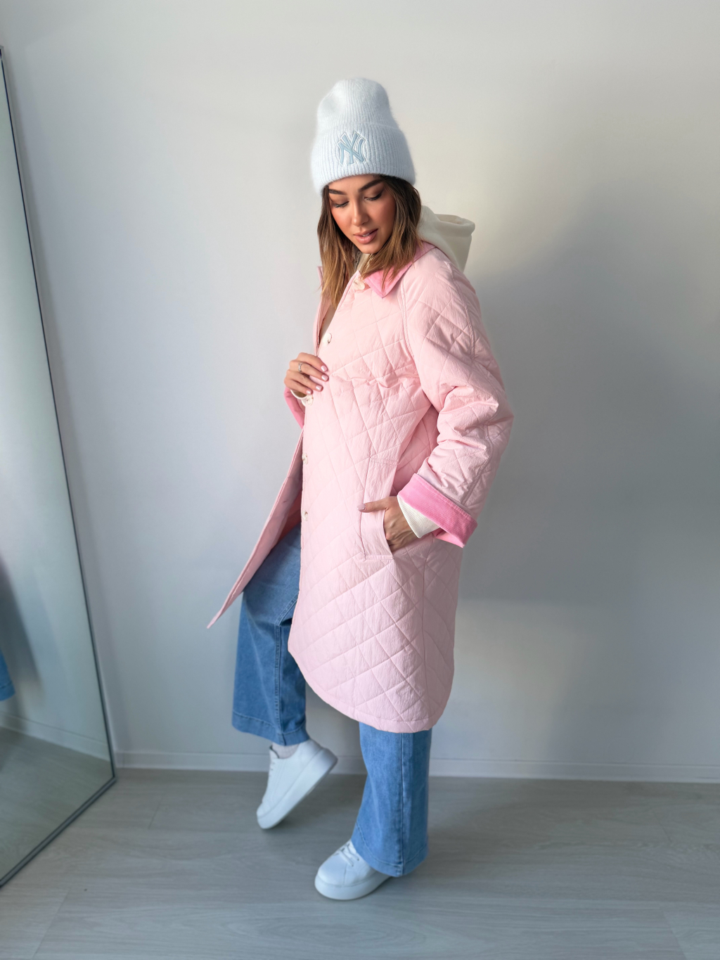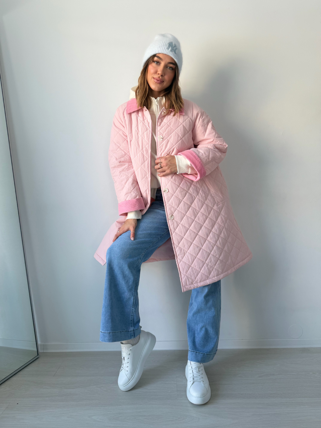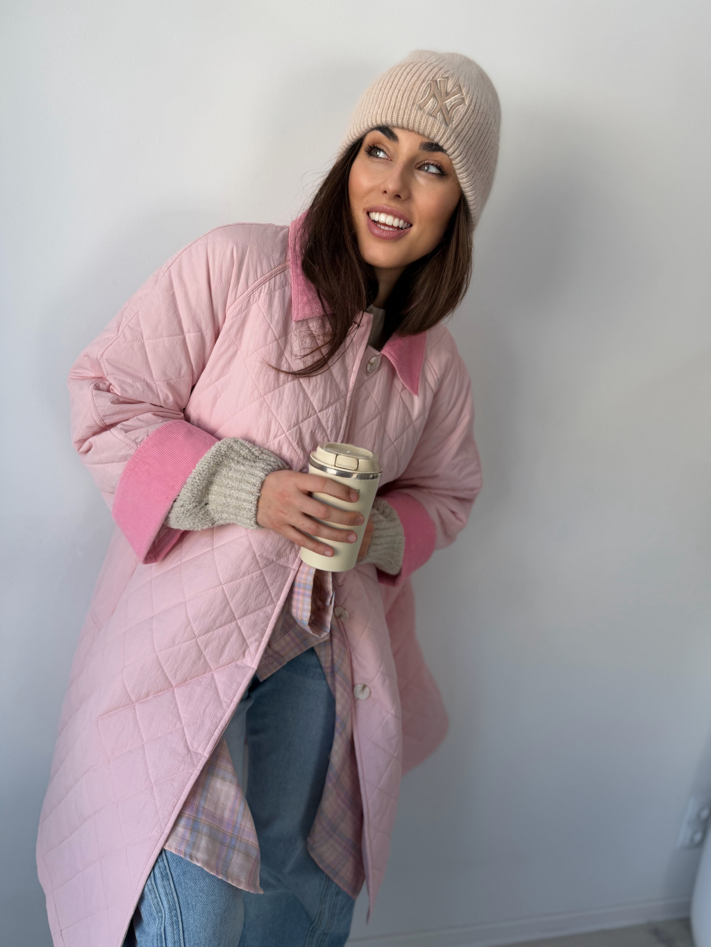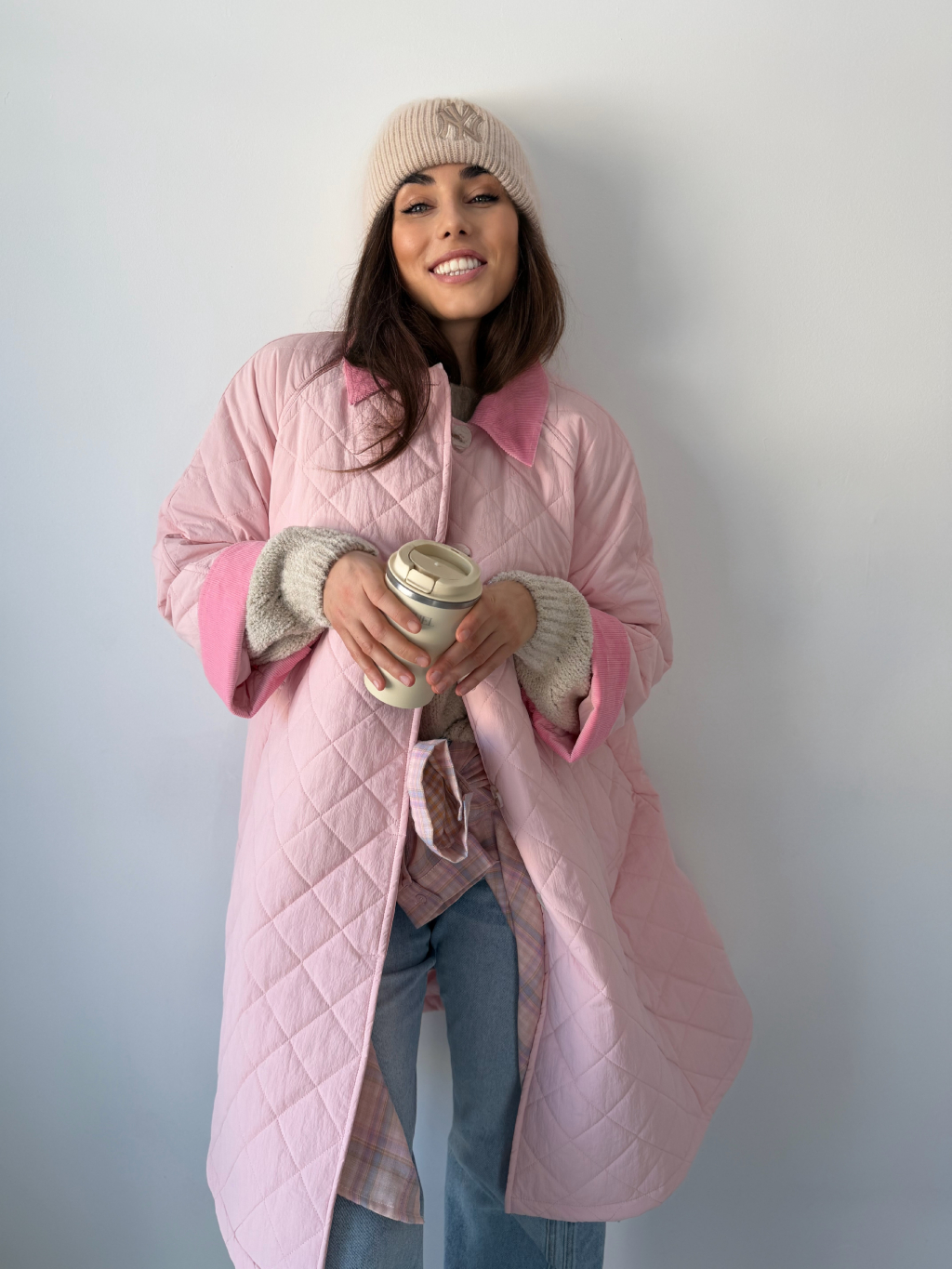 Stylová oversize dlouhá prošívaná bunda se zapínáním na knoflíky. Dvě praktické kapsy. Manšestrové ohnuté kraje na rukávech a límečku dodávají bundě výrazný detail.