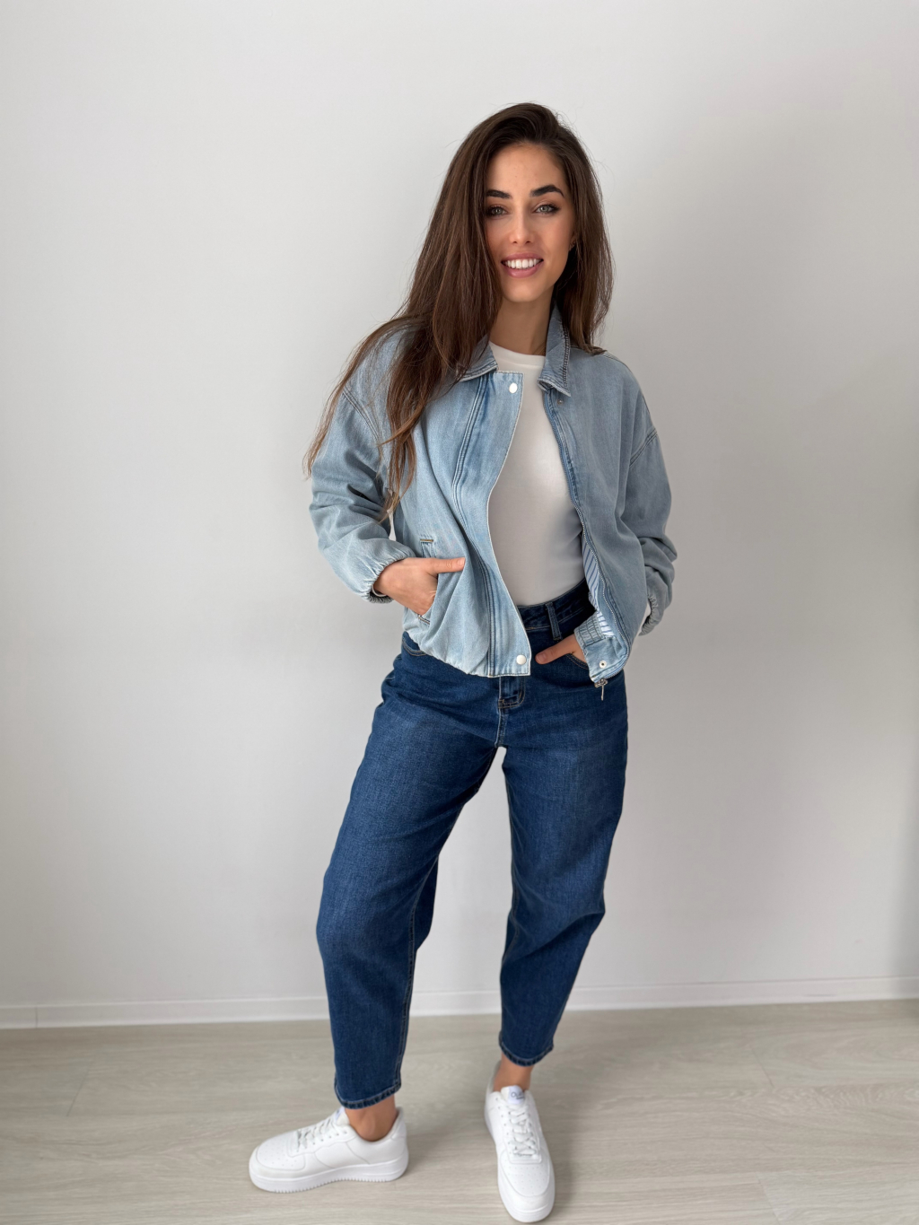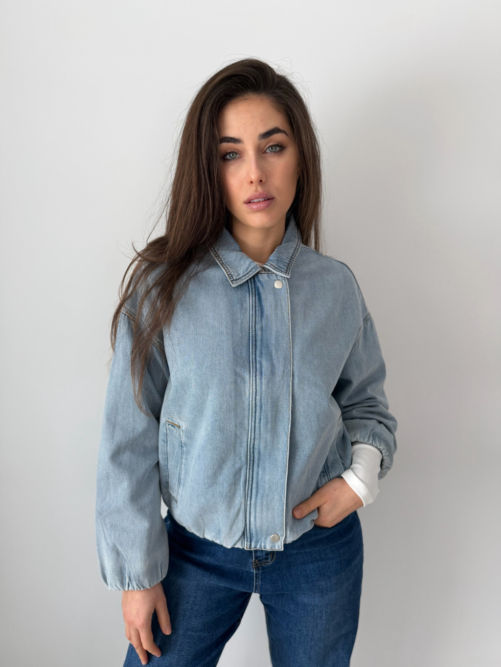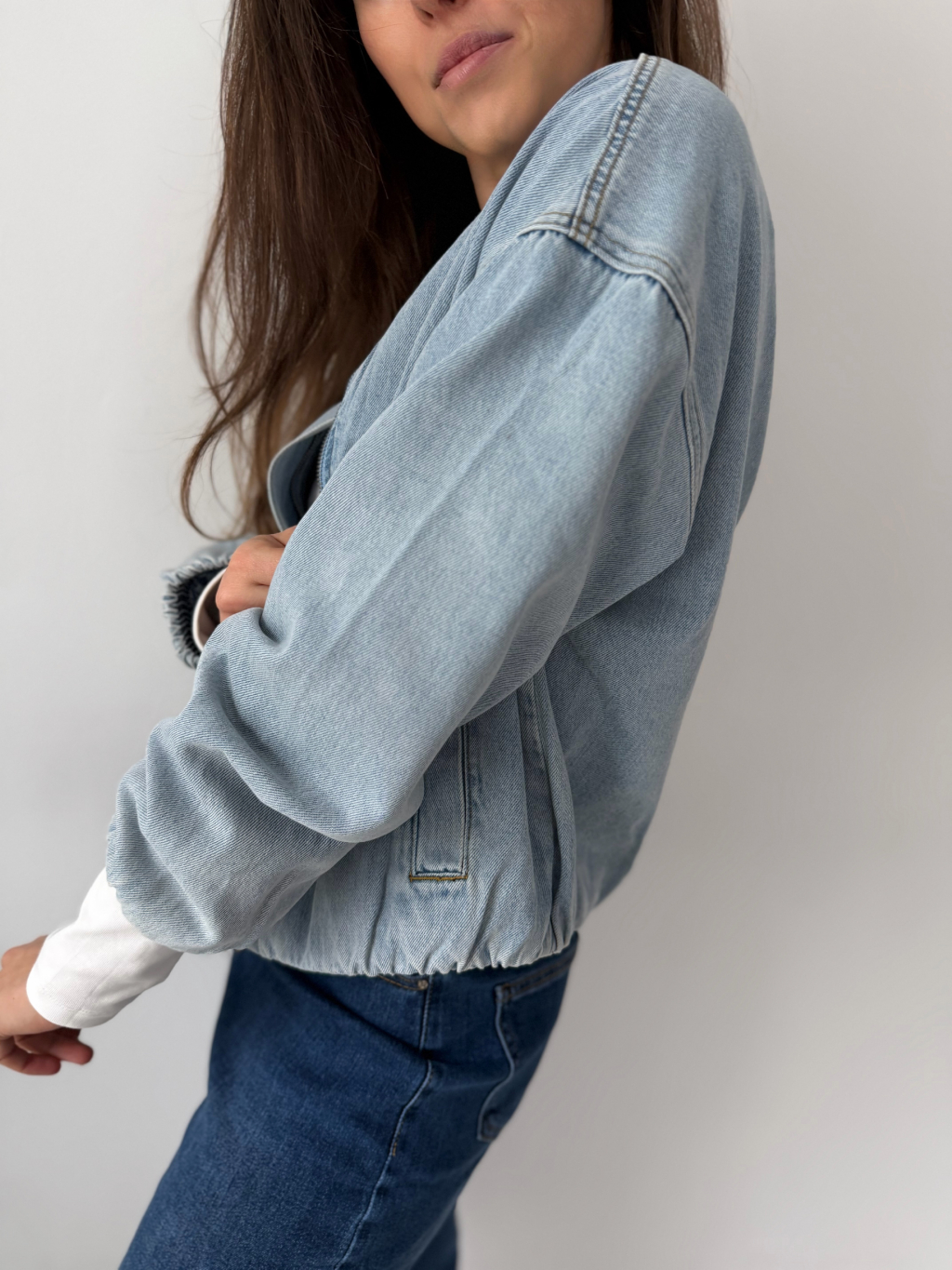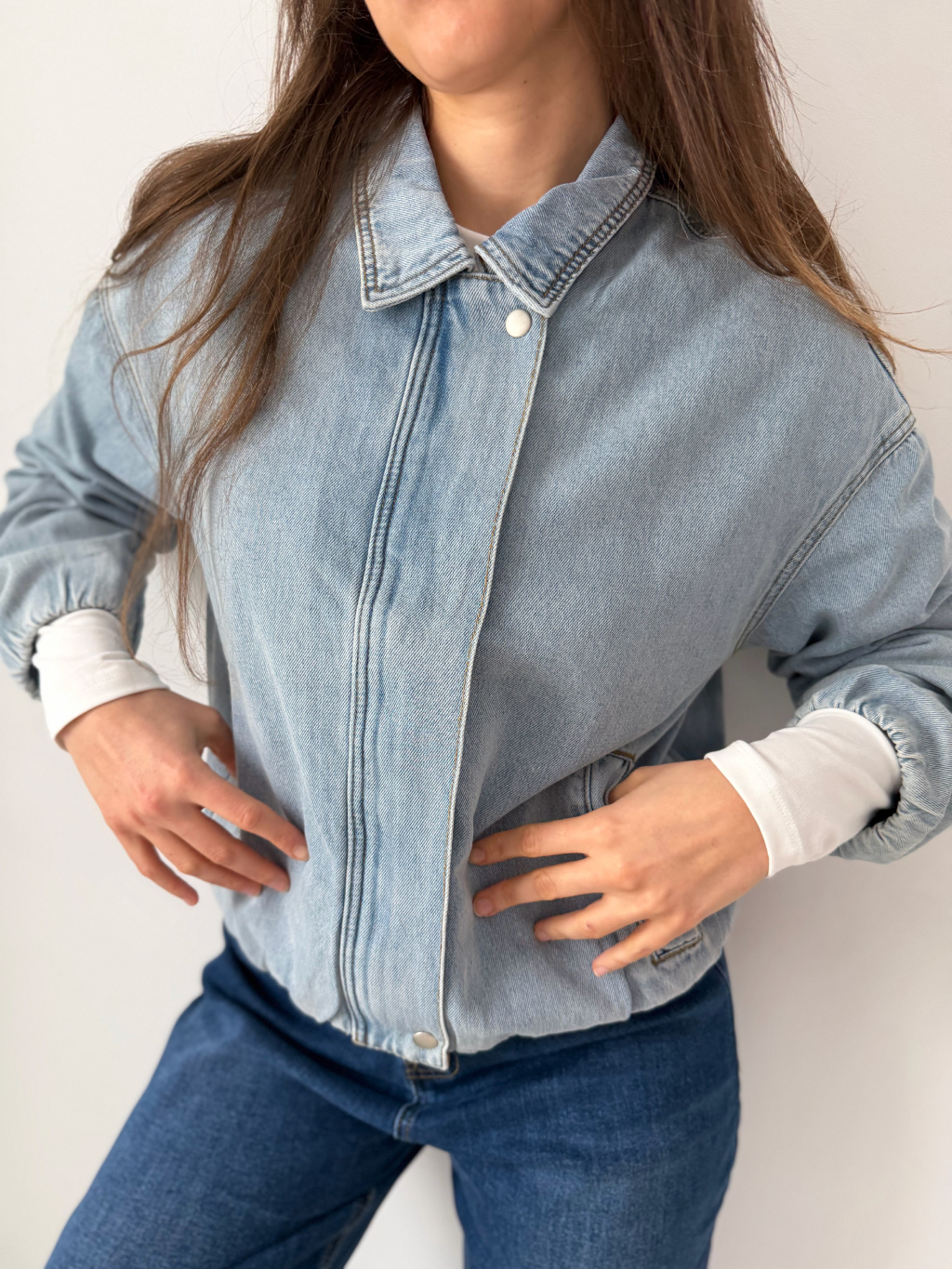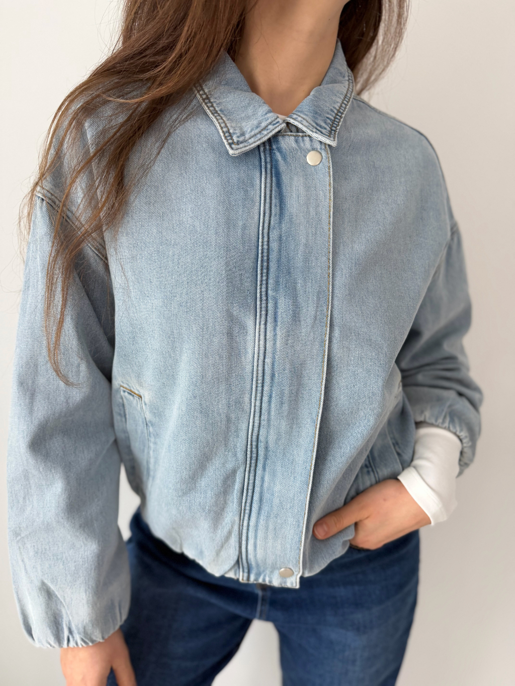 Riflová bunda s gumou dole. Zapínání na zip, který je překrytý. Dvě praktické kapsy.