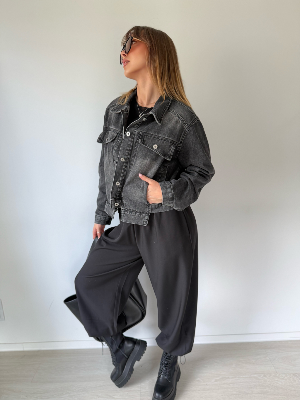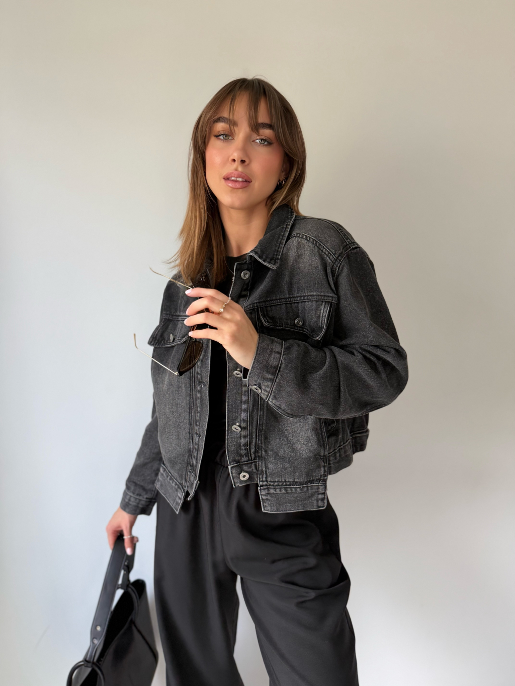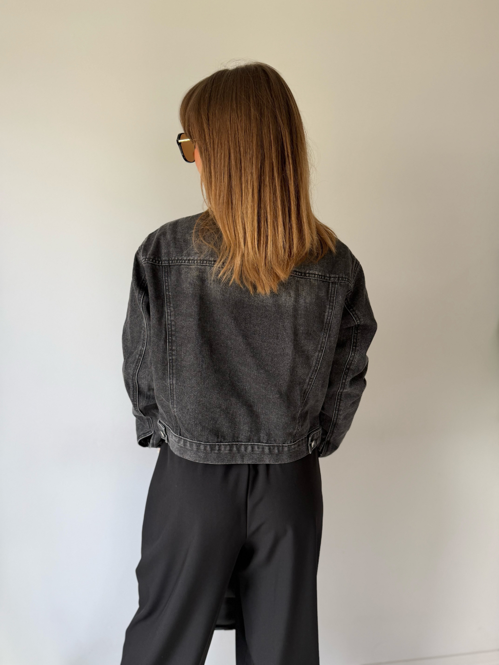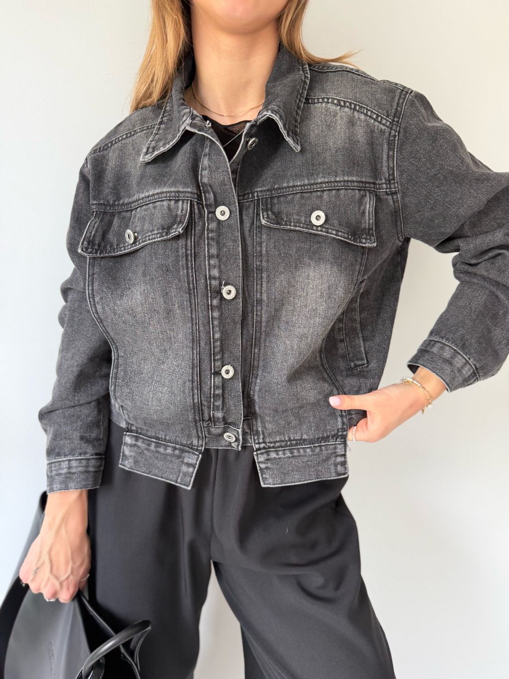 Krátká černá riflová bundička. Dvě falešné náprsní kapsy, které jsou protaženy přes lem bundy. Dvě kapsy po stranách.