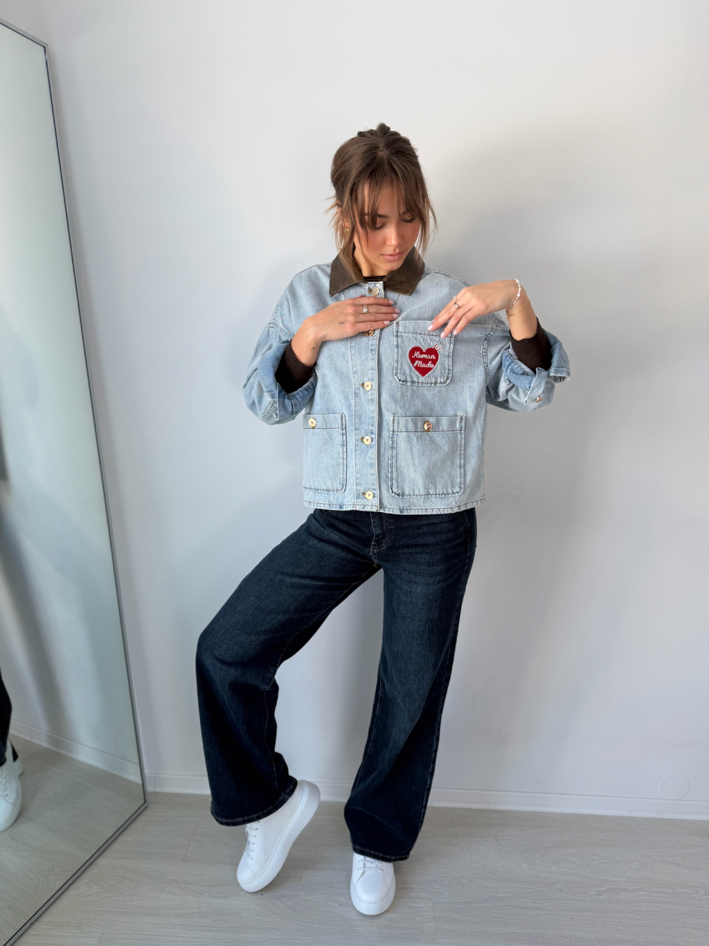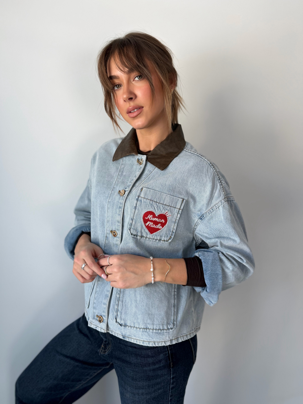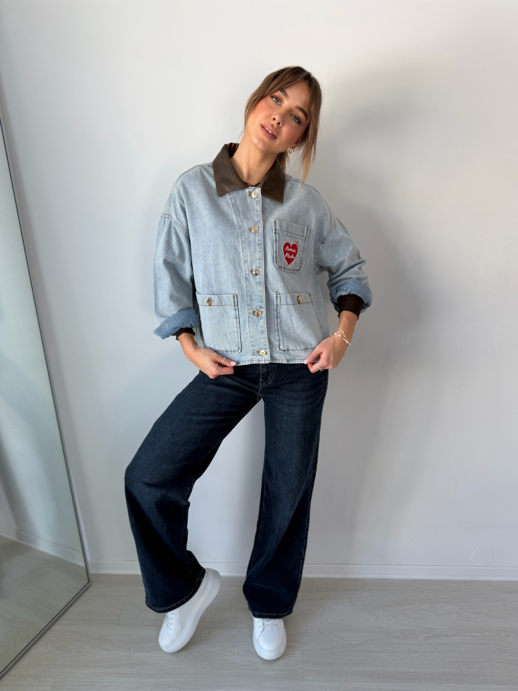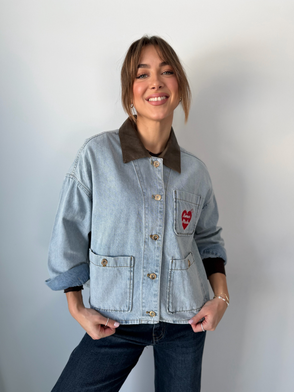 Volná riflová bunda se srdcem na náprsní kapse. Decentní koženkový límeček. Zapínání na knoflíky. Dvě kapsy na knoflík.