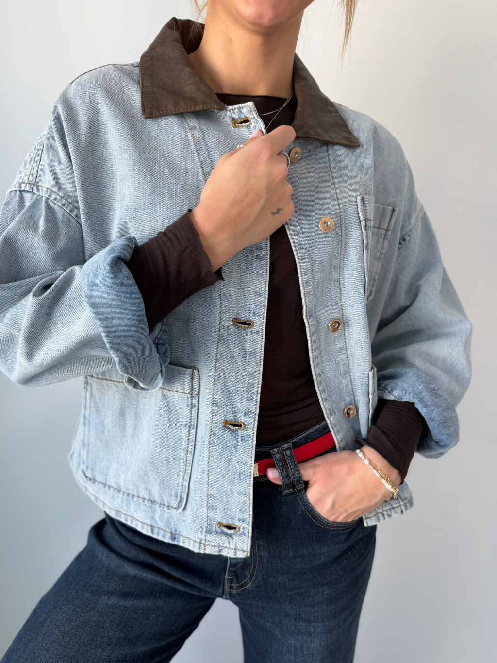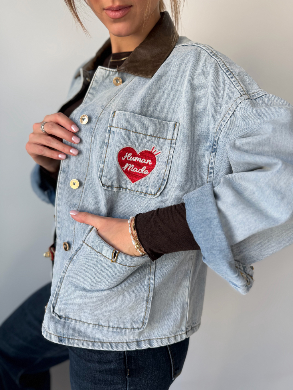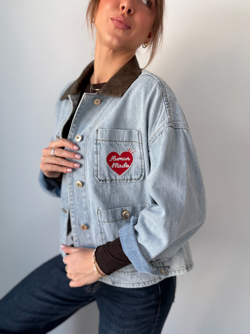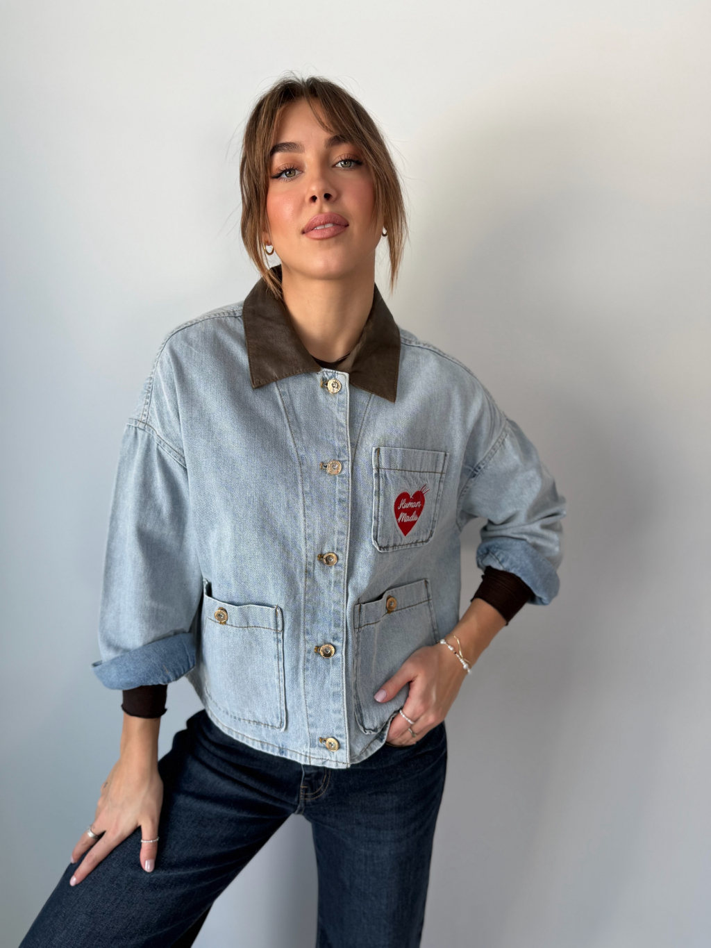 Volná riflová bunda se srdcem na náprsní kapse. Decentní koženkový límeček. Zapínání na knoflíky. Dvě kapsy na knoflík.
