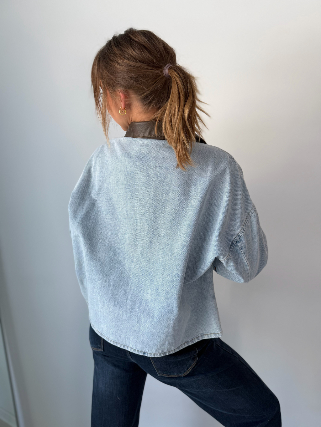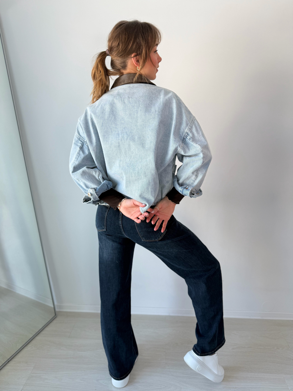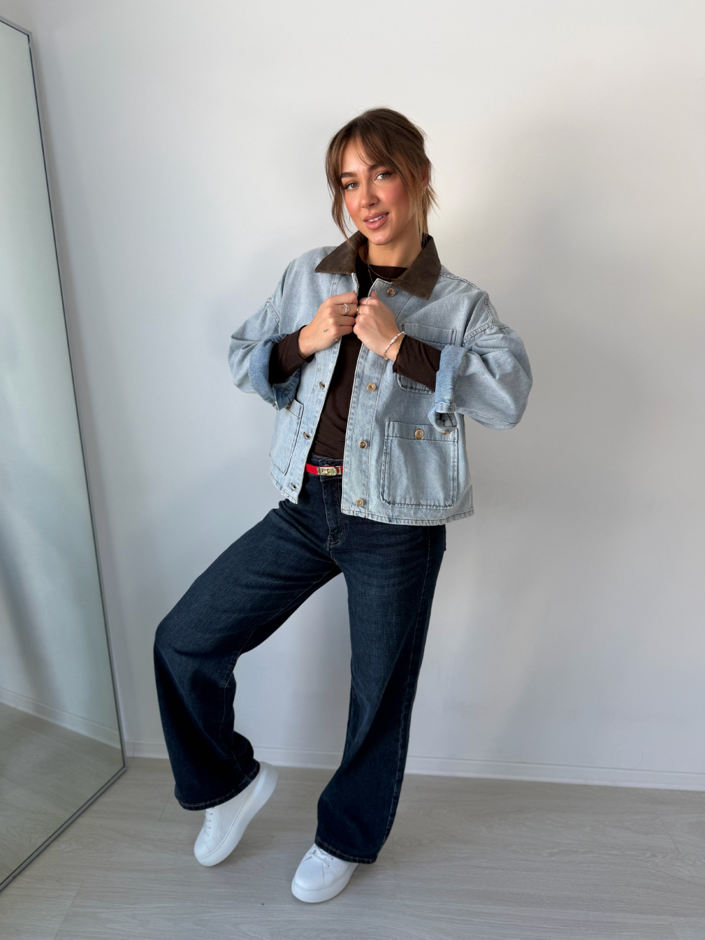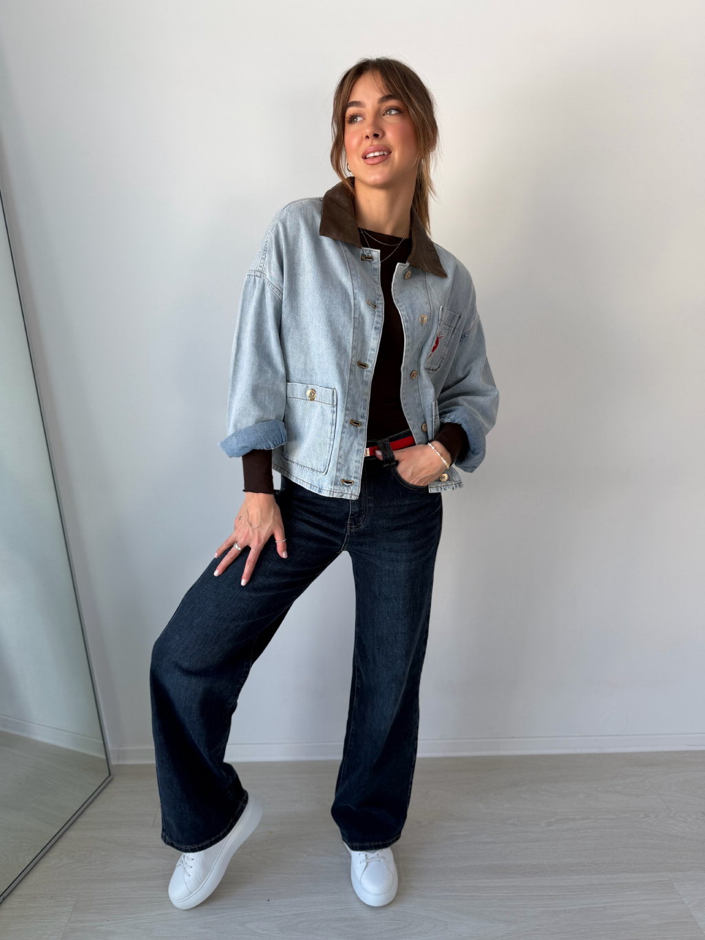 Volná riflová bunda se srdcem na náprsní kapse. Decentní koženkový límeček. Zapínání na knoflíky. Dvě kapsy na knoflík.