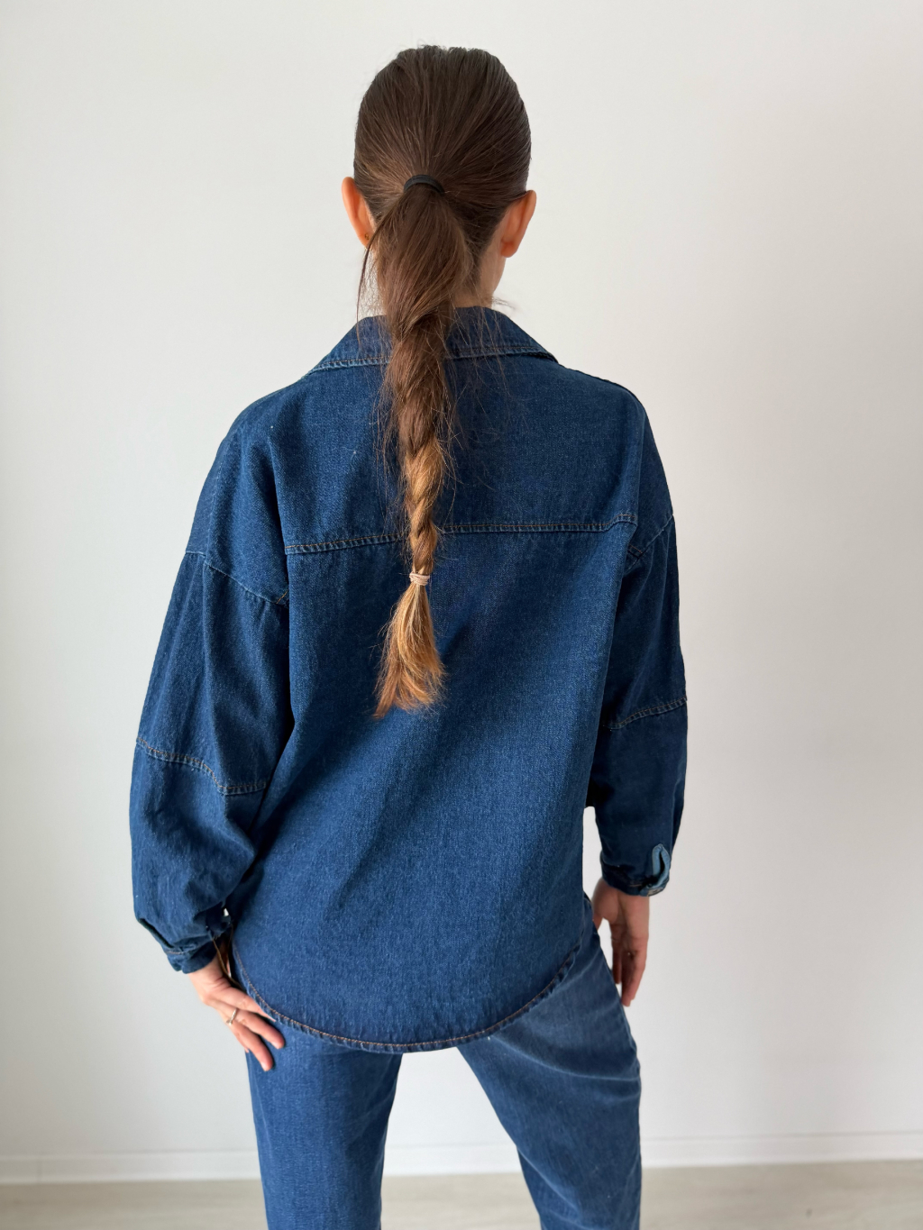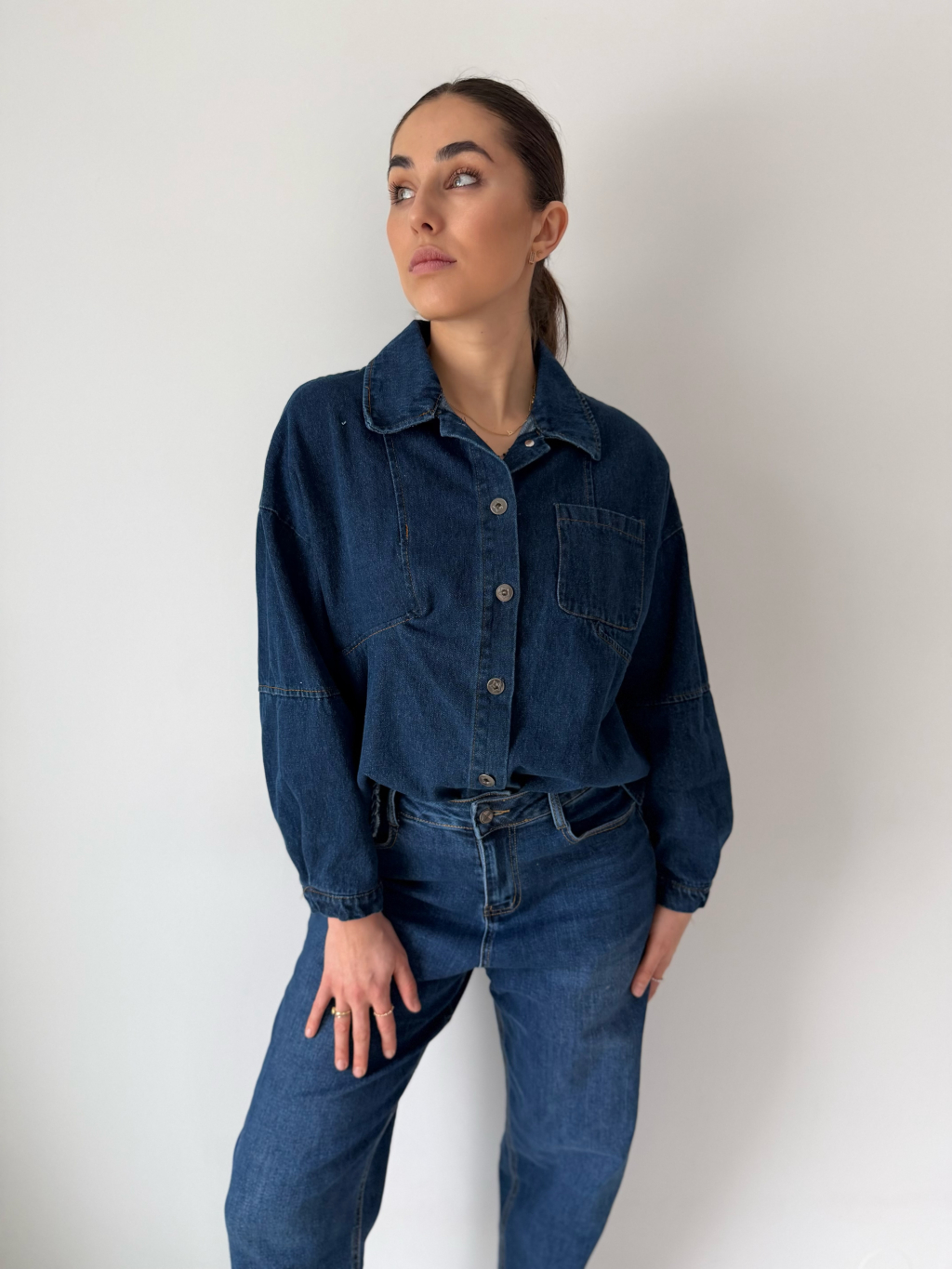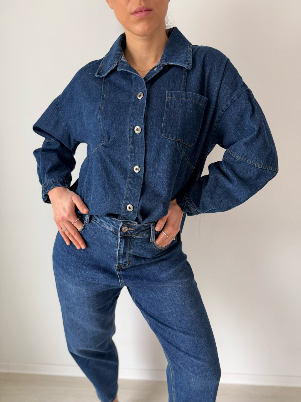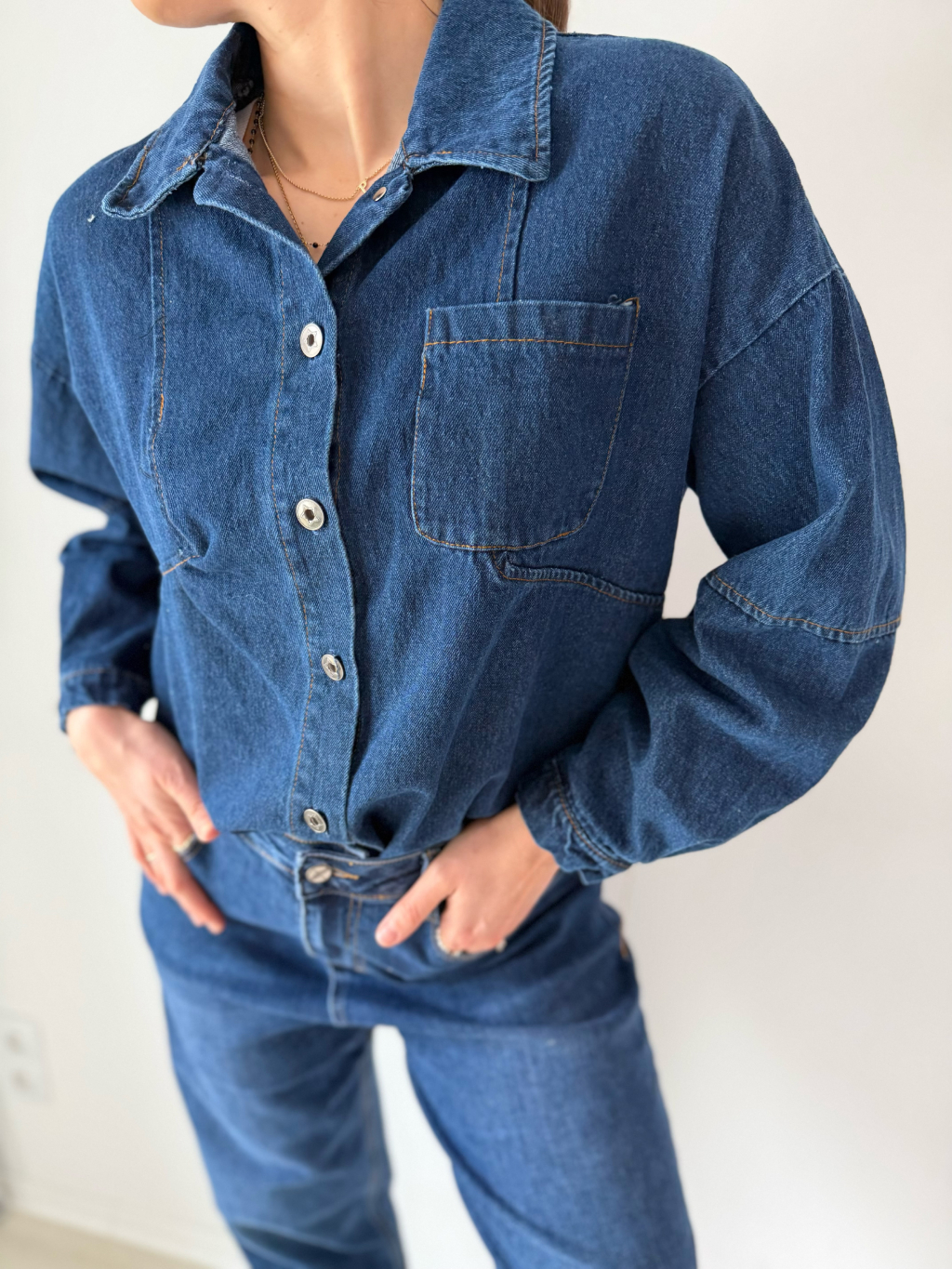 Košile z lehké džínoviny. Zapínání na knoflíky. Jedna náprsní kapsa. Přes prsa prošití ve tvaru L.