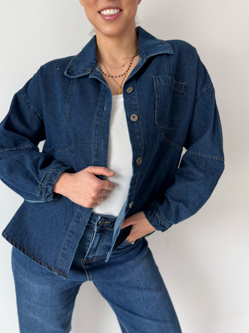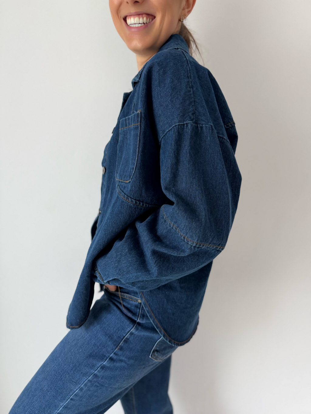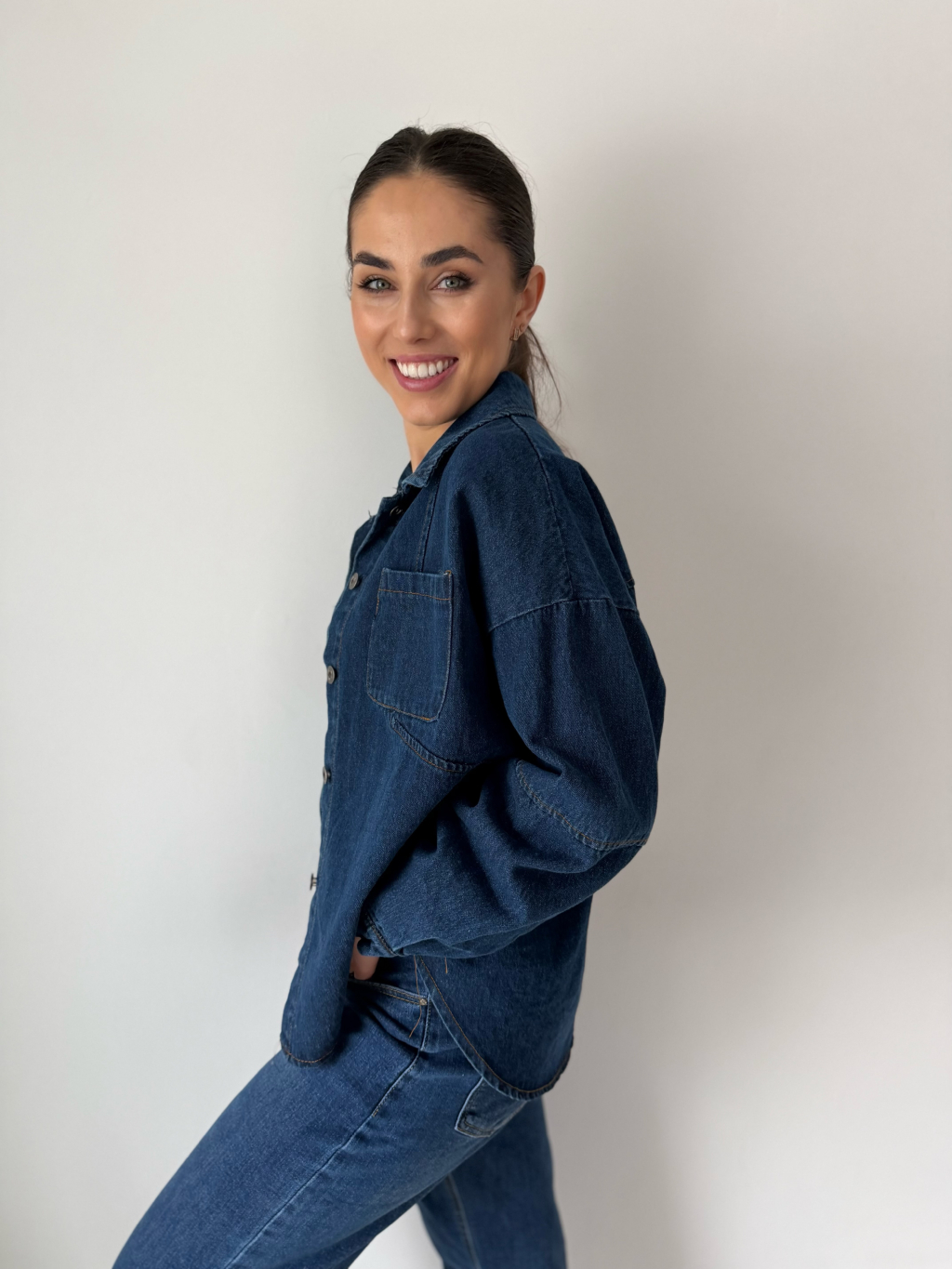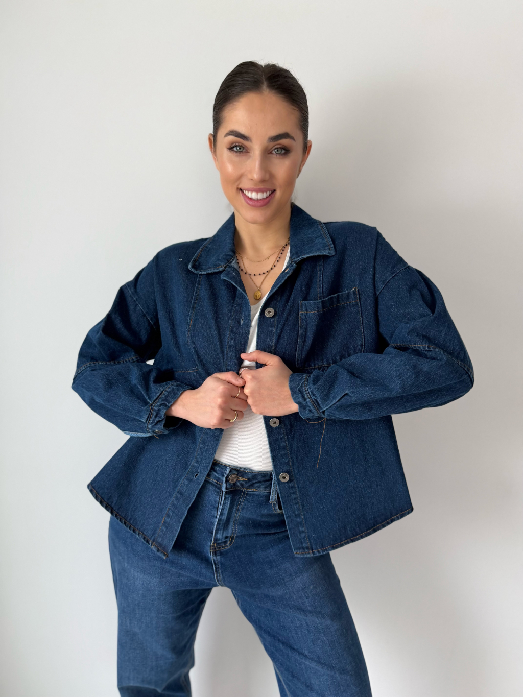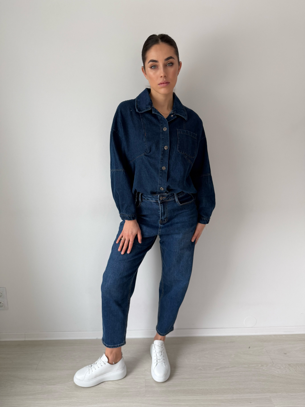Košile z lehké džínoviny. Zapínání na knoflíky. Jedna náprsní kapsa. Přes prsa prošití ve tvaru L.