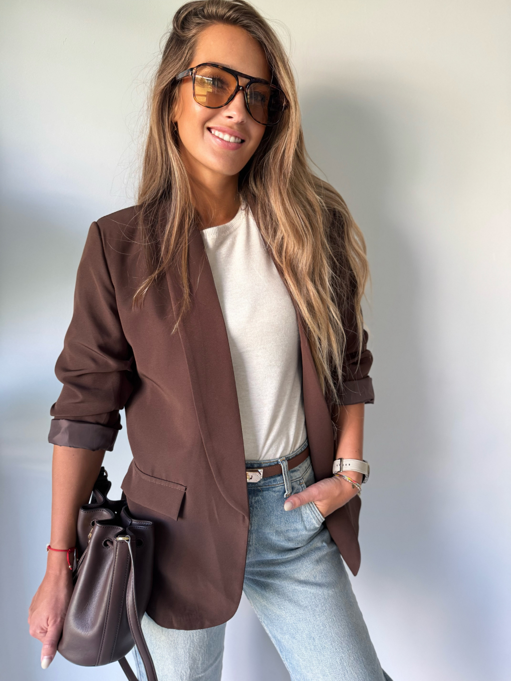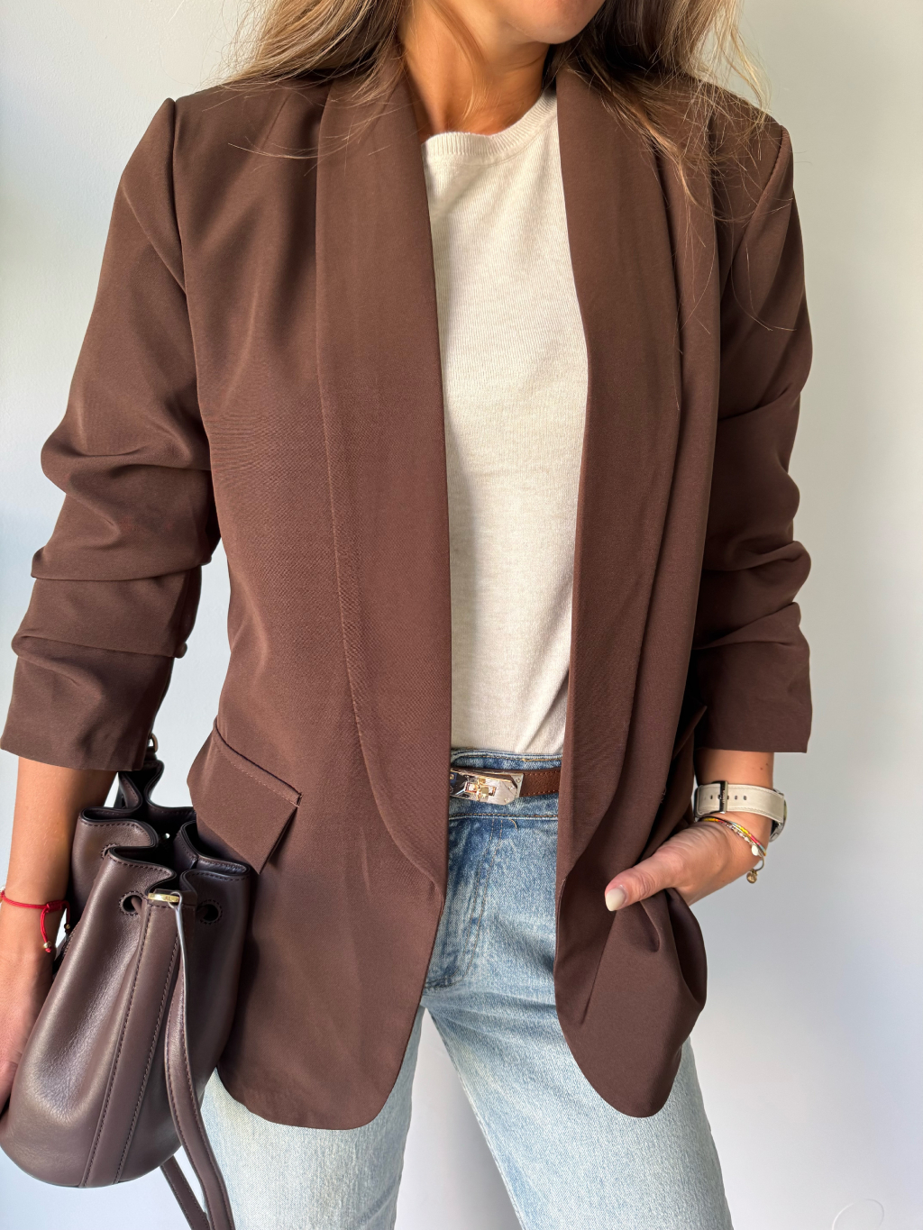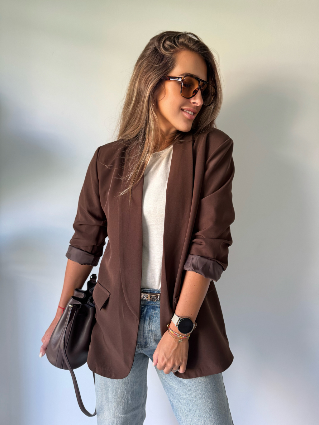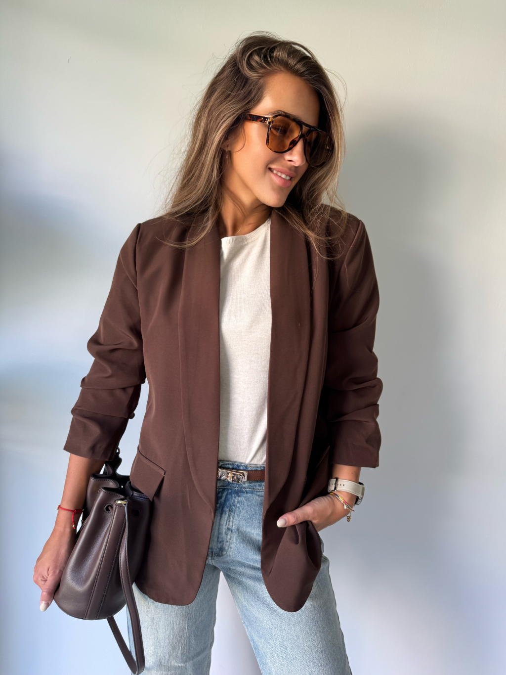Jednoduché sako bez zapínání. Sako má nařasené rukávy, které lze nosit i ohrnuté.