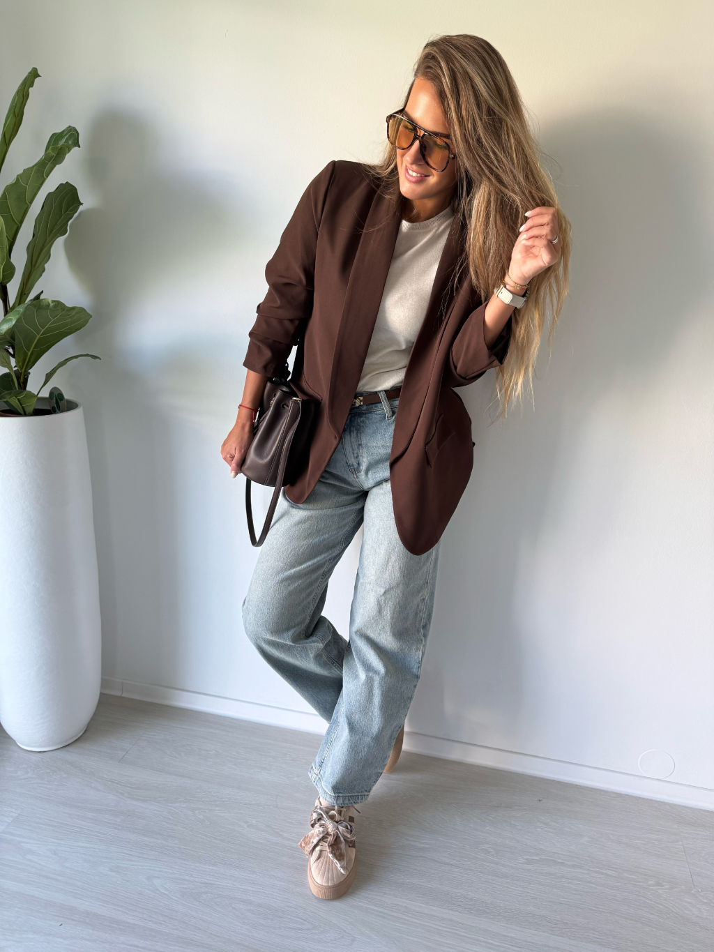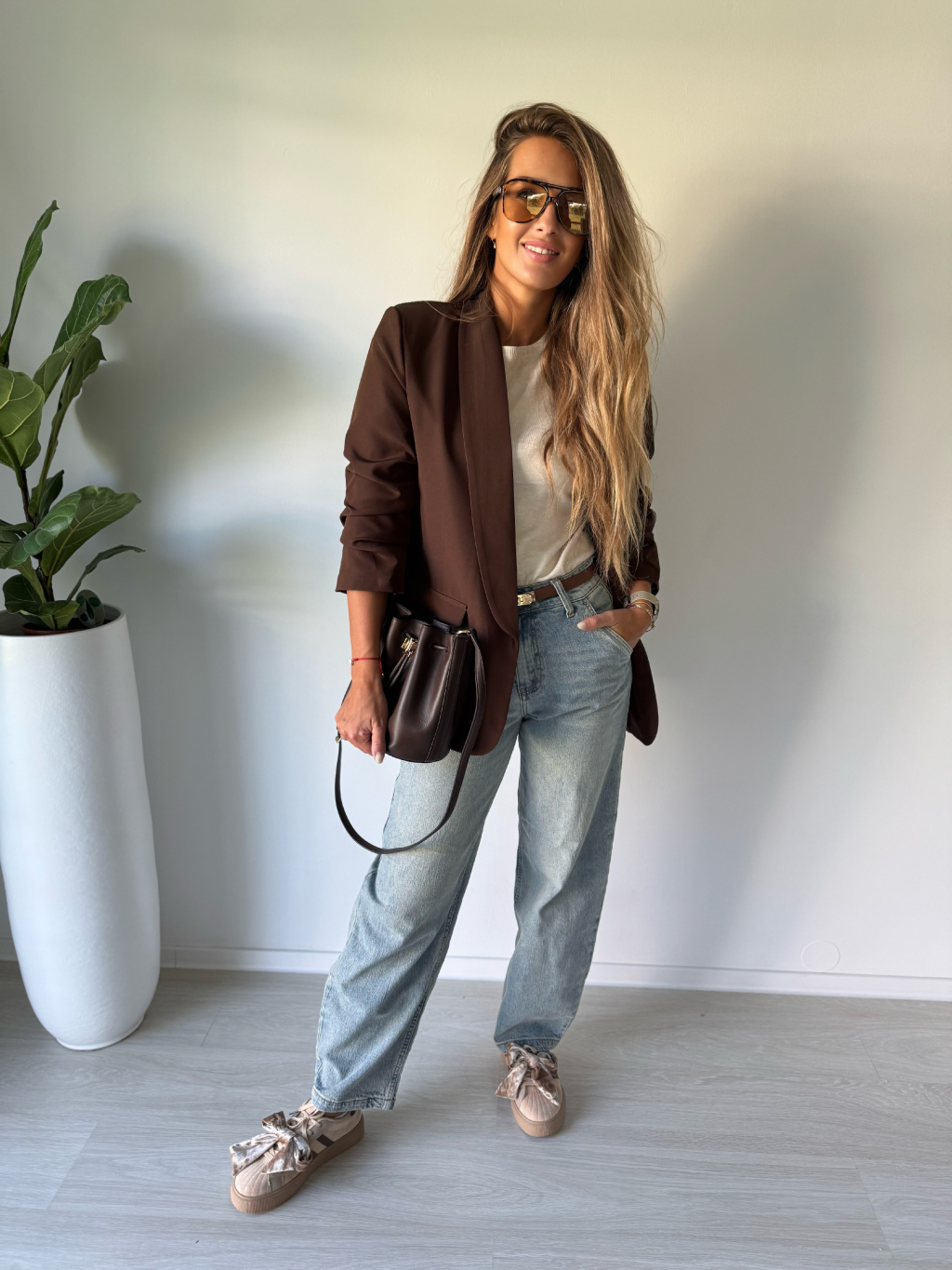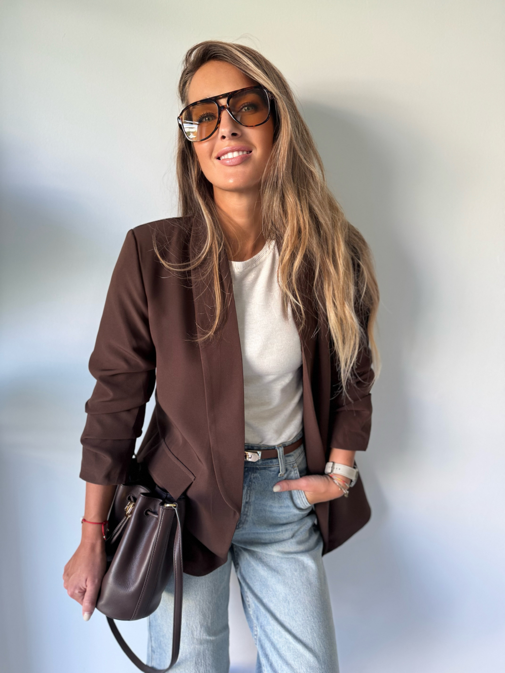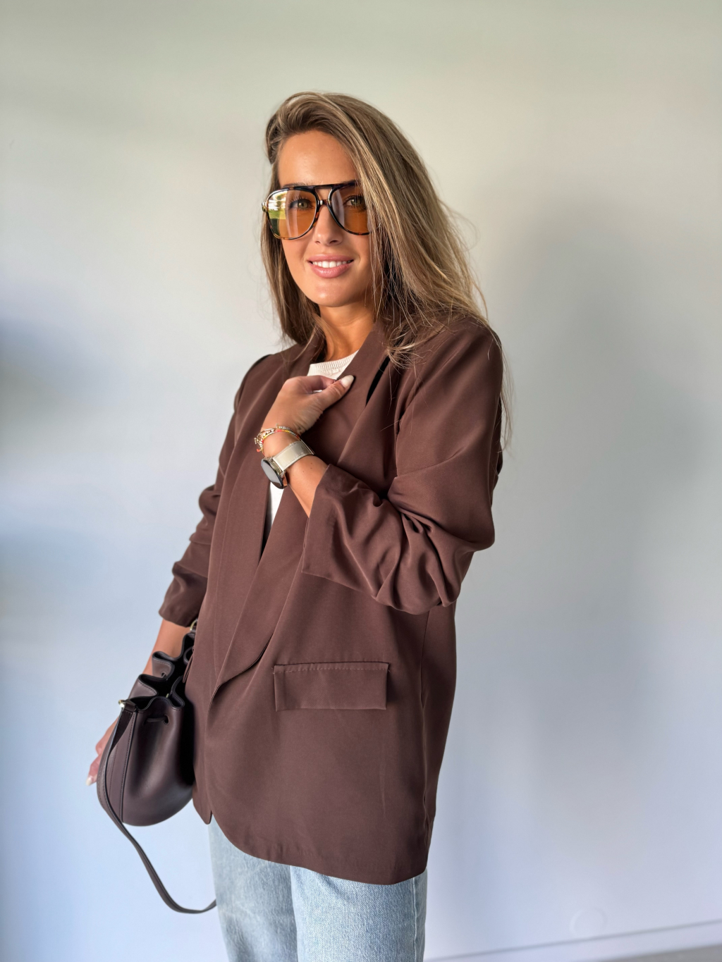Jednoduché sako bez zapínání. Sako má nařasené rukávy, které lze nosit i ohrnuté.