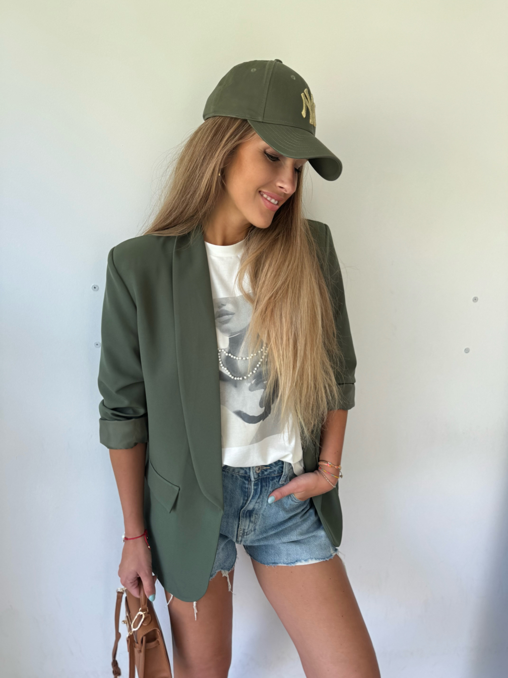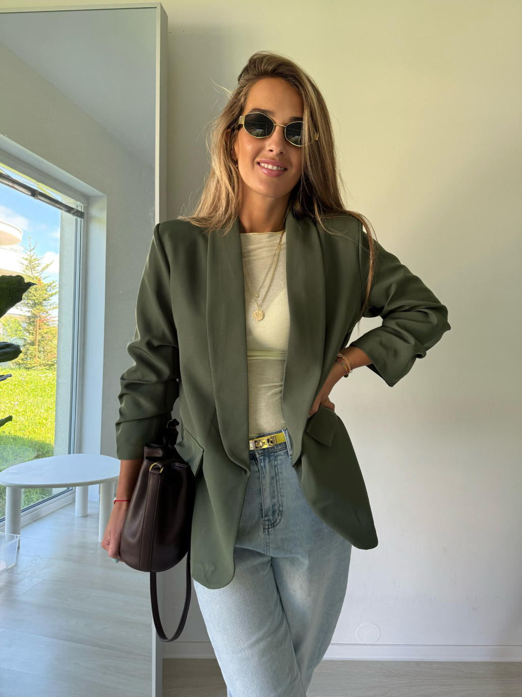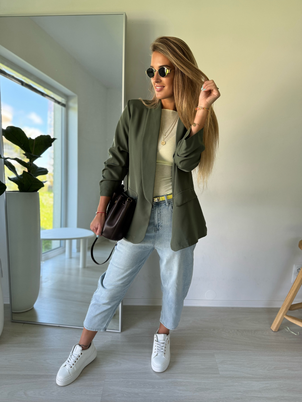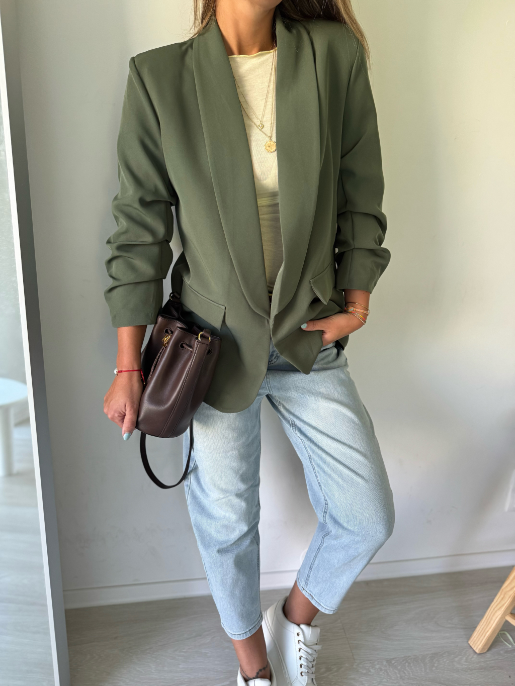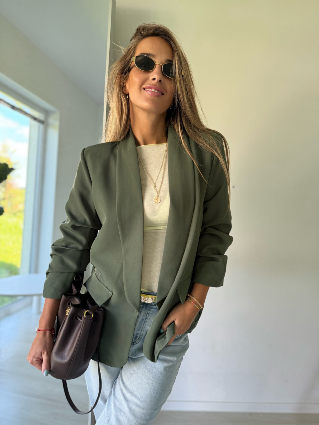 Jednoduché sako bez zapínání. Sako má nařasené rukávy, které lze nosit i ohrnuté.