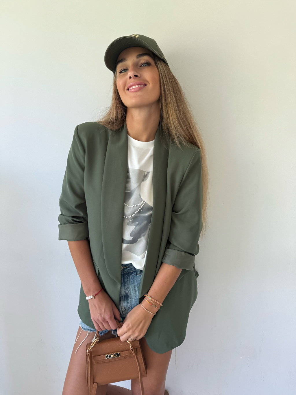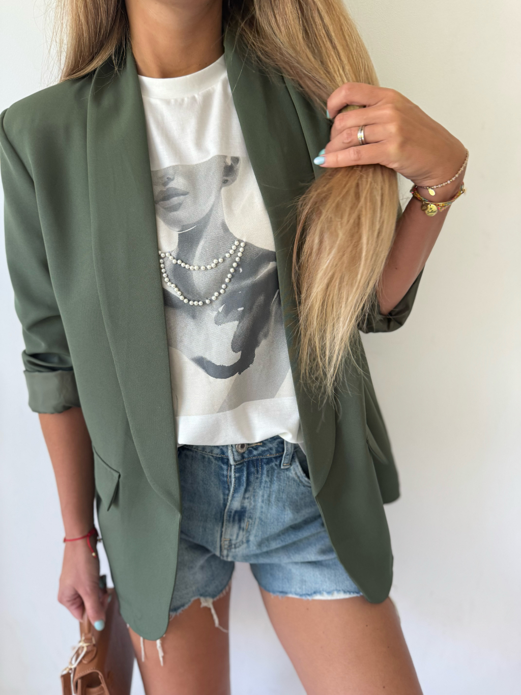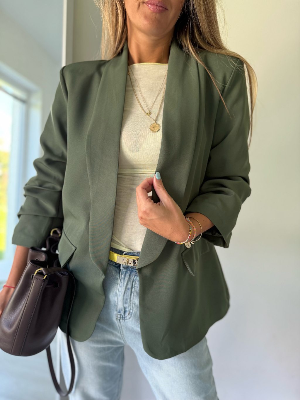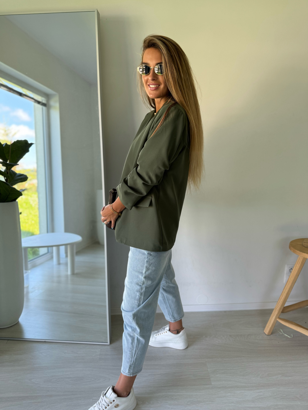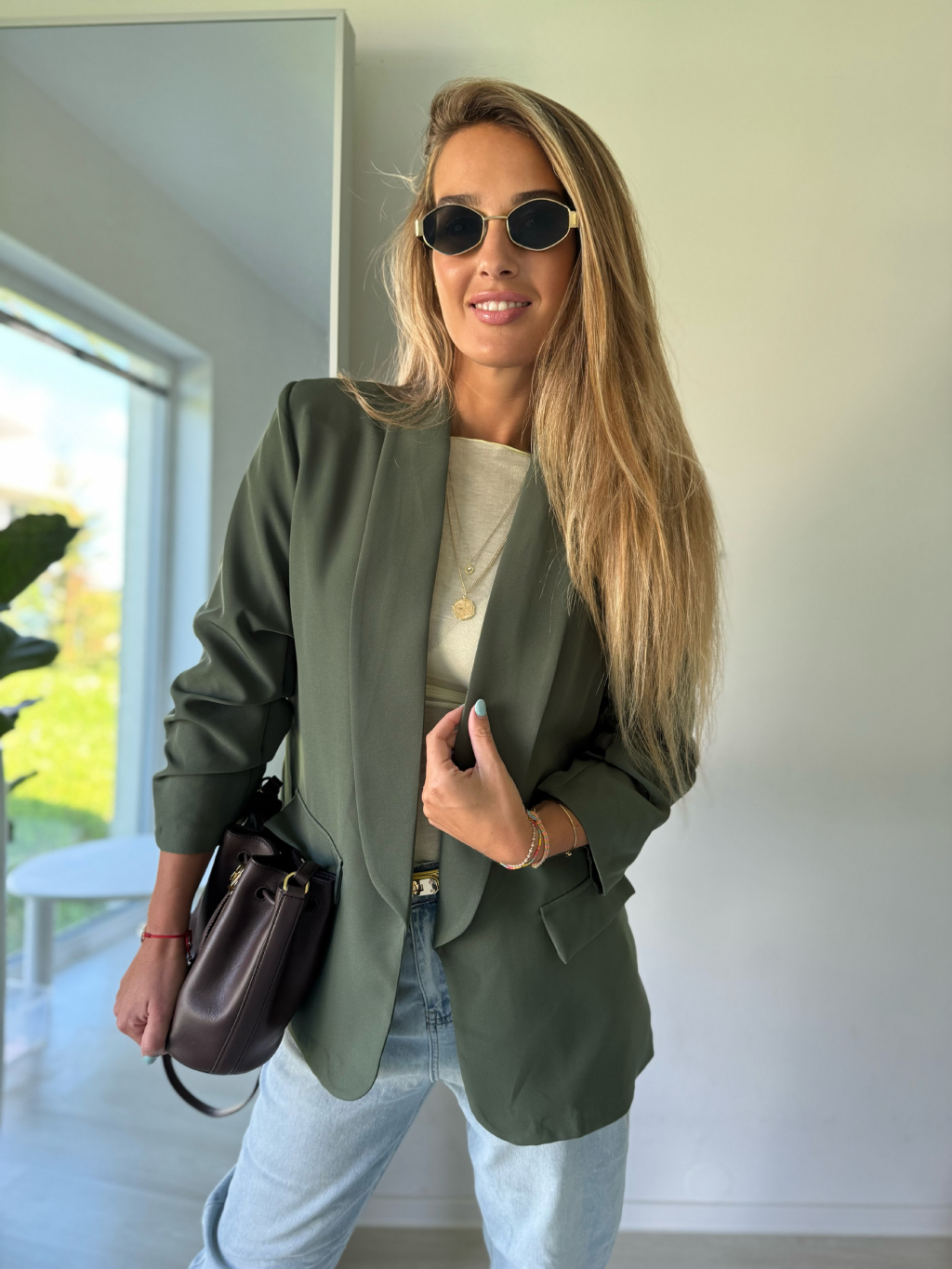 Jednoduché sako bez zapínání. Sako má nařasené rukávy, které lze nosit i ohrnuté.