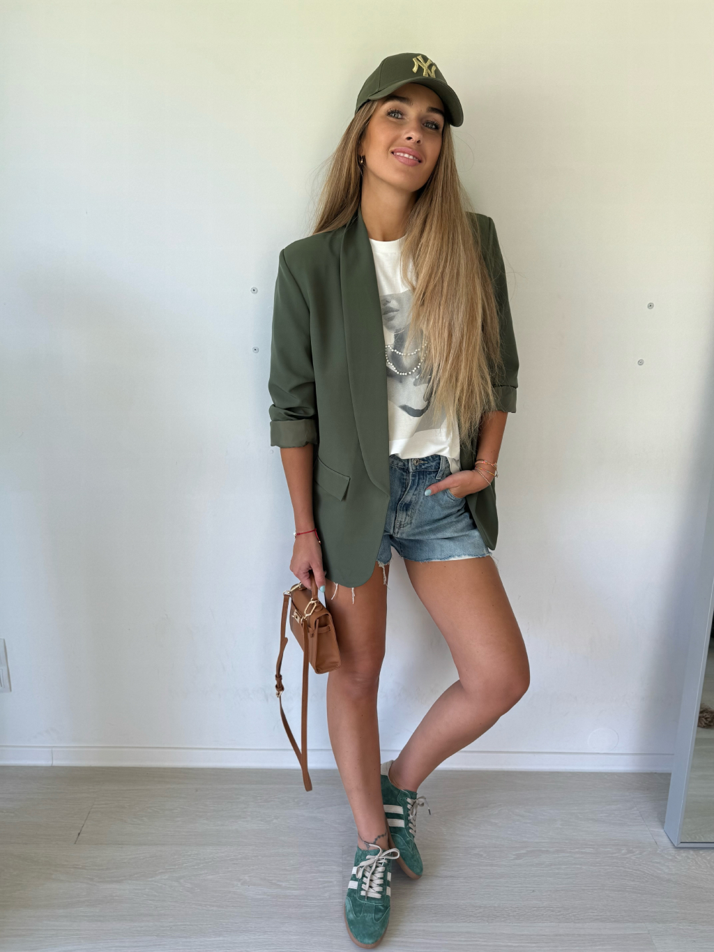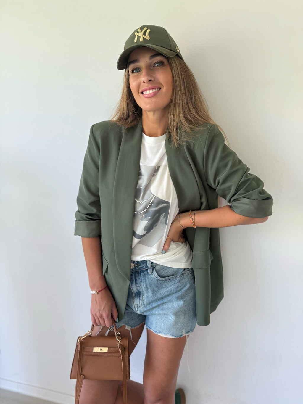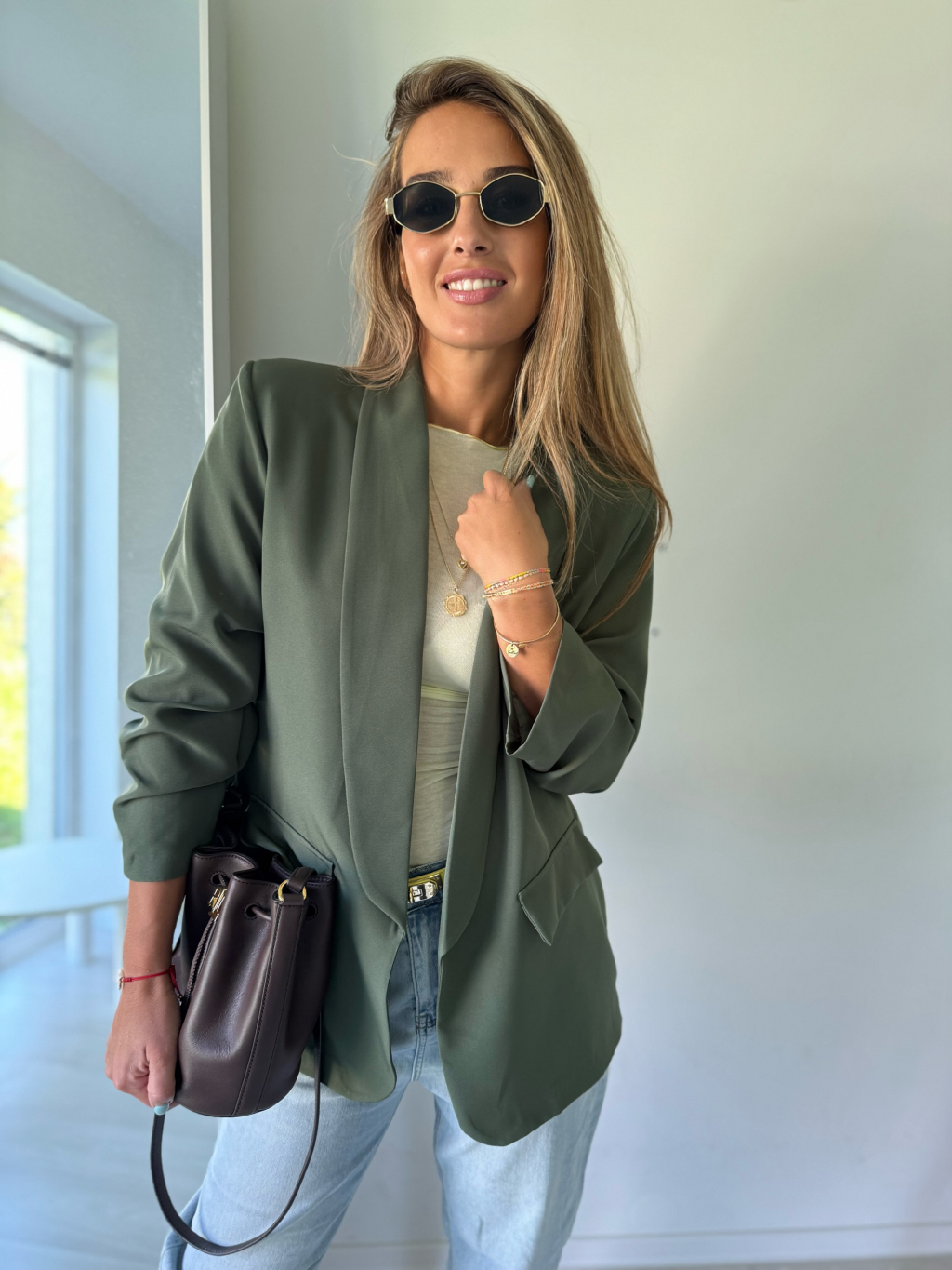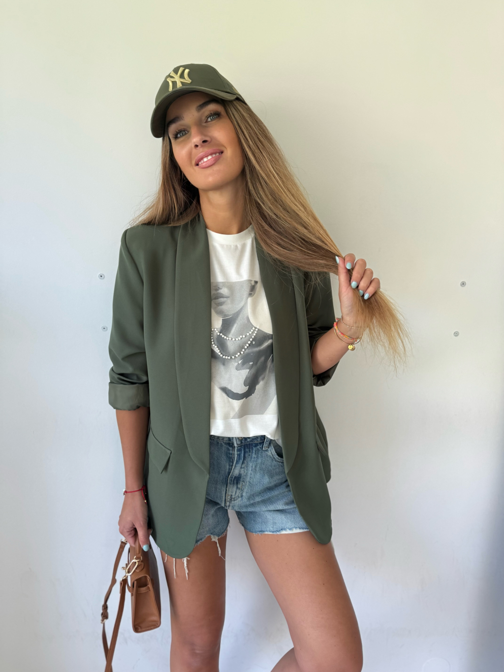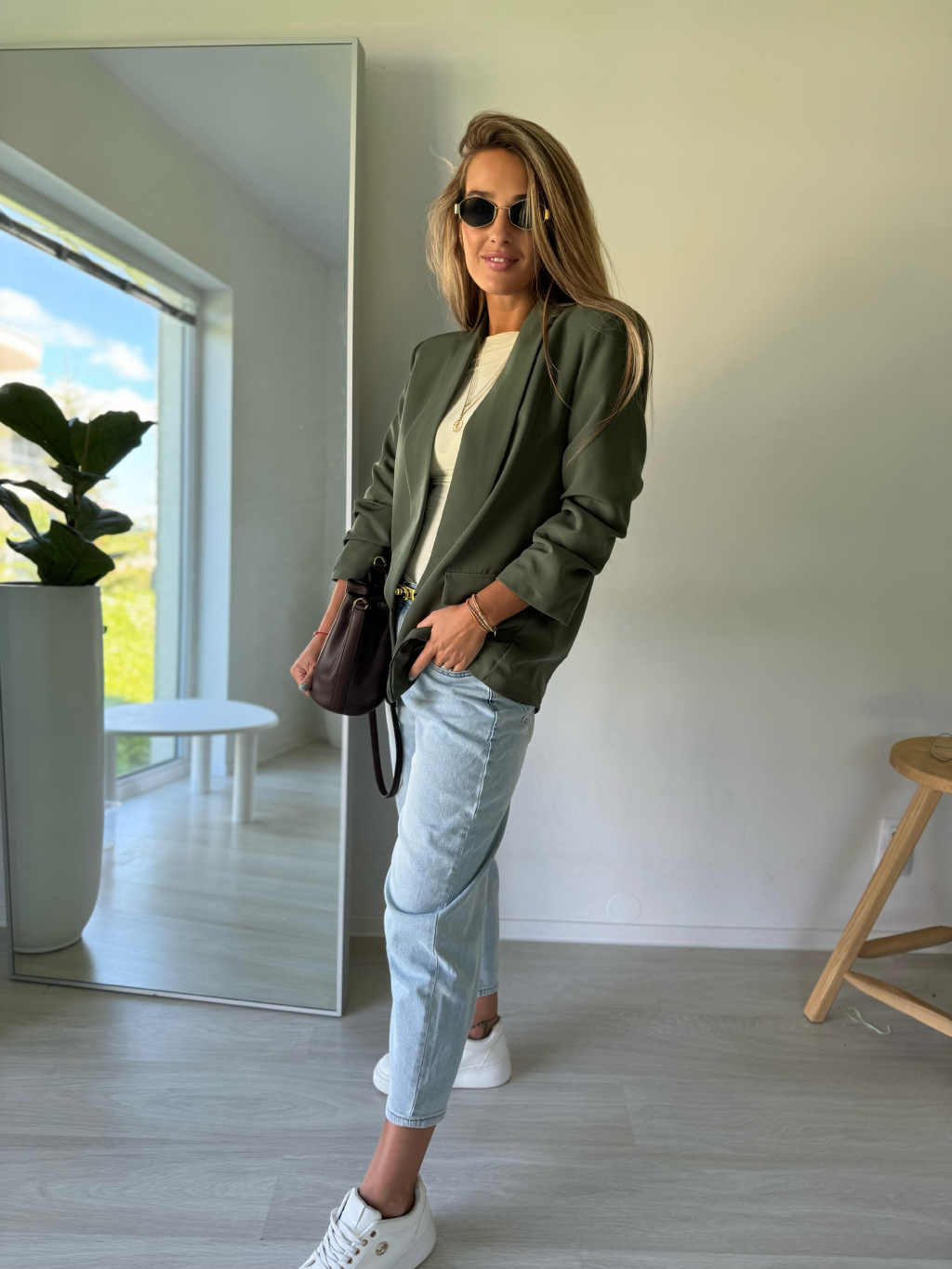 Jednoduché sako bez zapínání. Sako má nařasené rukávy, které lze nosit i ohrnuté.
