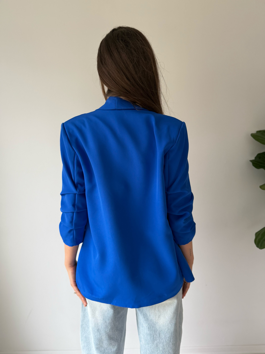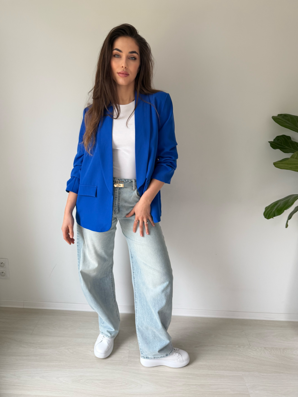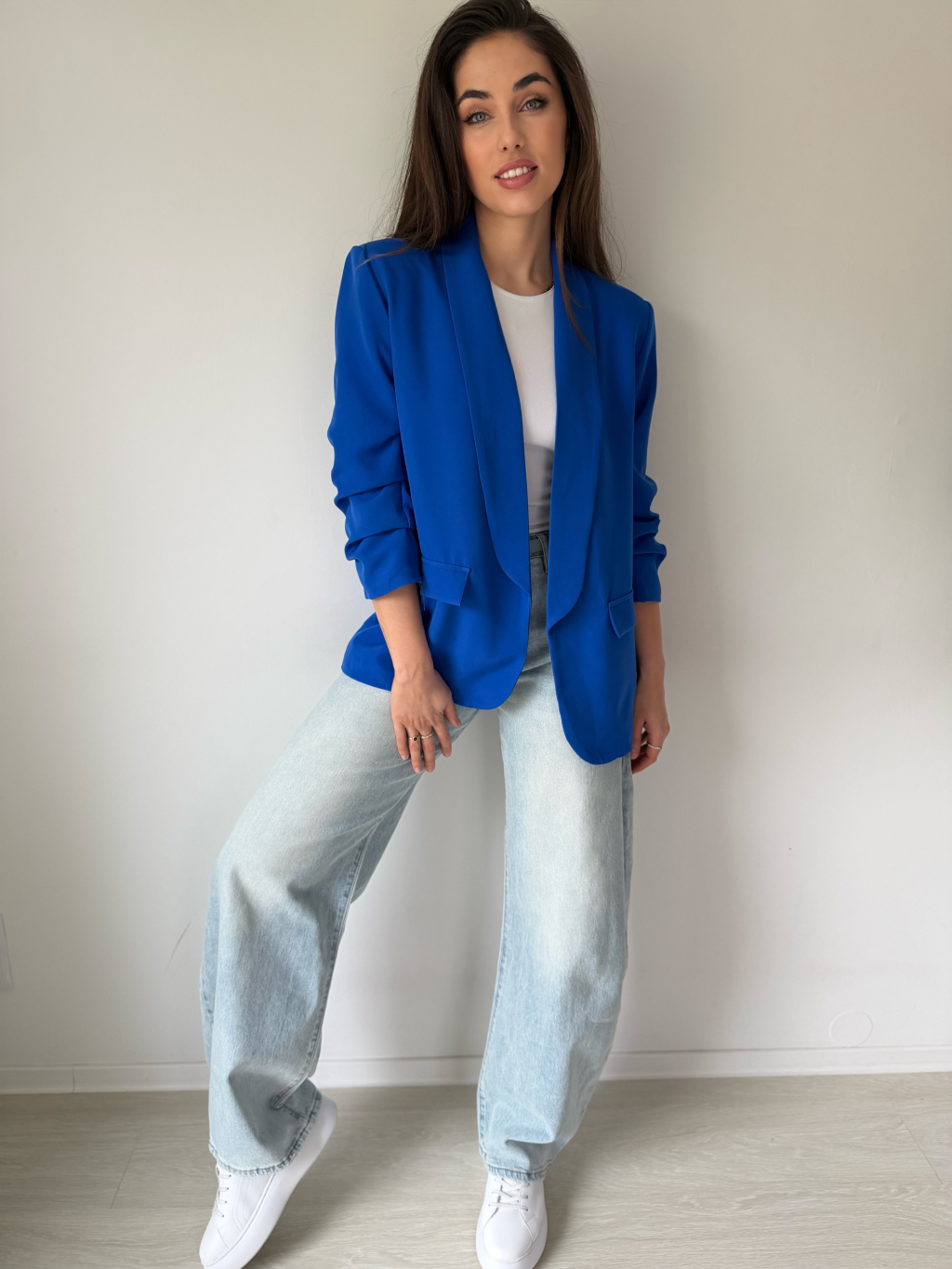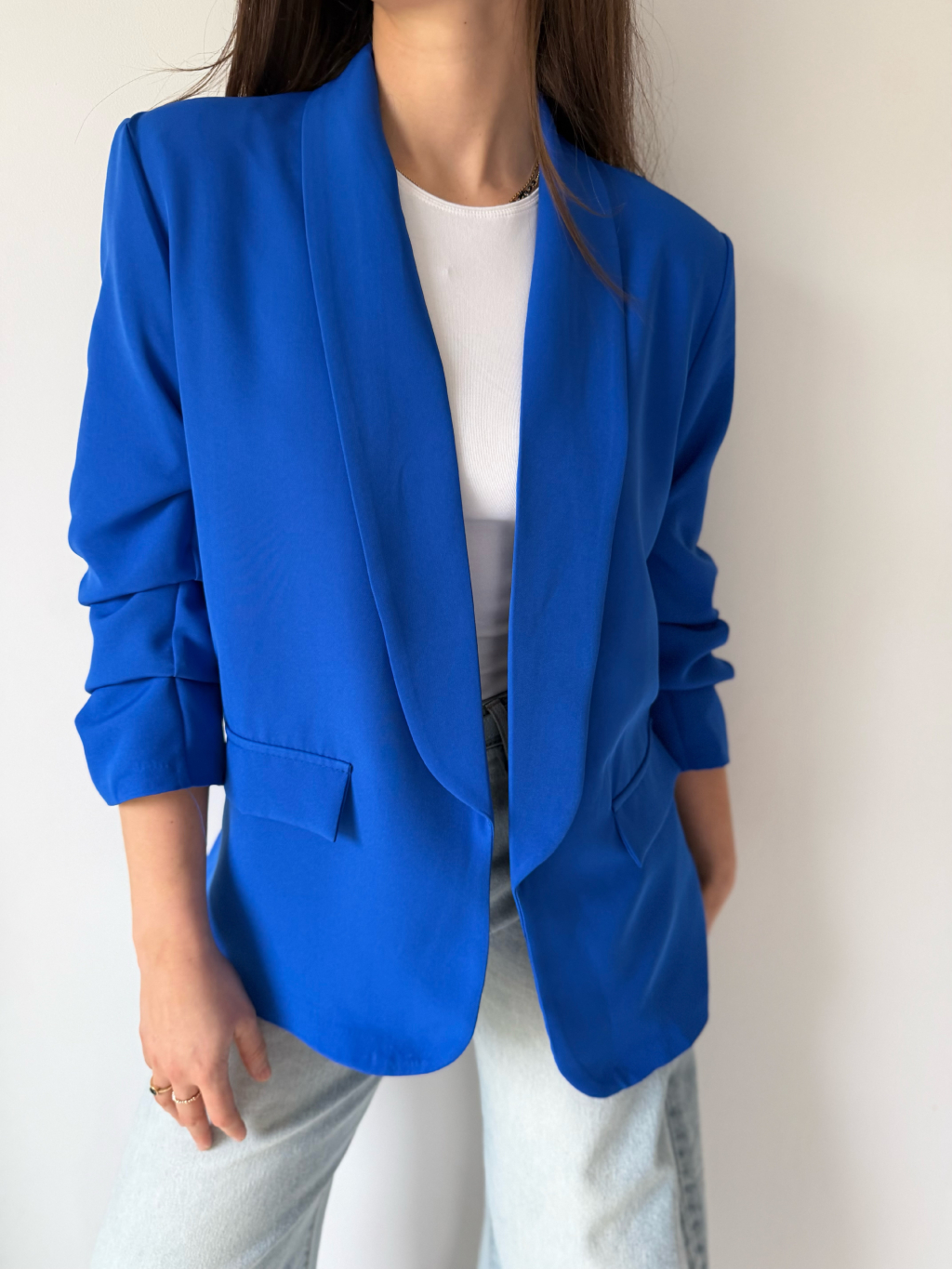 Jednoduché sako bez zapínání. Sako má nařasené rukávy, které lze nosit i ohrnuté.