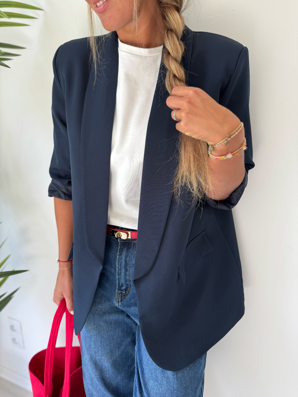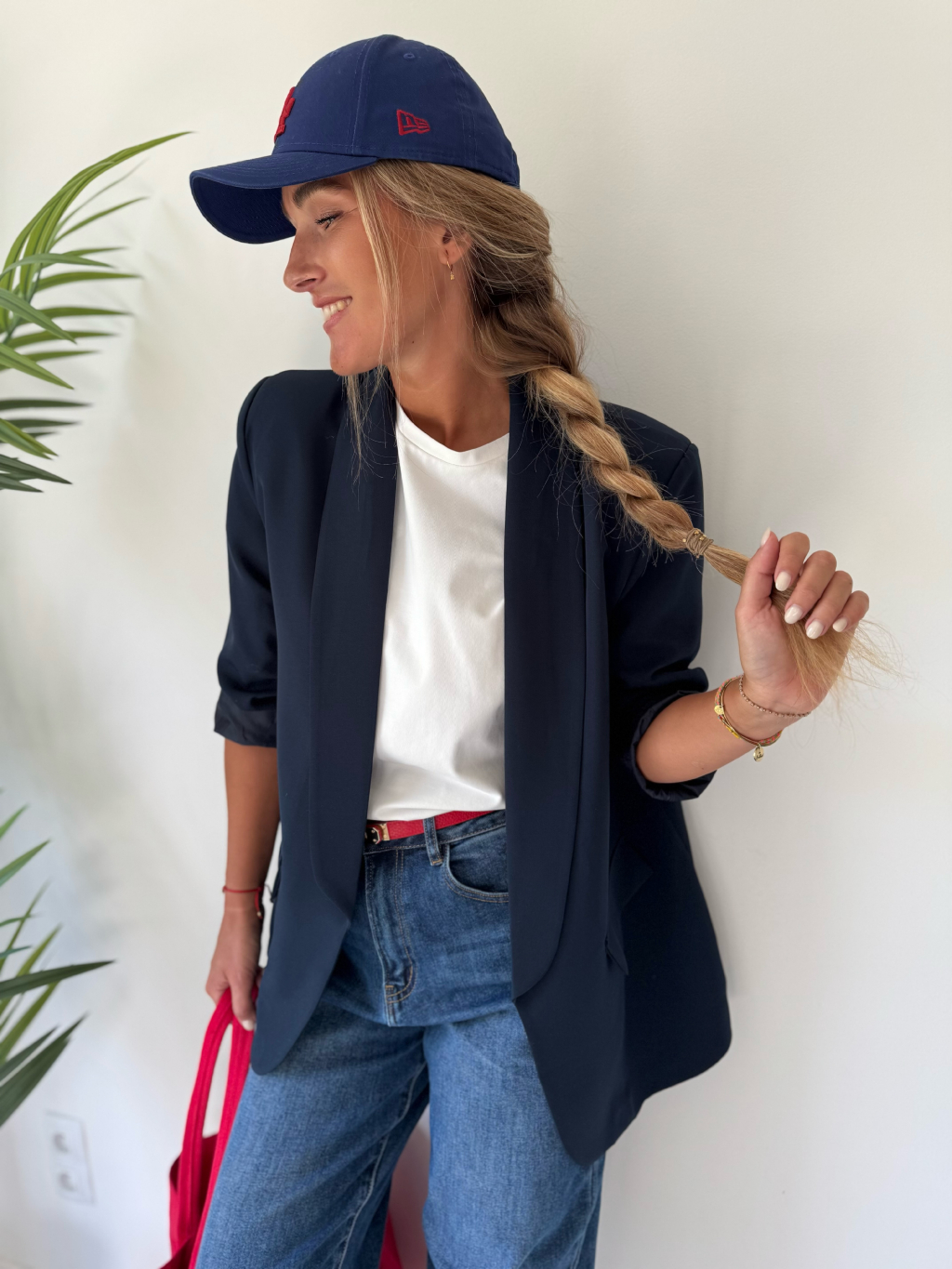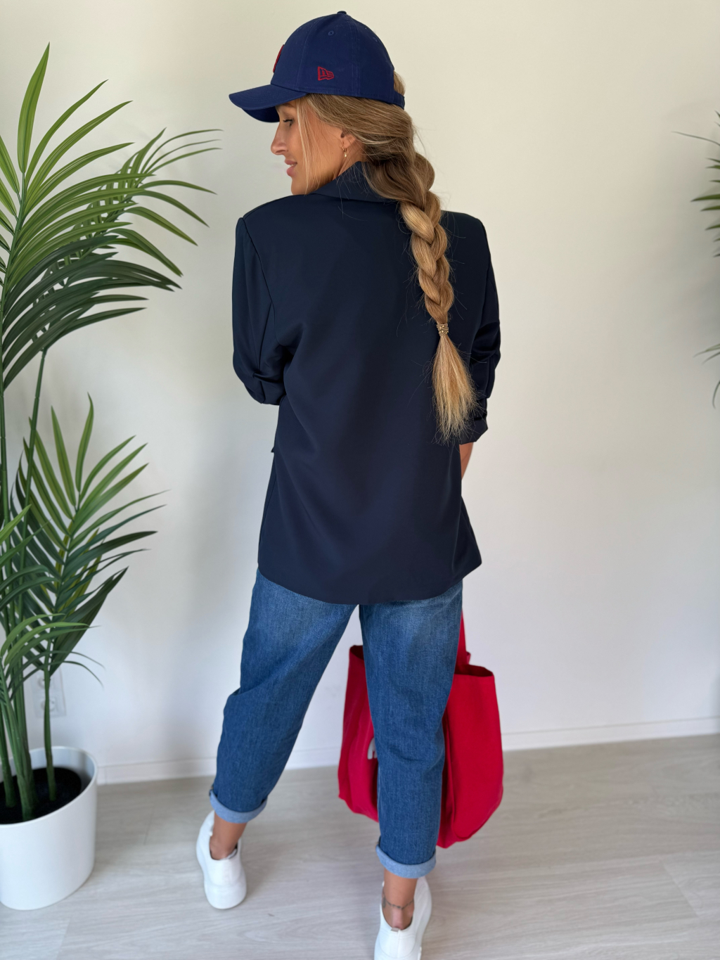 Jednoduché sako bez zapínání. Sako má nařasené rukávy, které lze nosit i ohrnuté.