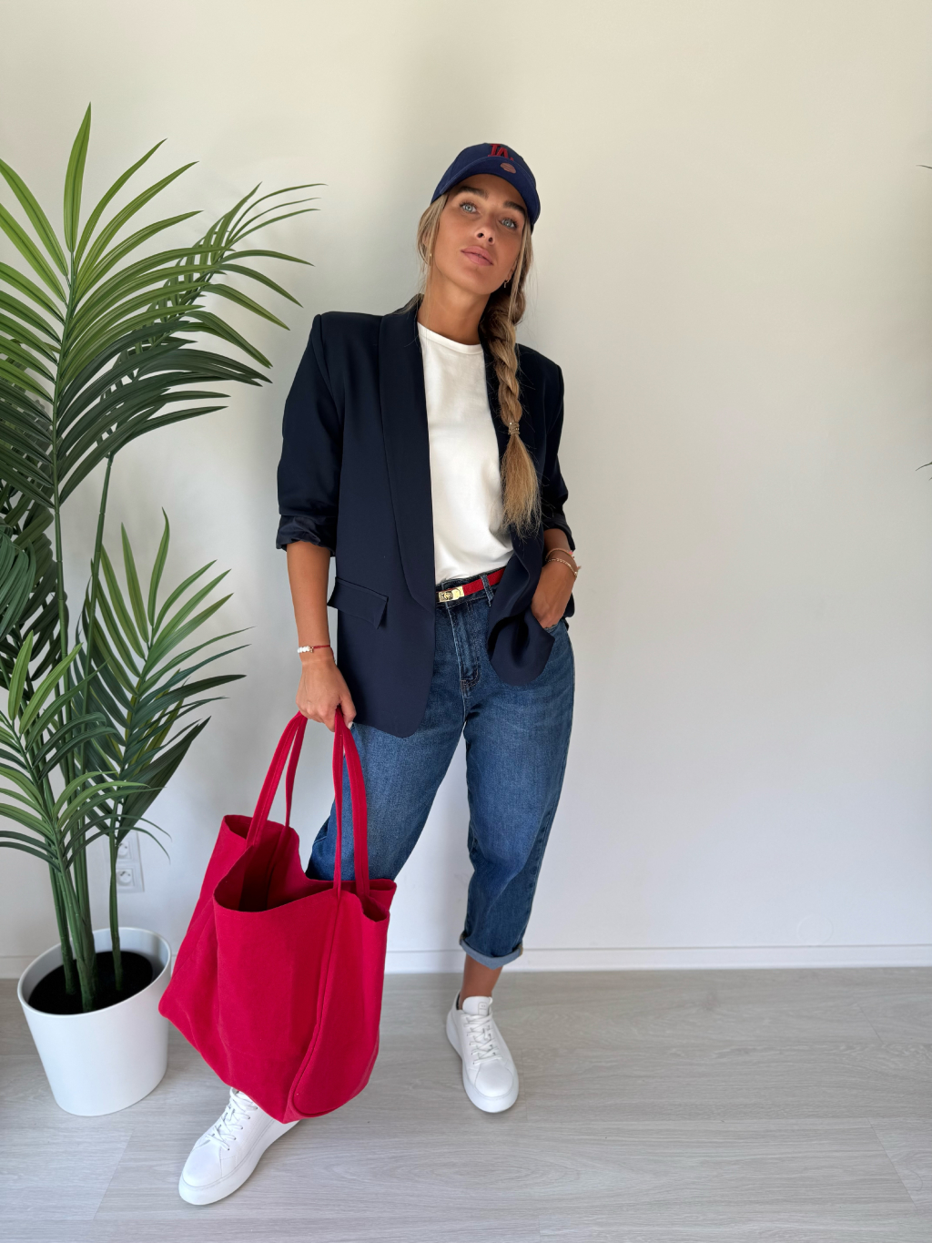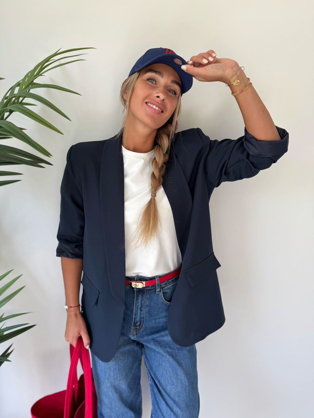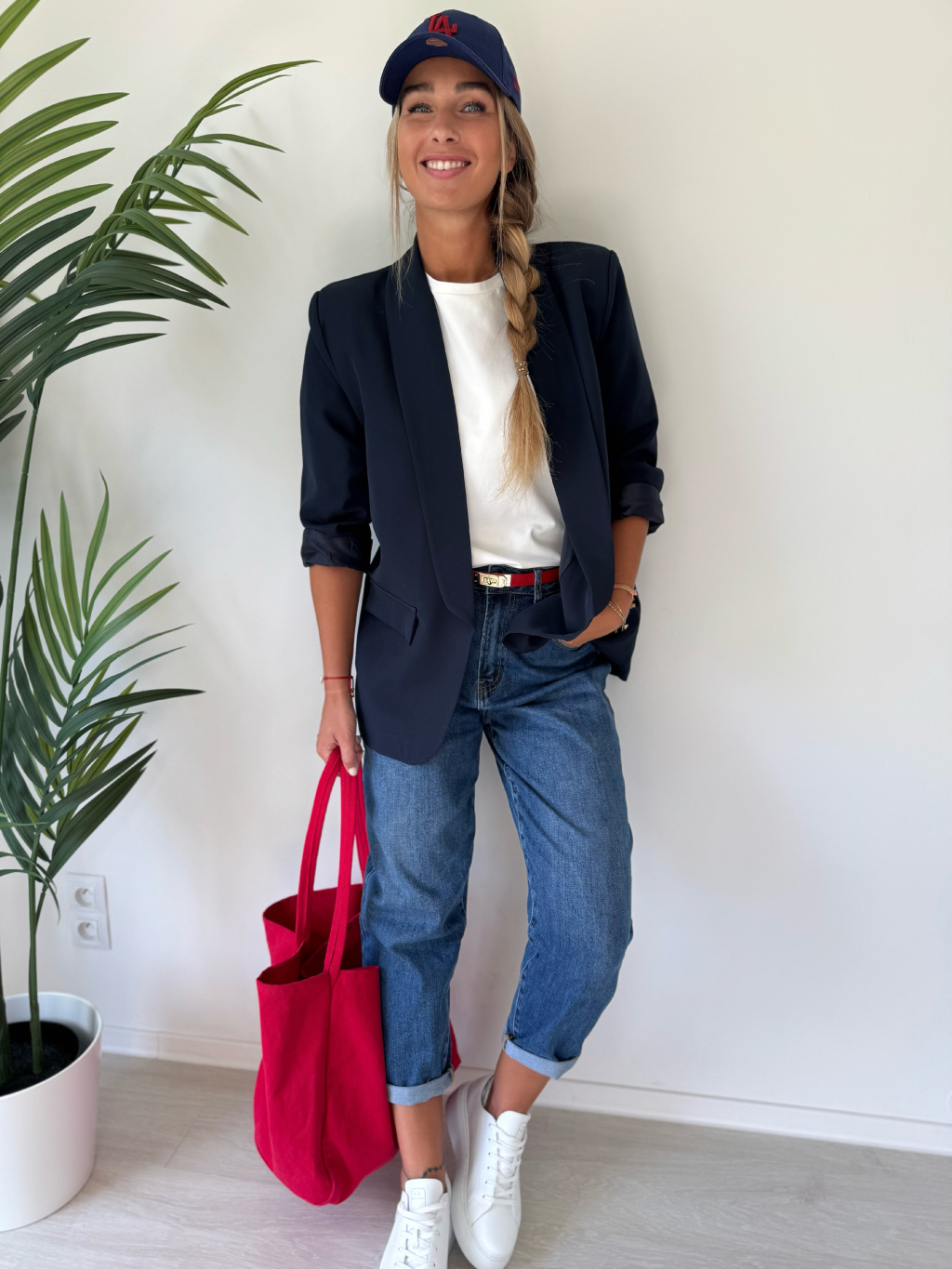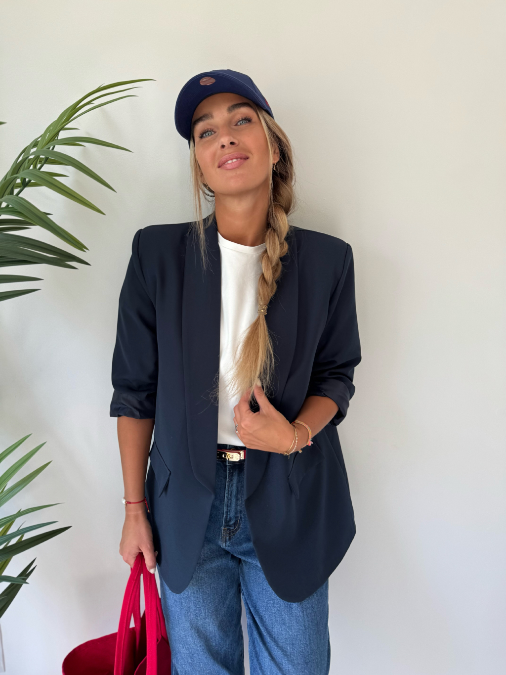 Jednoduché sako bez zapínání. Sako má nařasené rukávy, které lze nosit i ohrnuté.