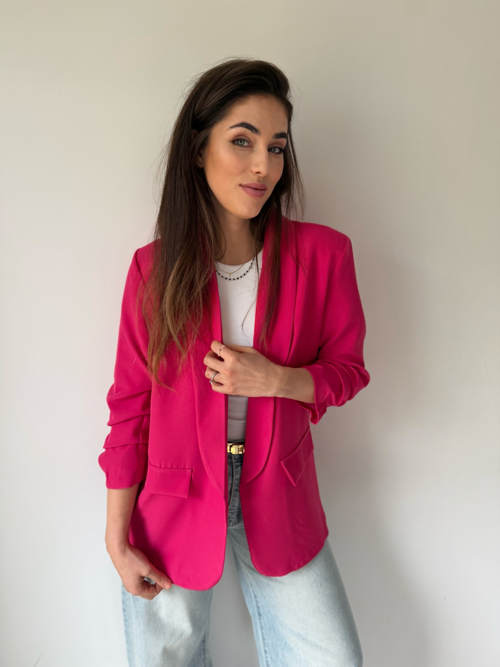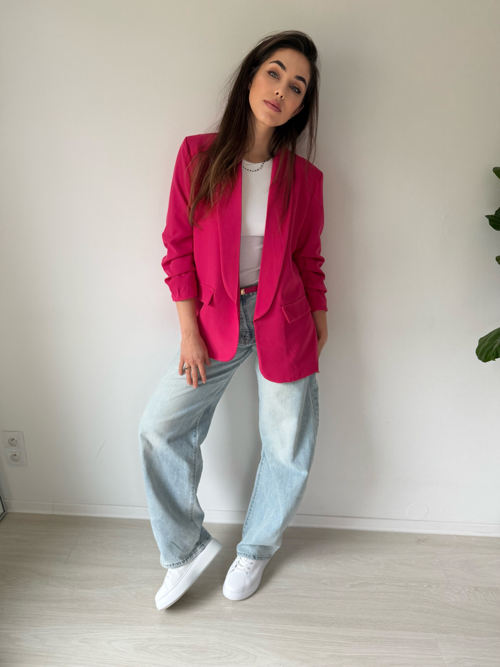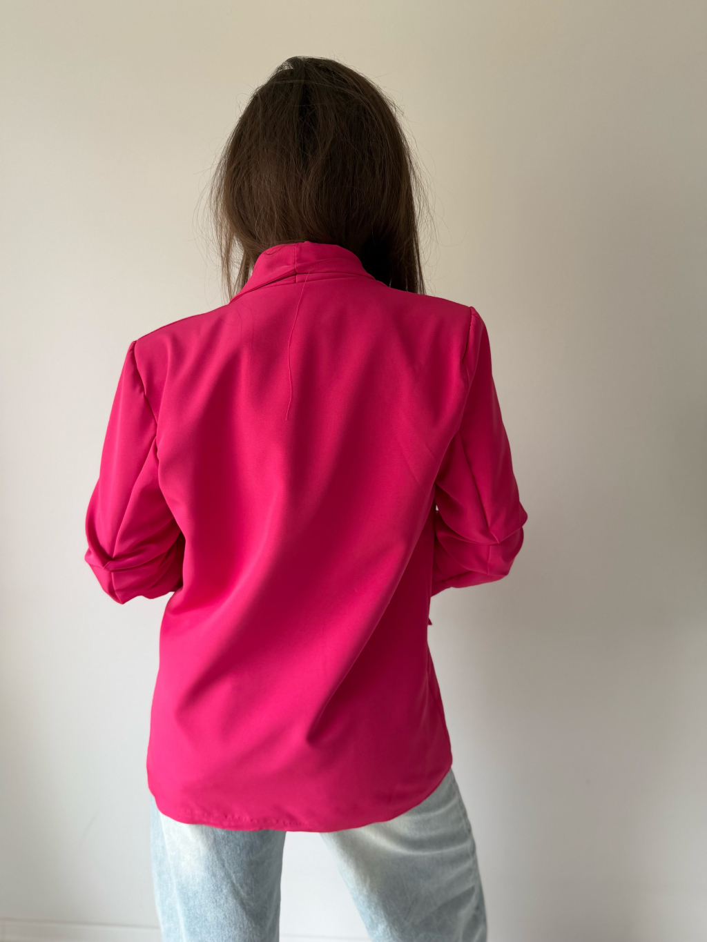 Jednoduché sako bez zapínání. Sako má nařasené rukávy, které lze nosit i ohrnuté.