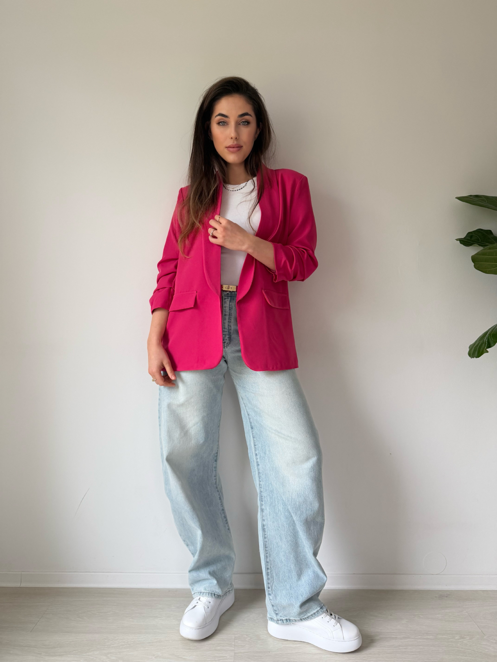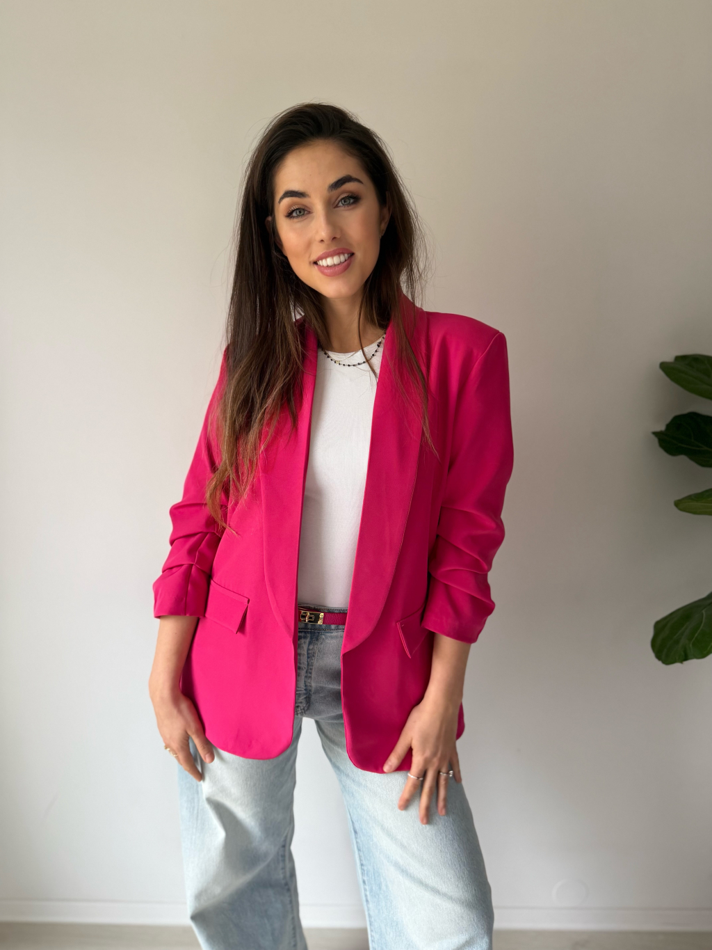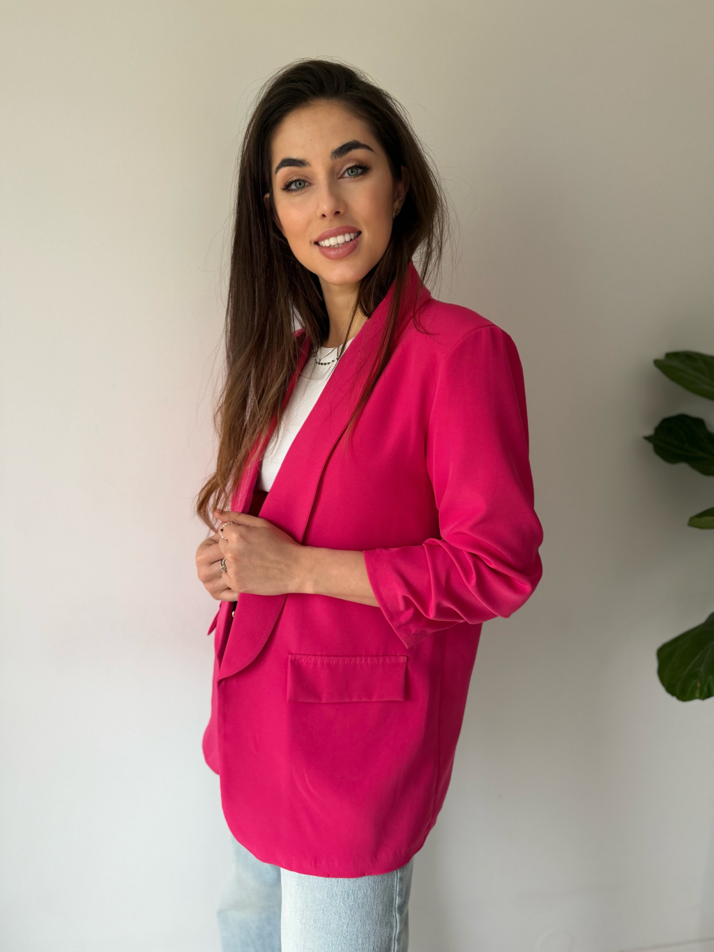 Jednoduché sako bez zapínání. Sako má nařasené rukávy, které lze nosit i ohrnuté.