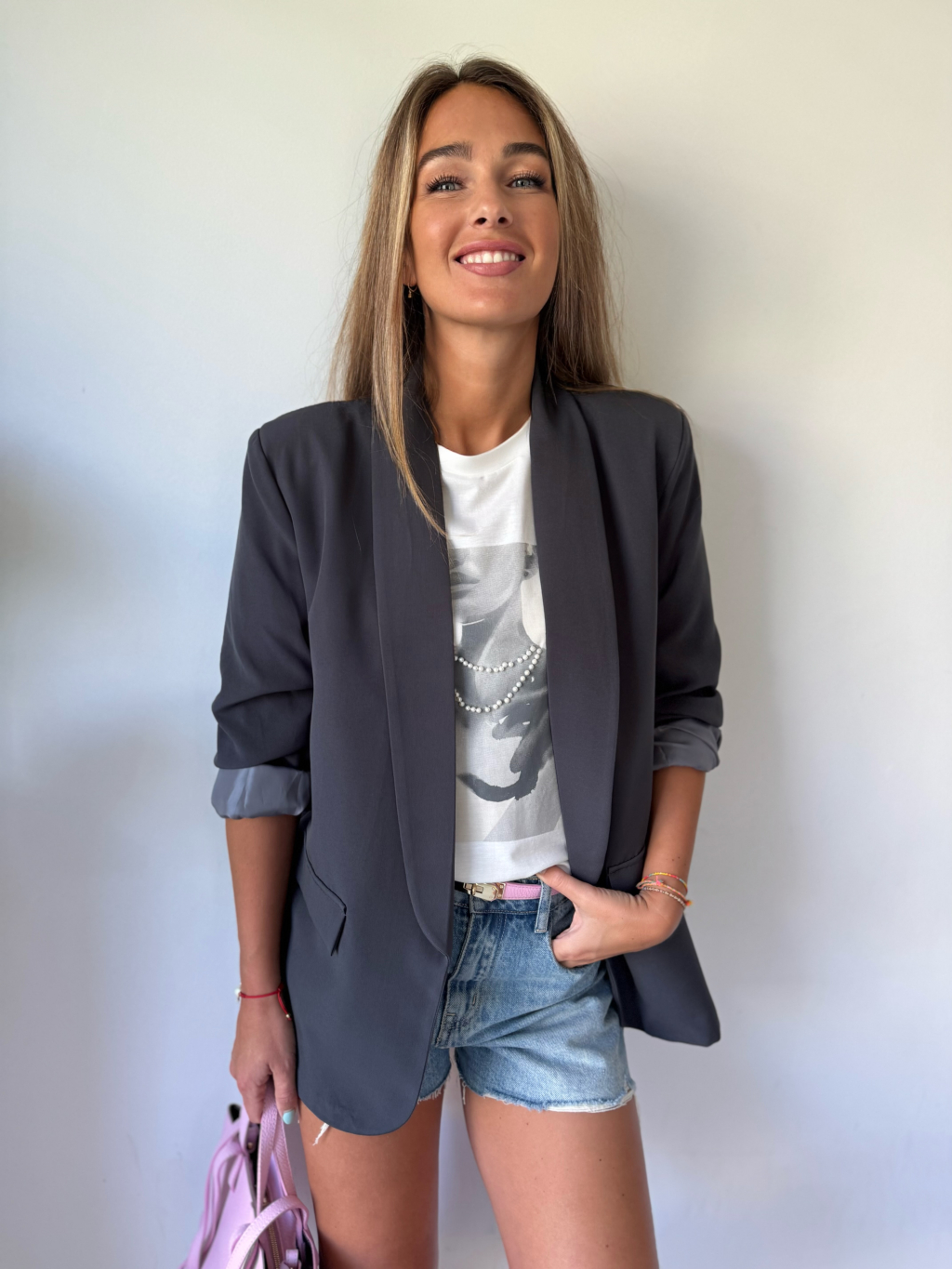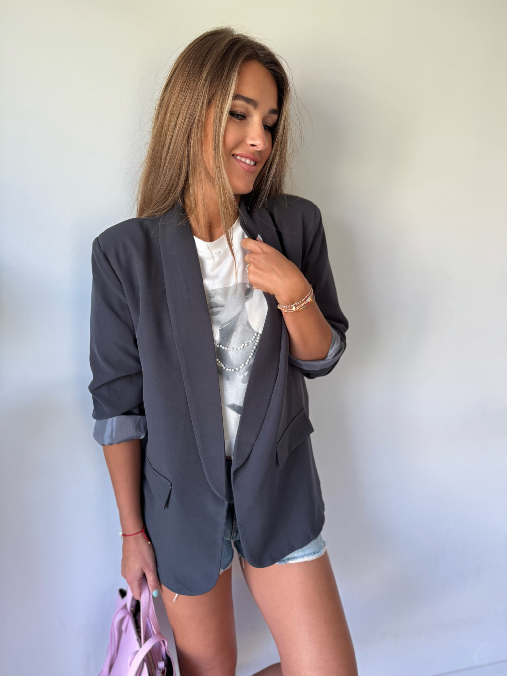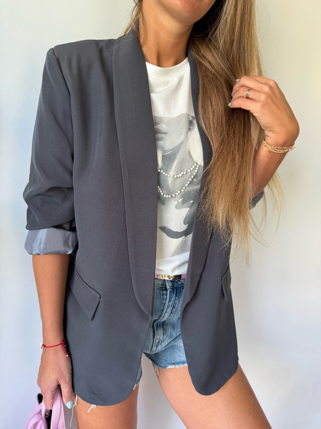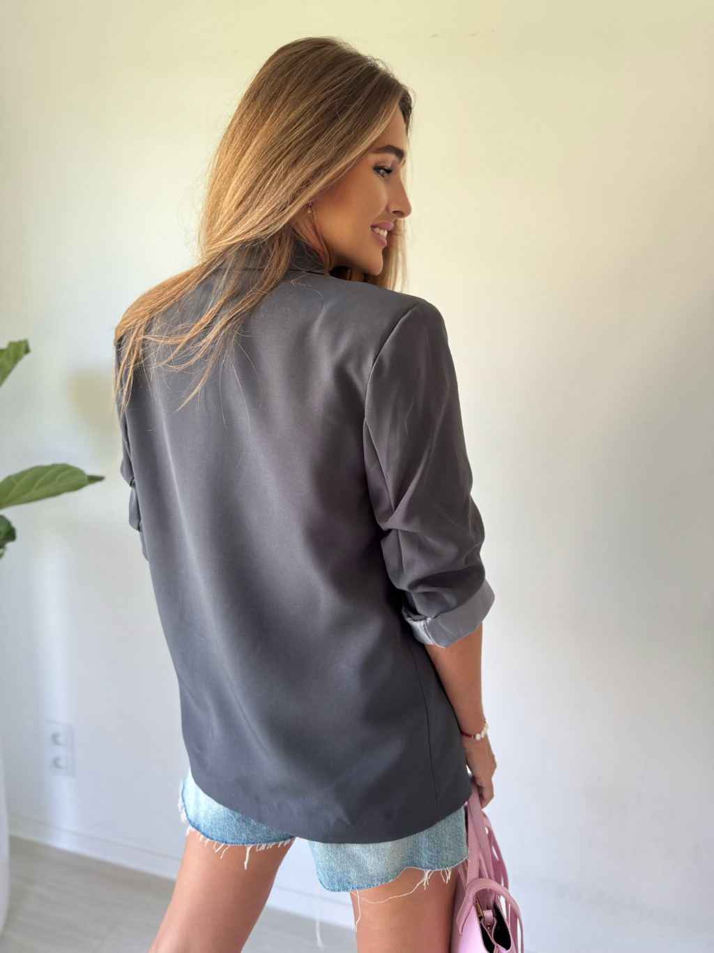 Jednoduché sako bez zapínání. Sako má nařasené rukávy, které lze nosit i ohrnuté.