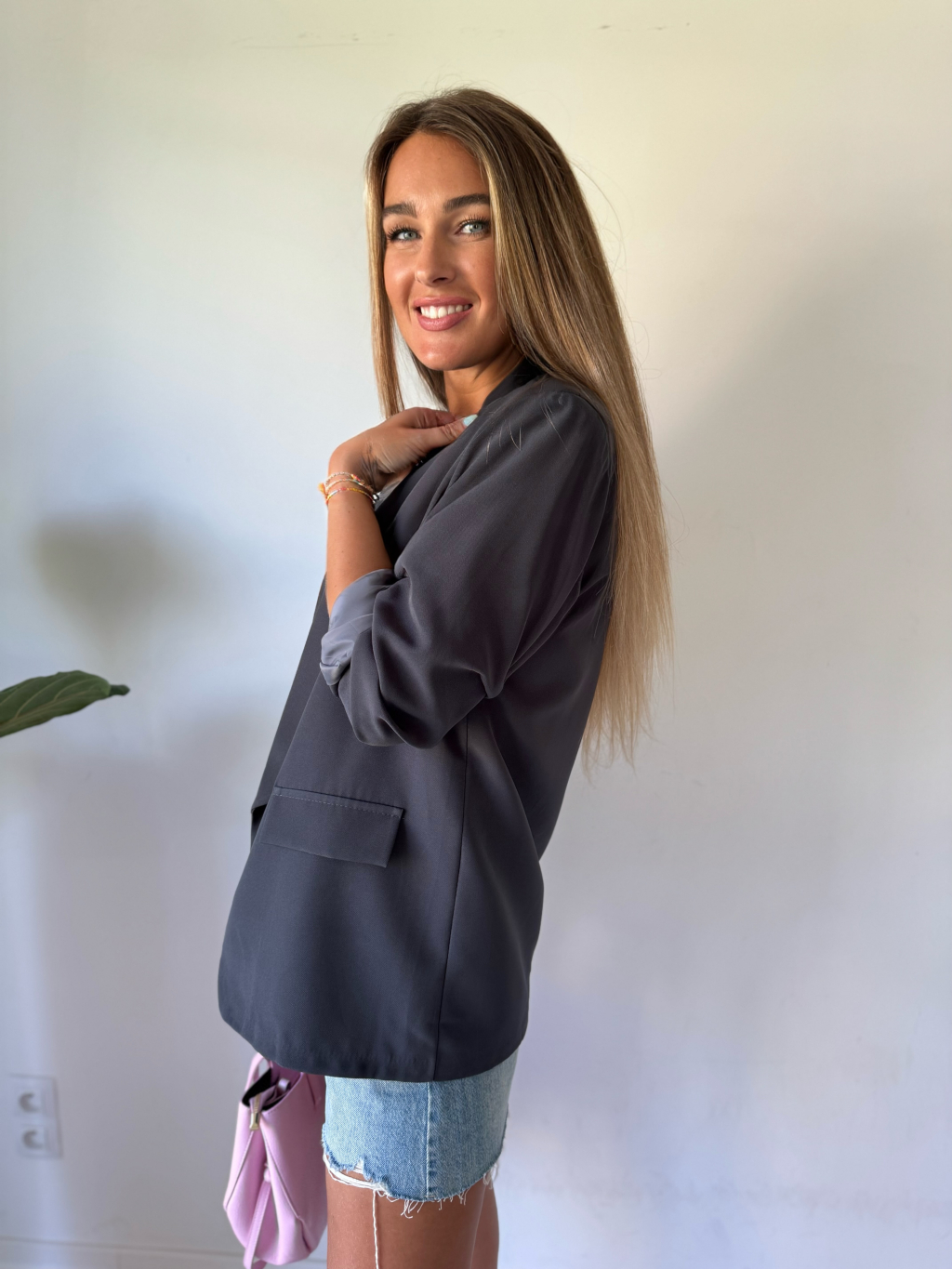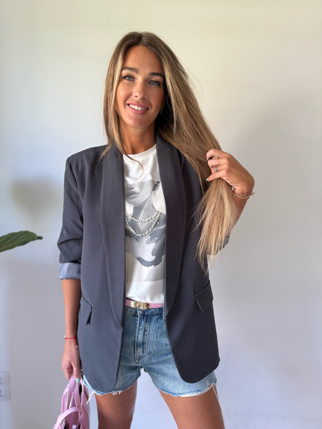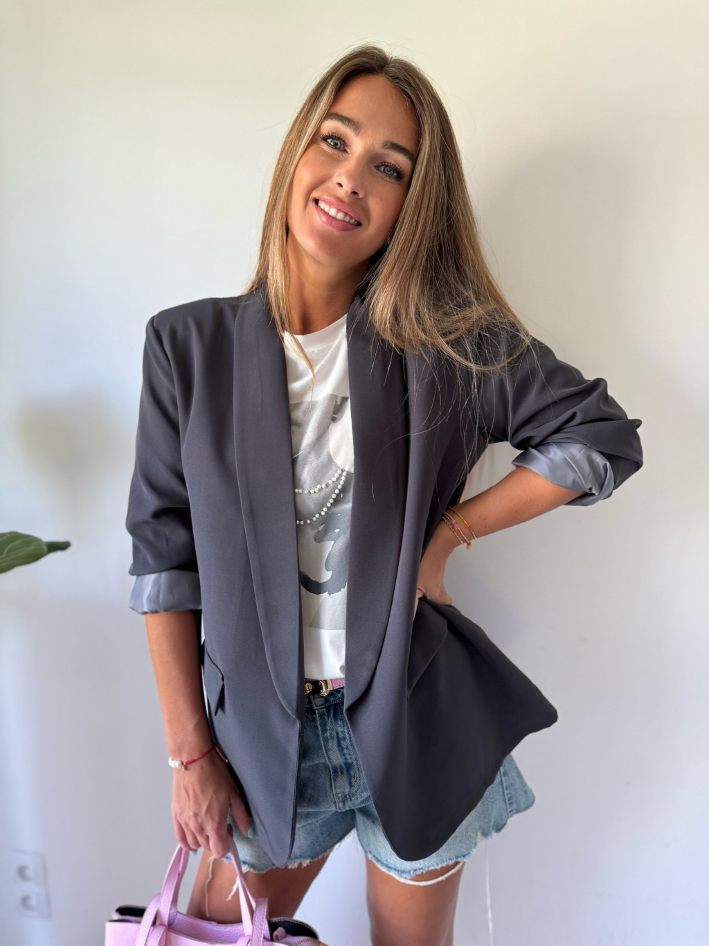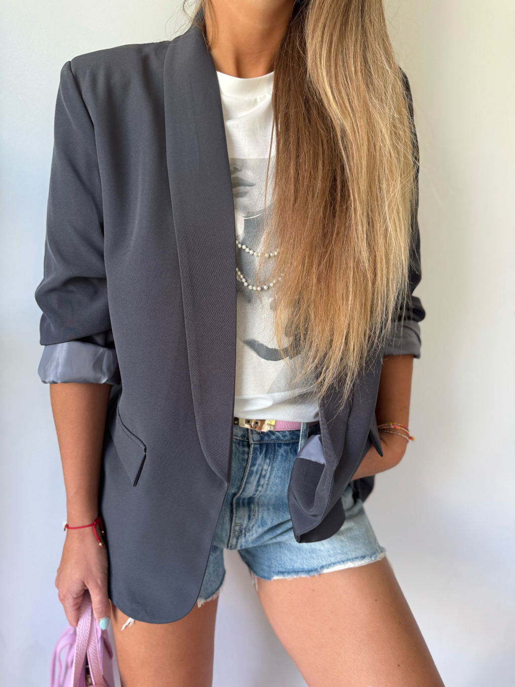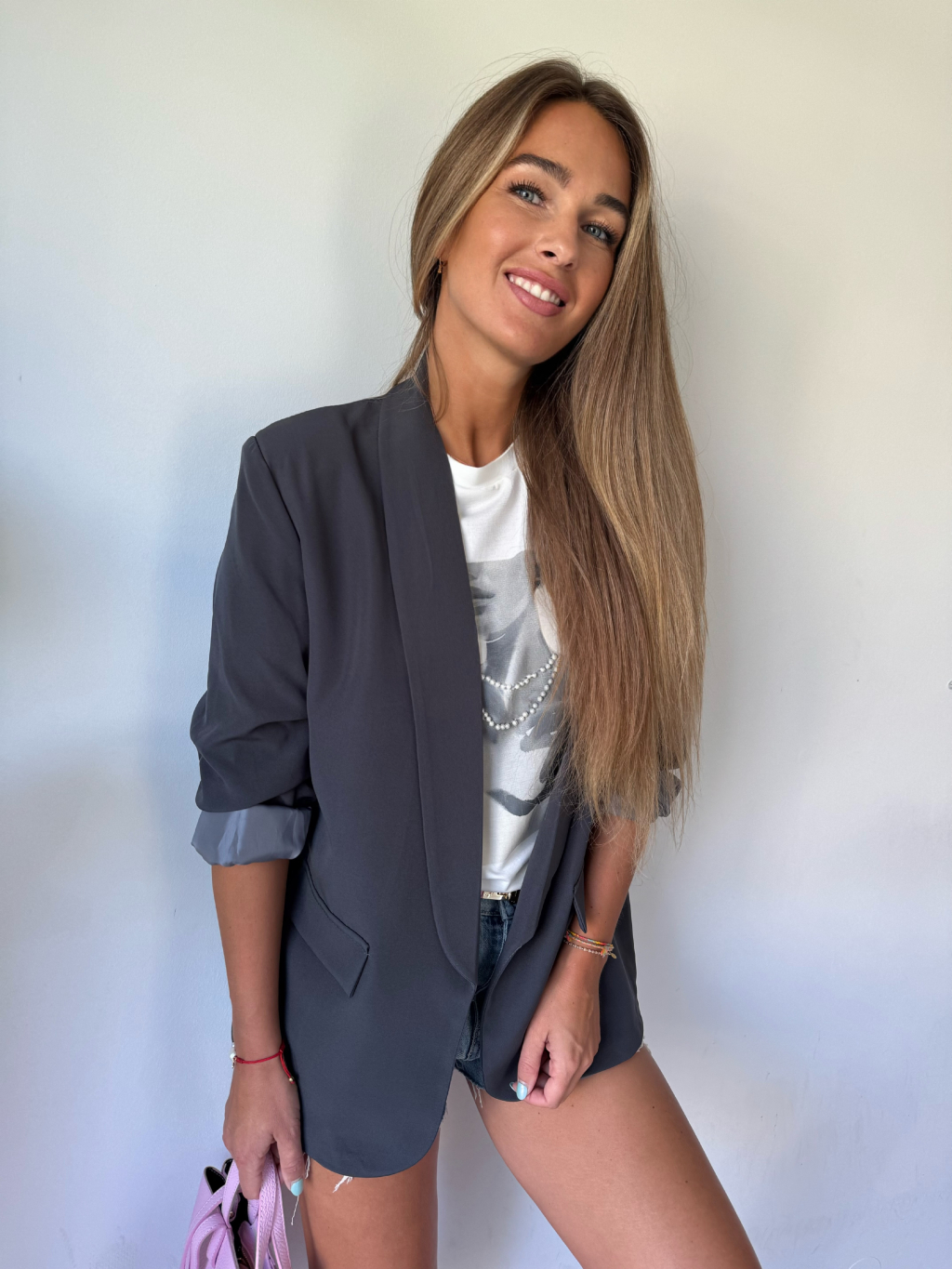 Jednoduché sako bez zapínání. Sako má nařasené rukávy, které lze nosit i ohrnuté.