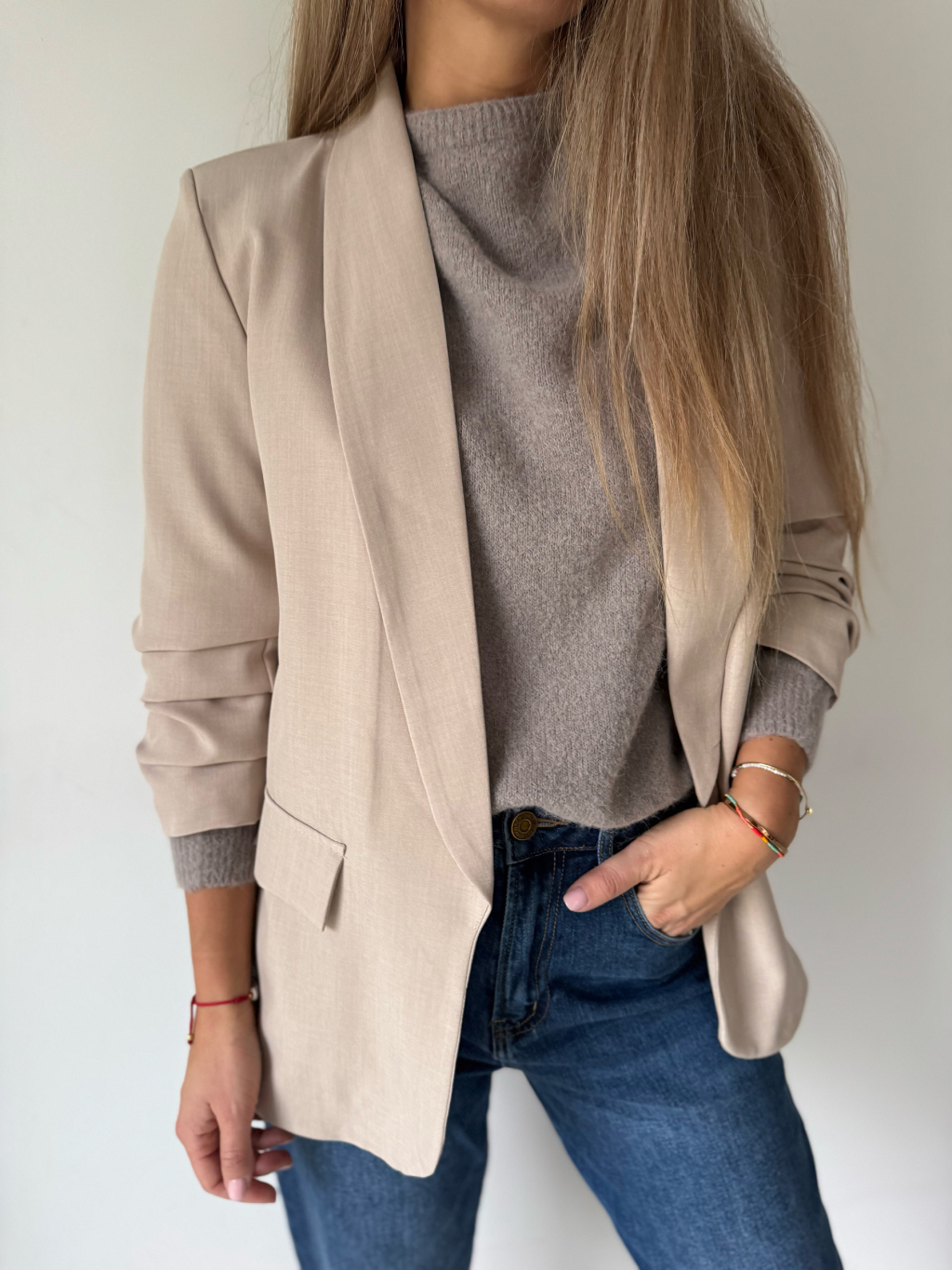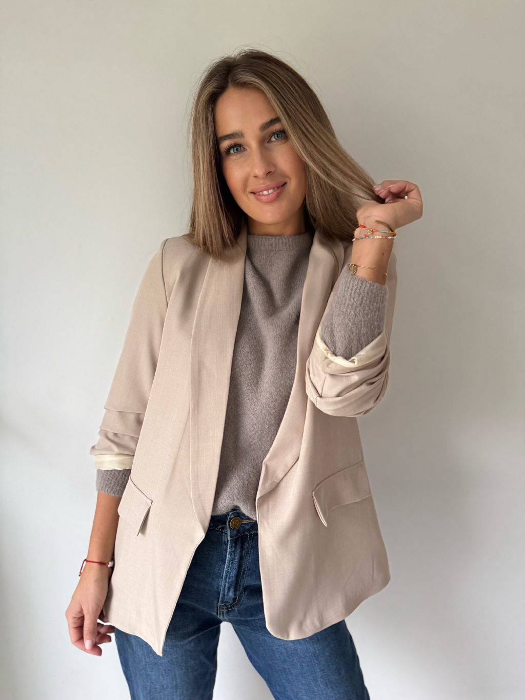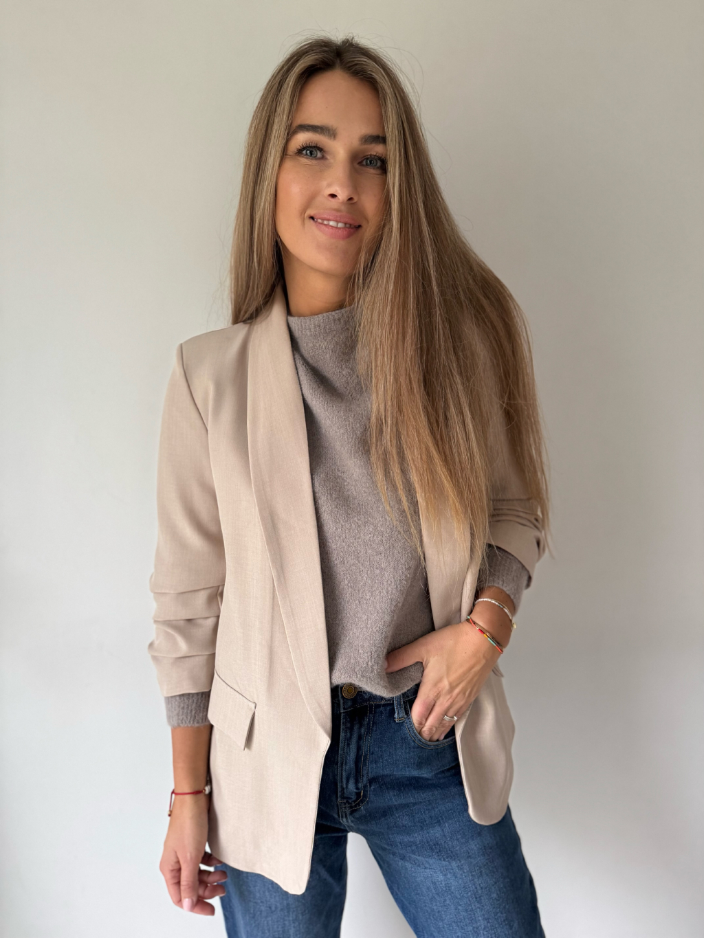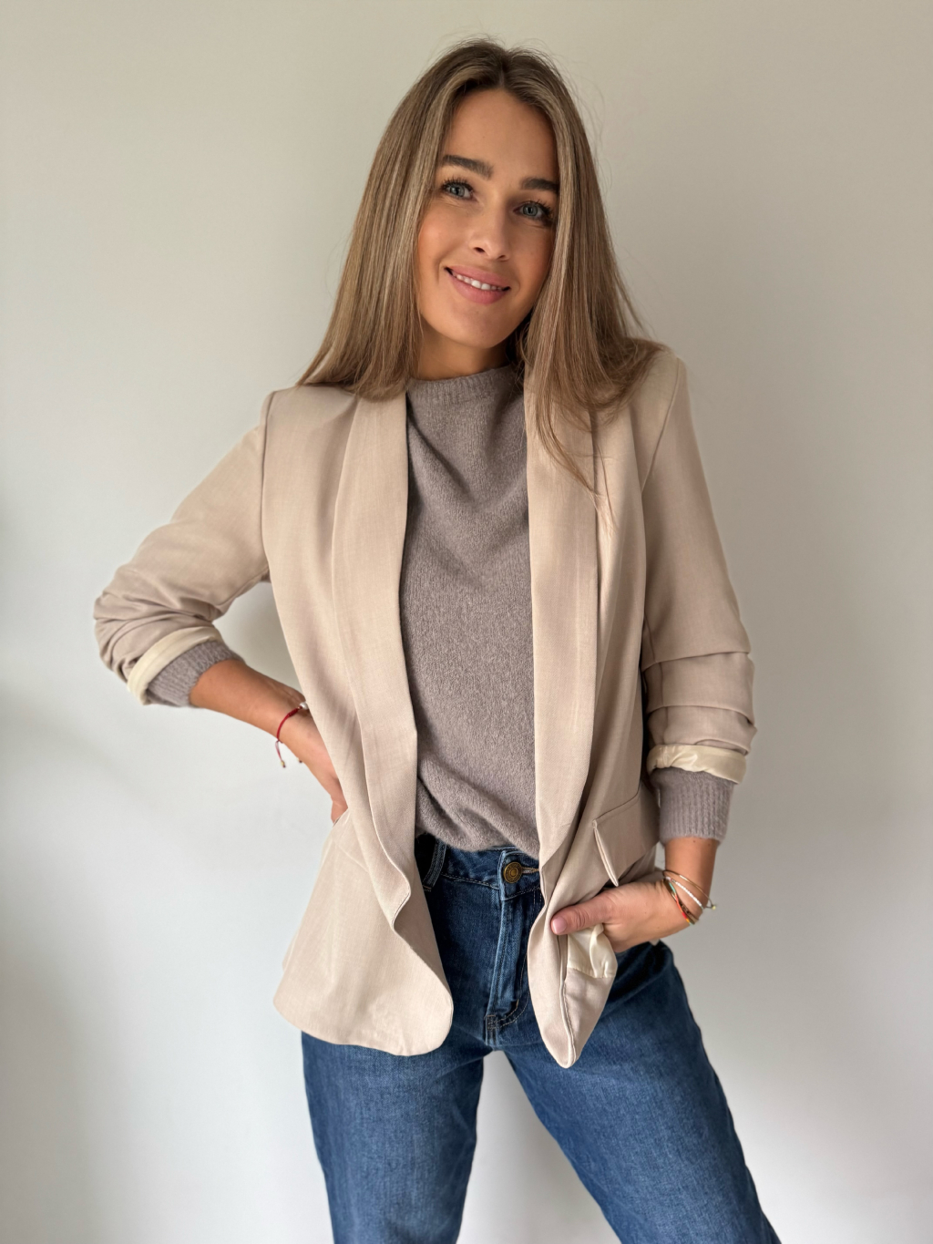 Jednoduché sako bez zapínání. Sako má nařasené rukávy, které lze nosit i ohrnuté.