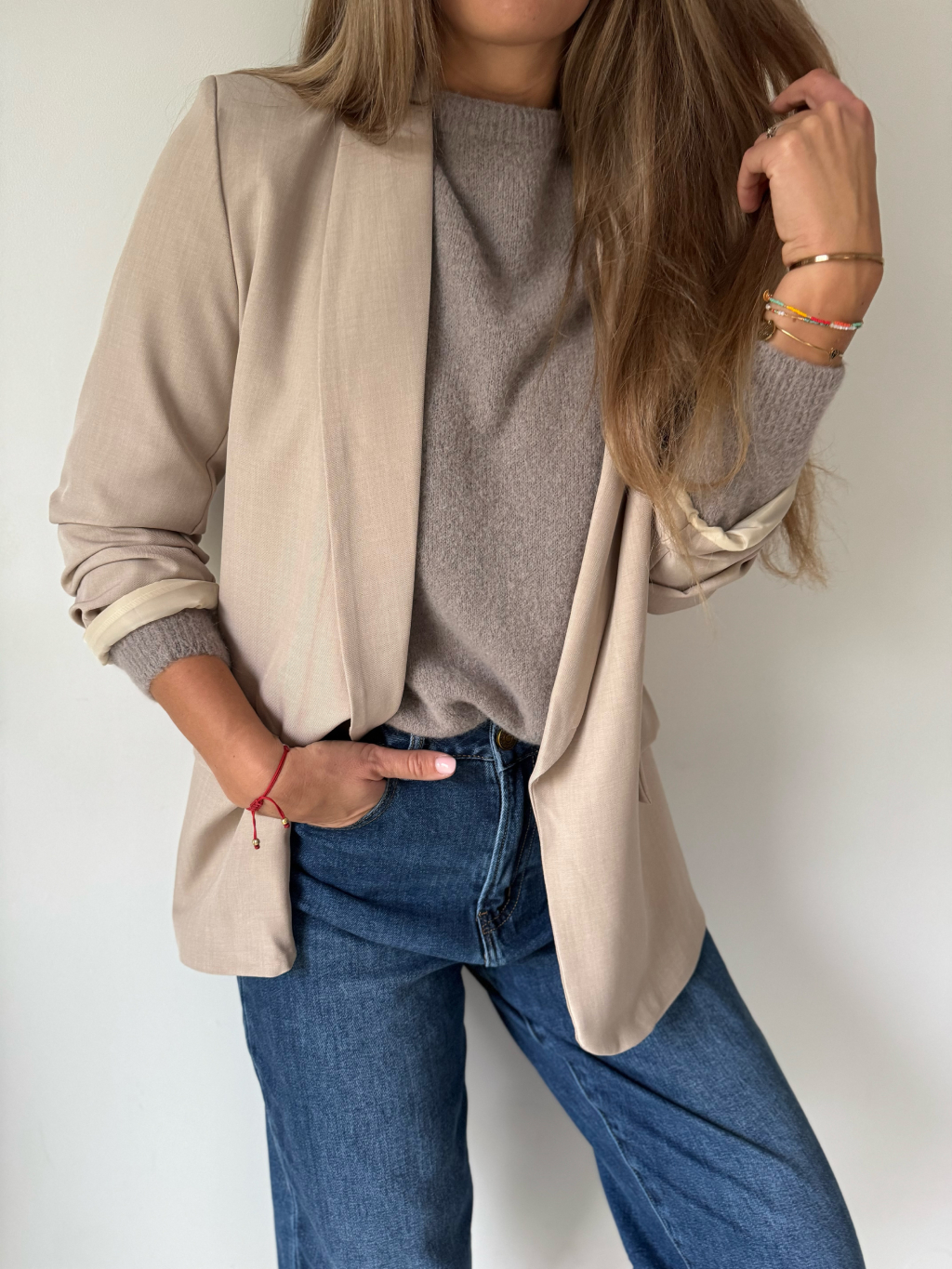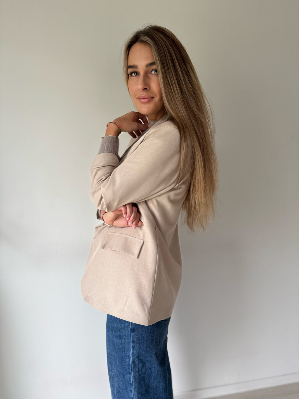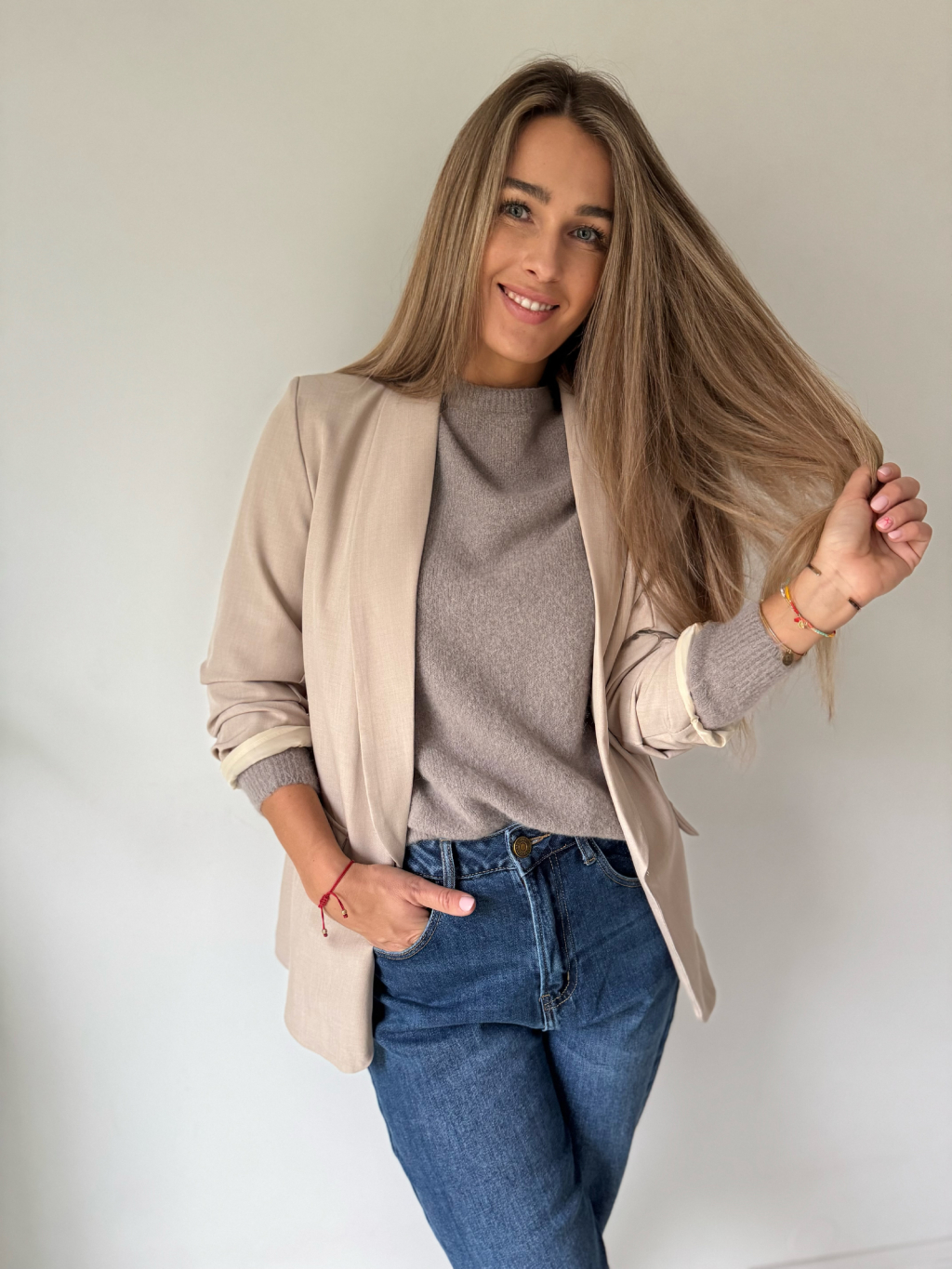 Jednoduché sako bez zapínání. Sako má nařasené rukávy, které lze nosit i ohrnuté.