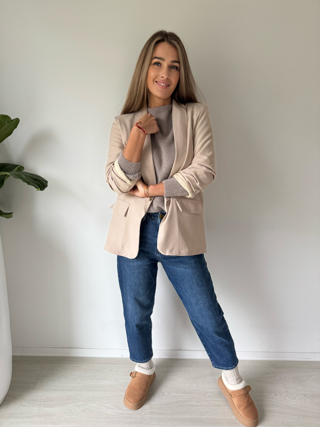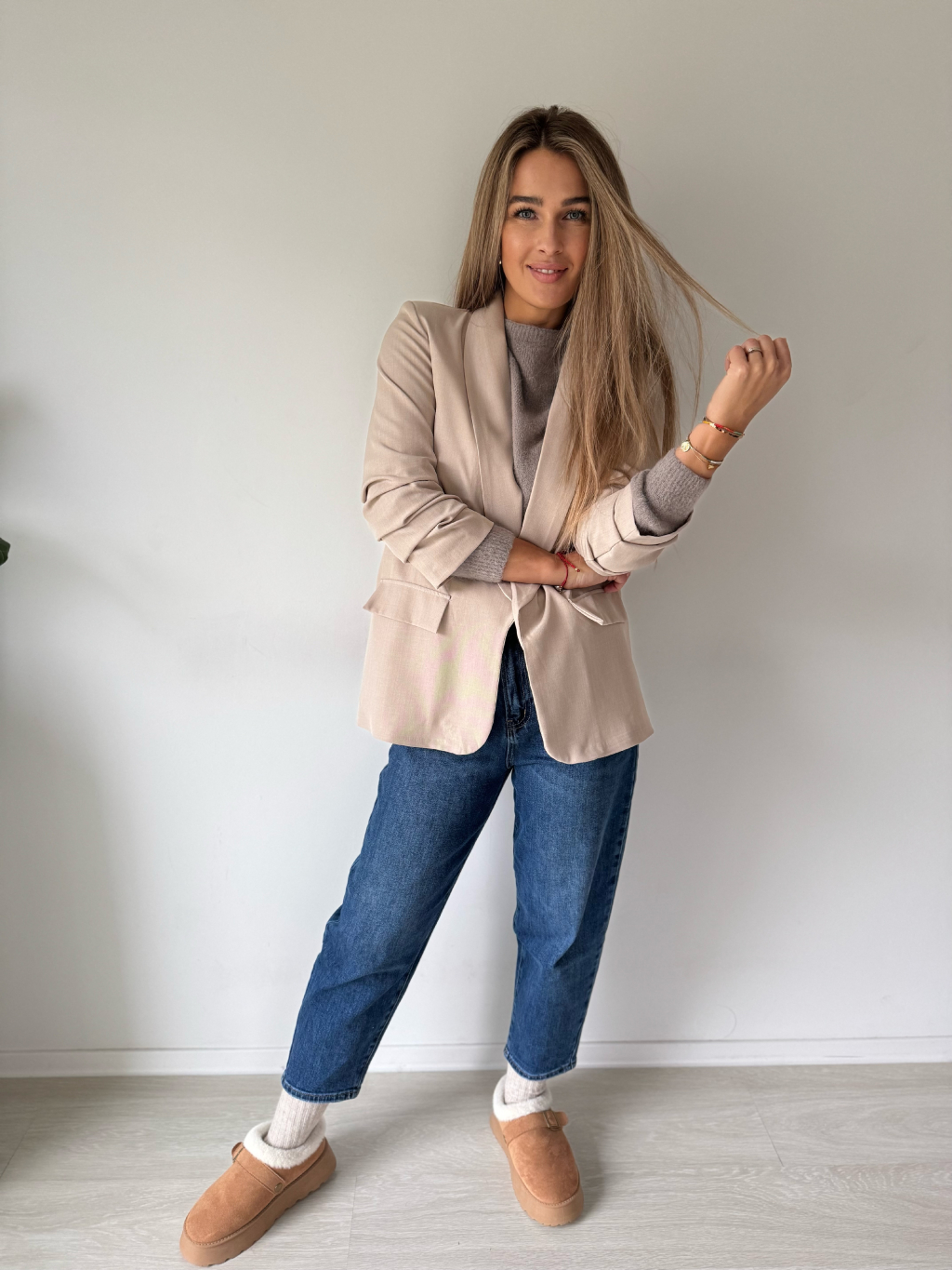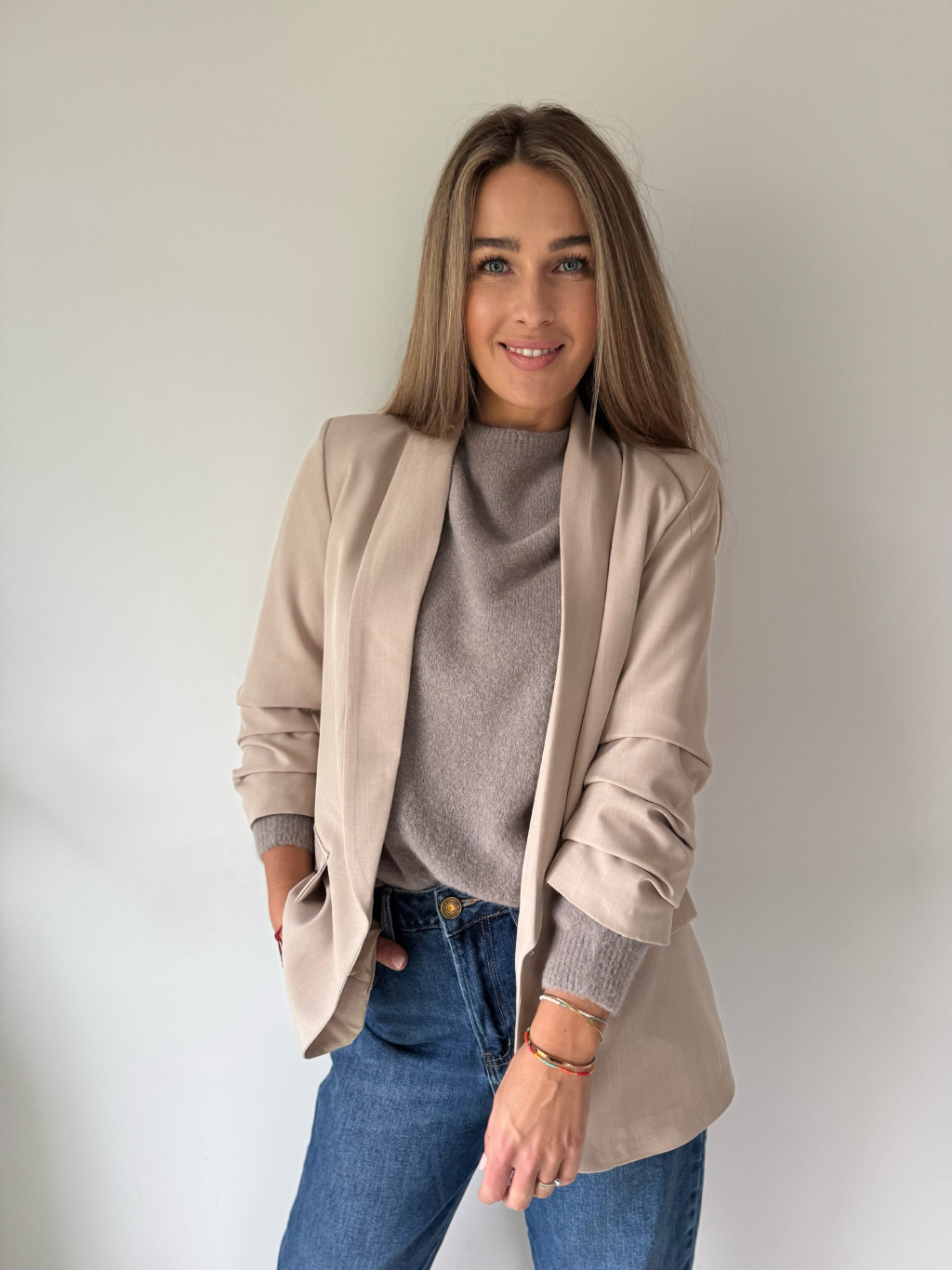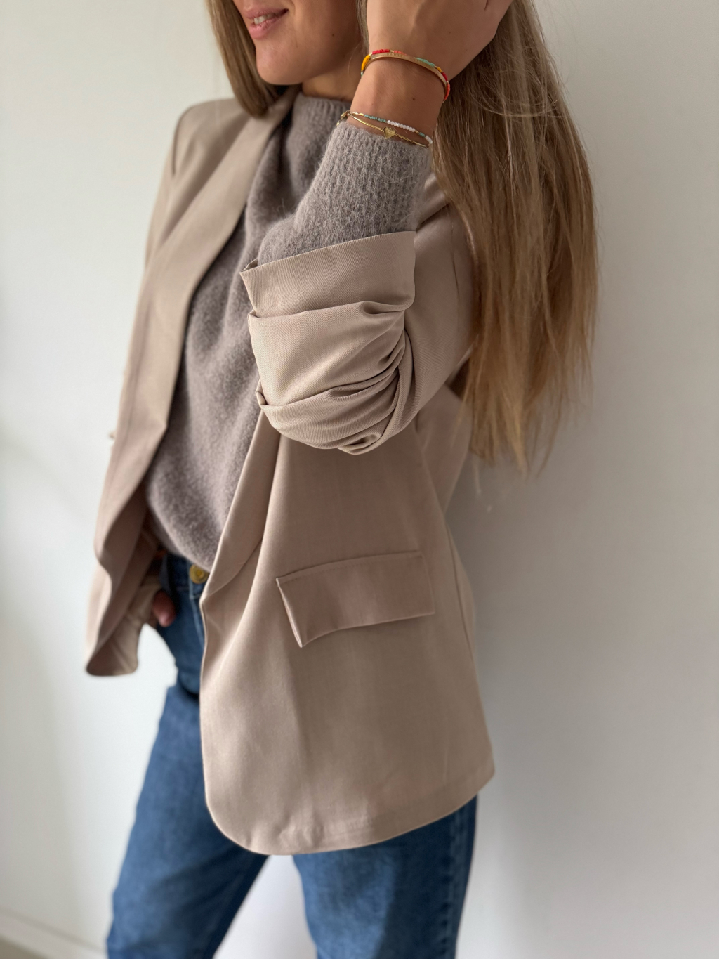 Jednoduché sako bez zapínání. Sako má nařasené rukávy, které lze nosit i ohrnuté.