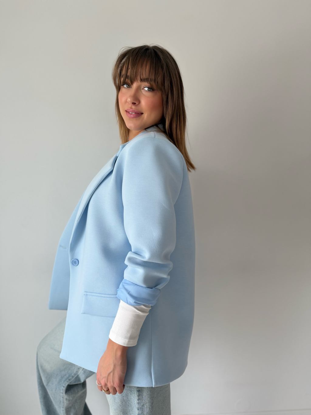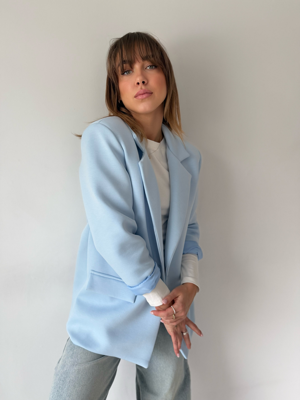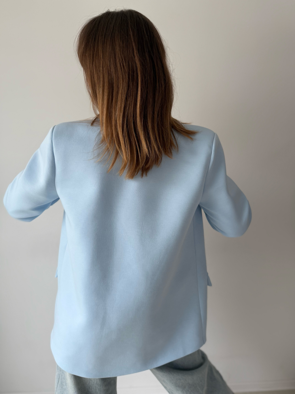 Sako se zapínáním na knoflík. Na ramenou vycpávky. Pružný materiál. Dvě falešné kapsy.