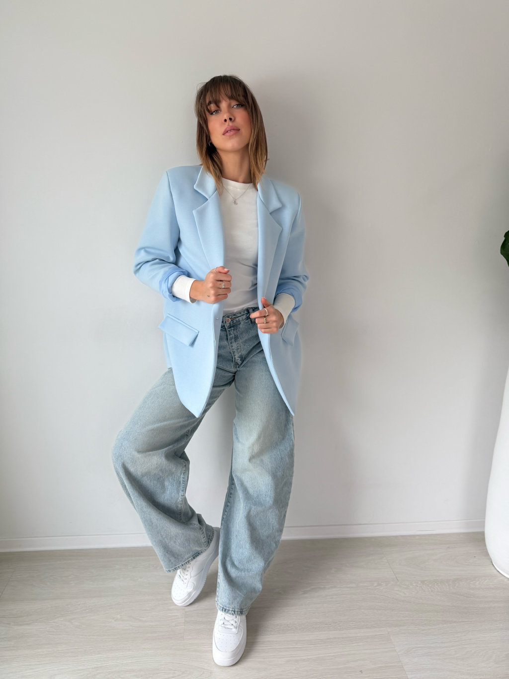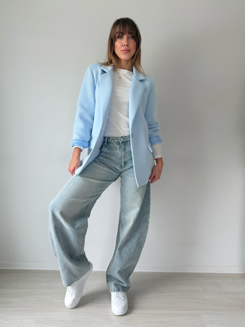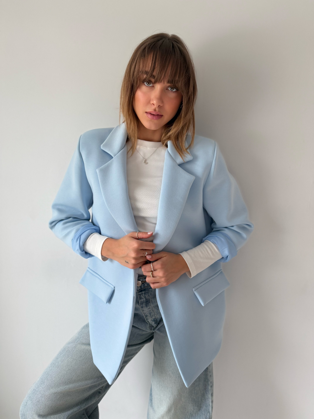 Sako se zapínáním na knoflík. Na ramenou vycpávky. Pružný materiál. Dvě falešné kapsy.