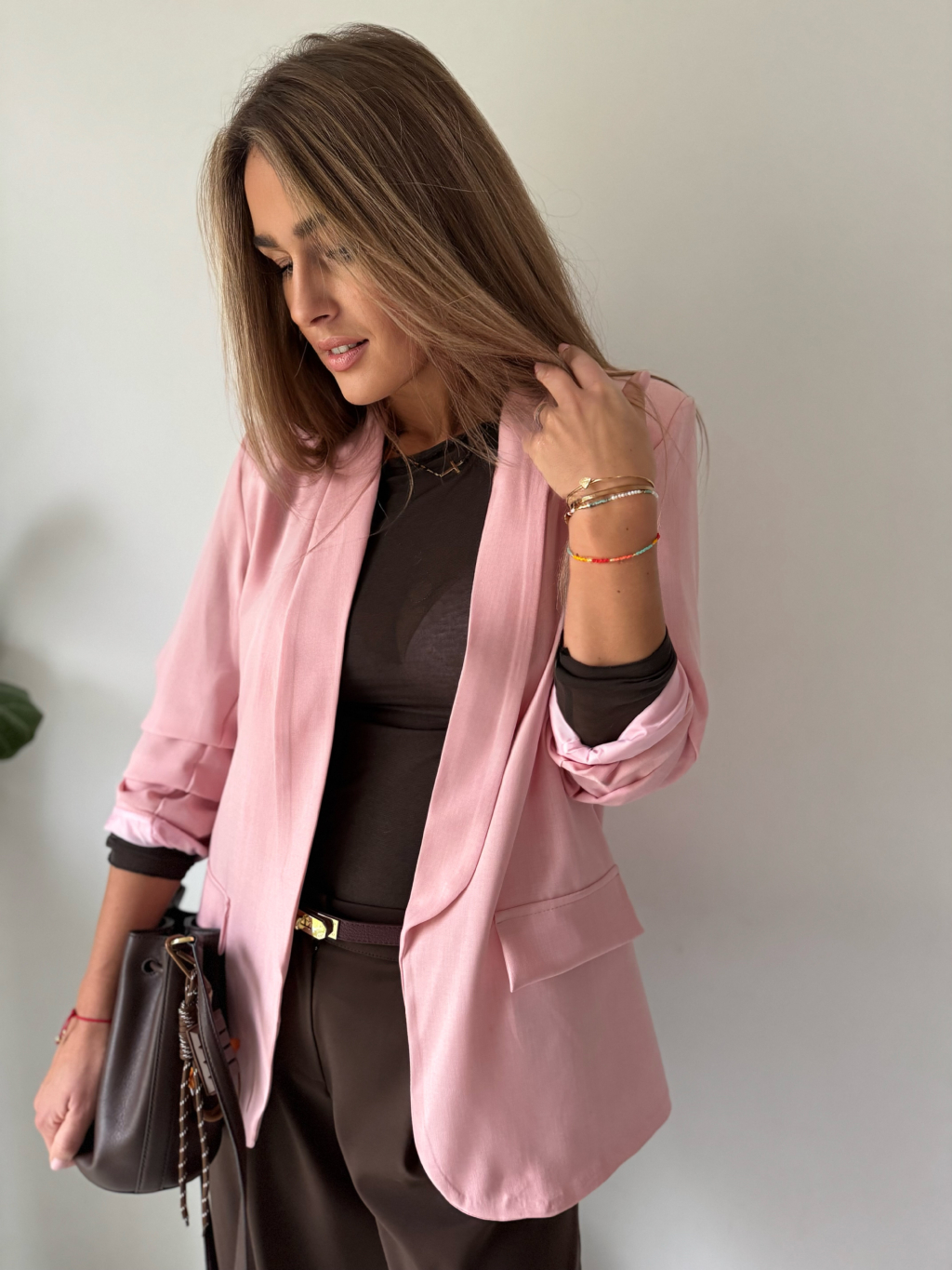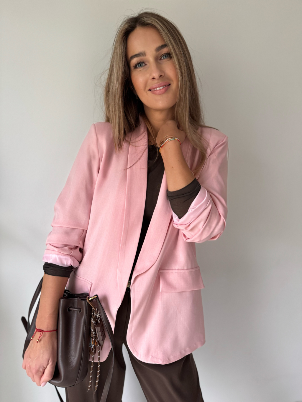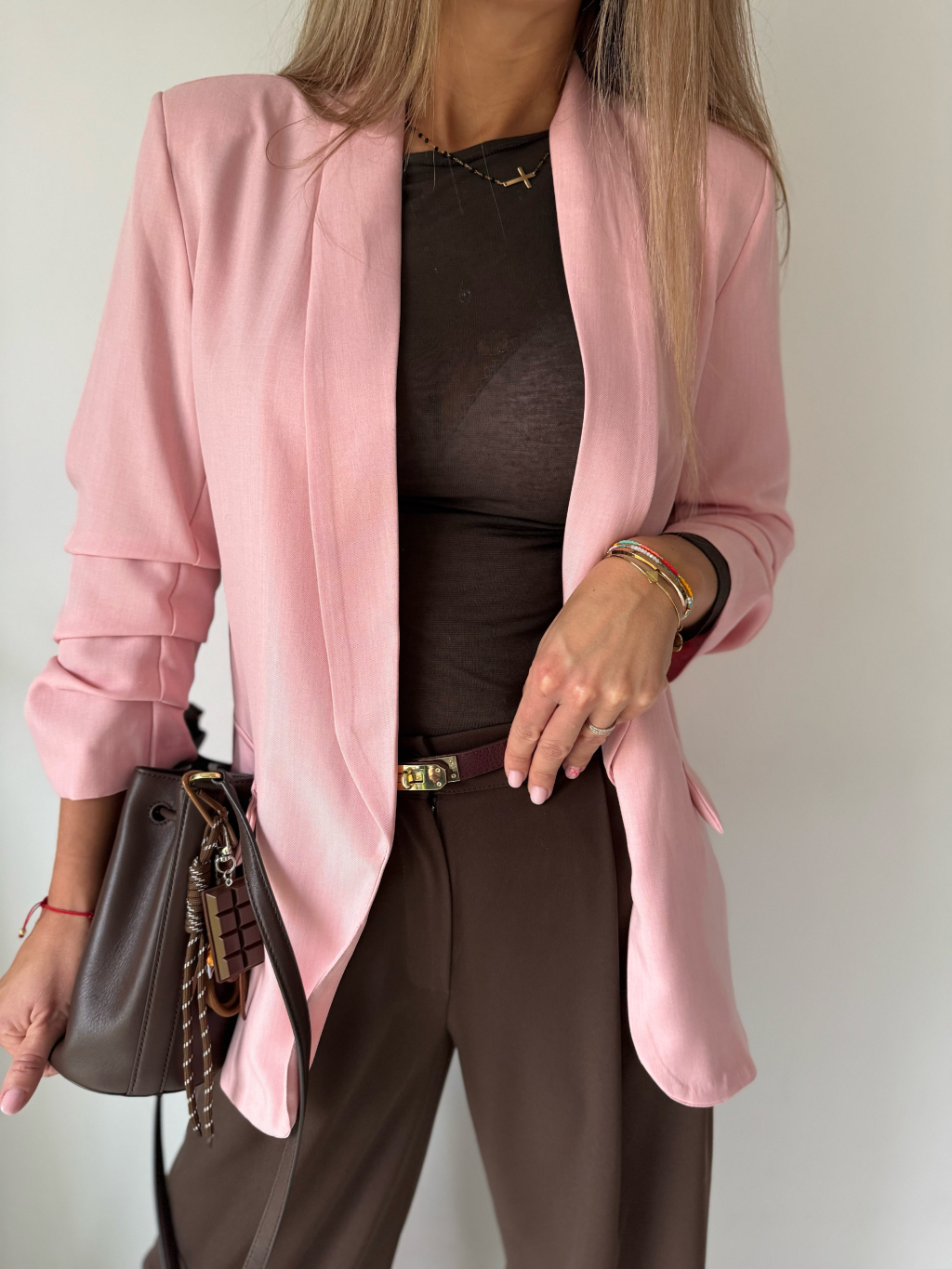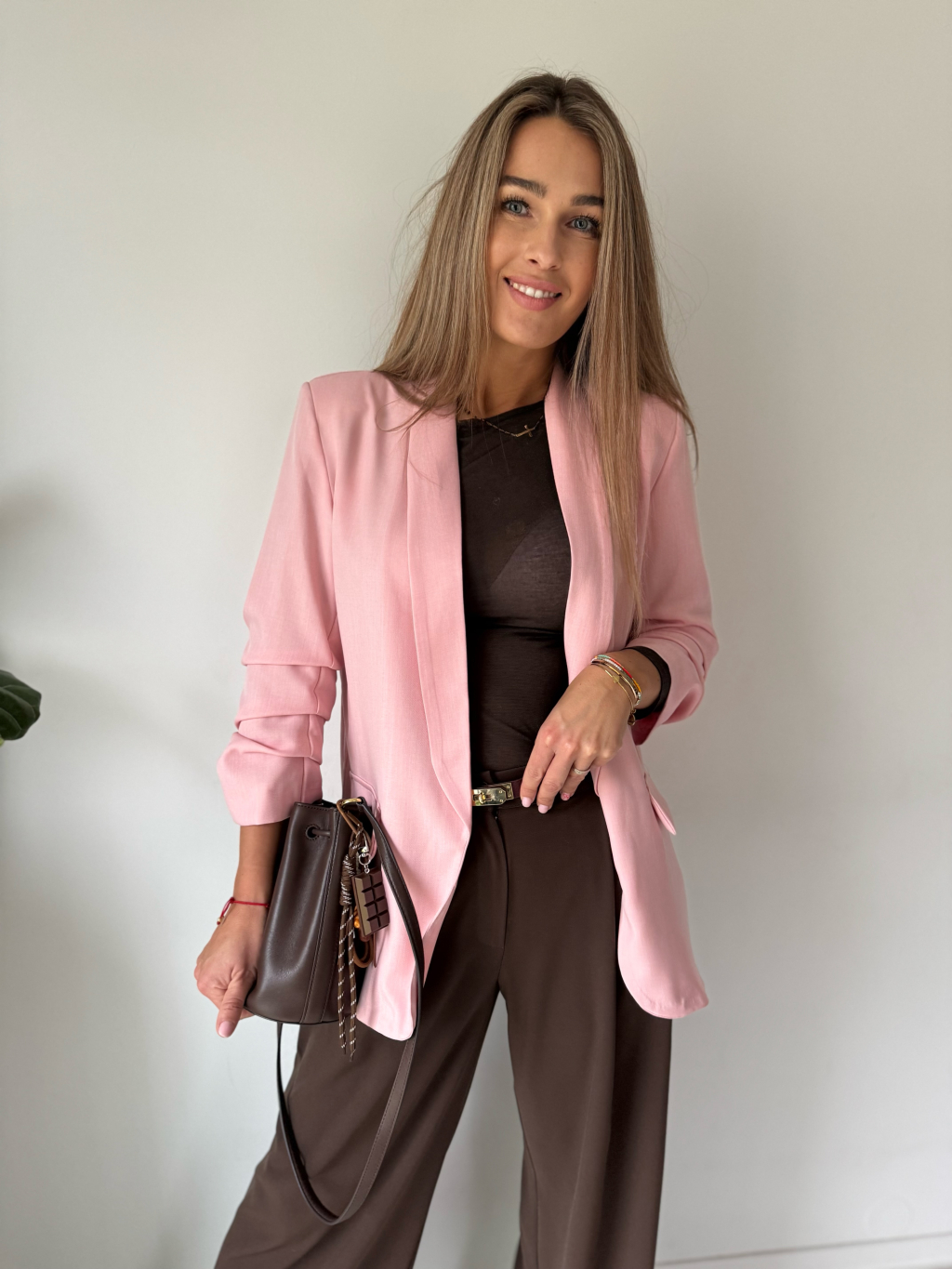 Jednoduché sako bez zapínání. Sako má nařasené rukávy, které lze nosit i ohrnuté.