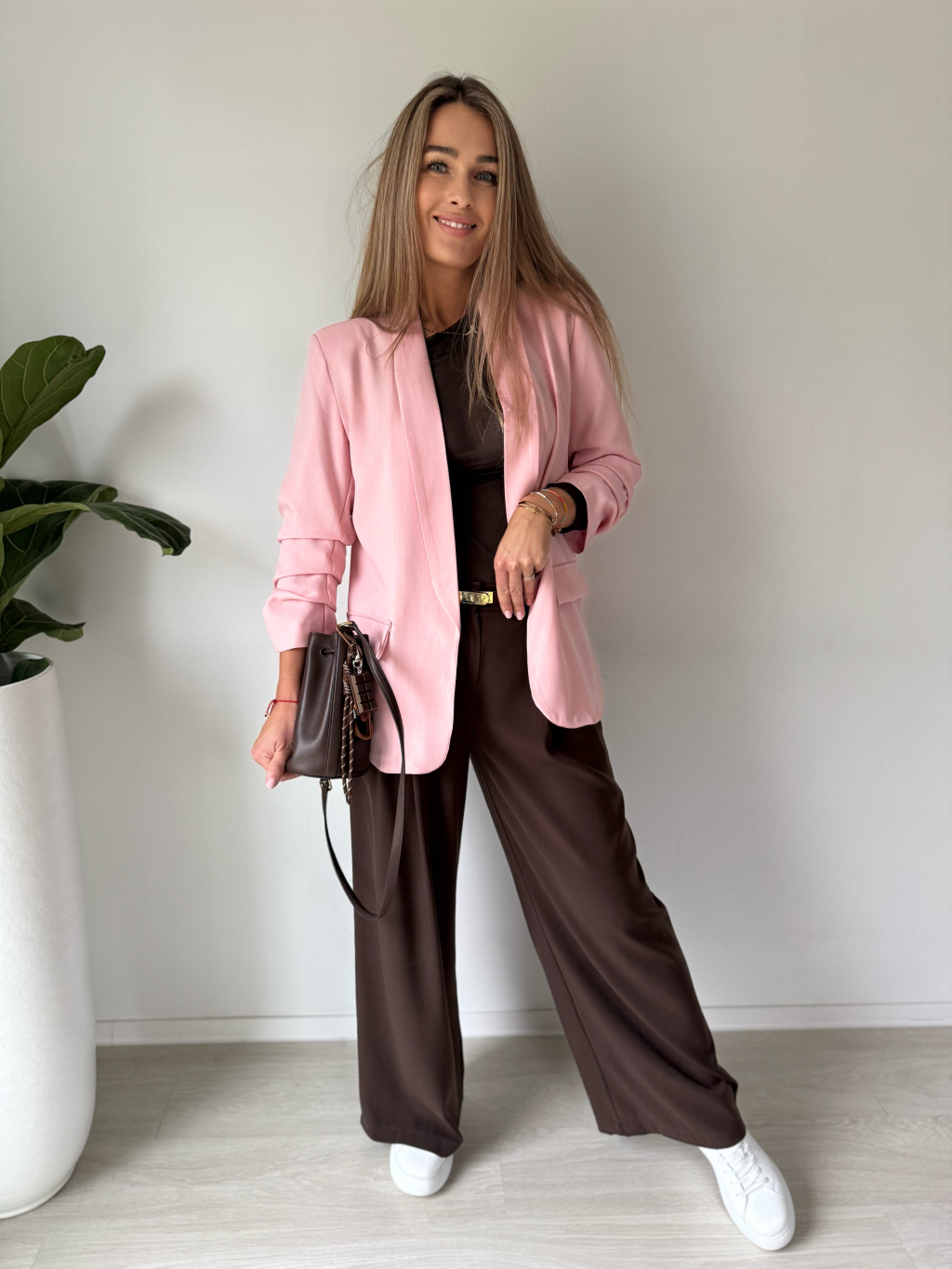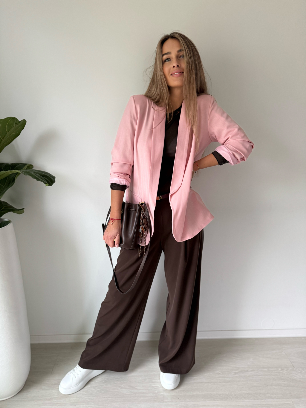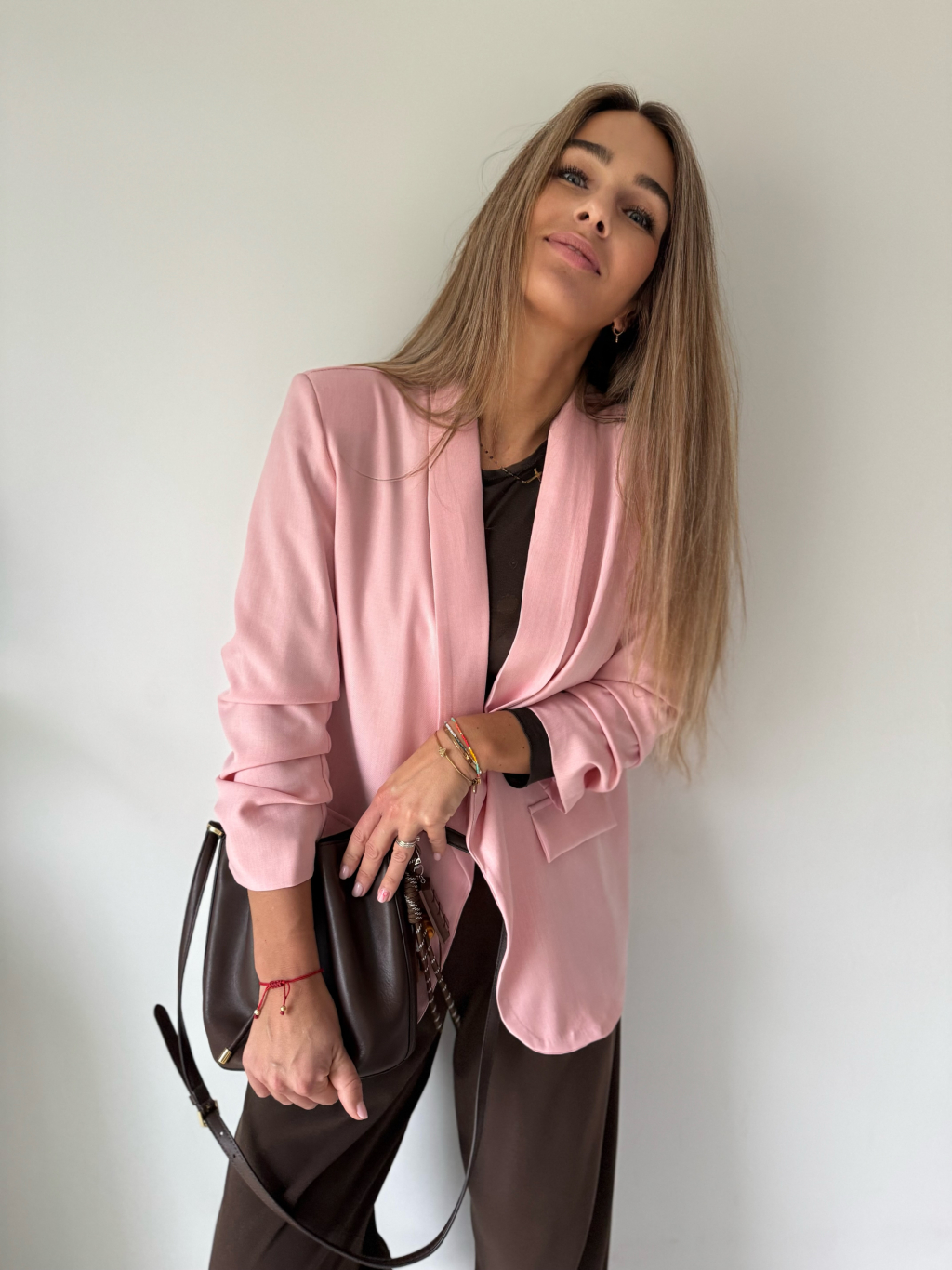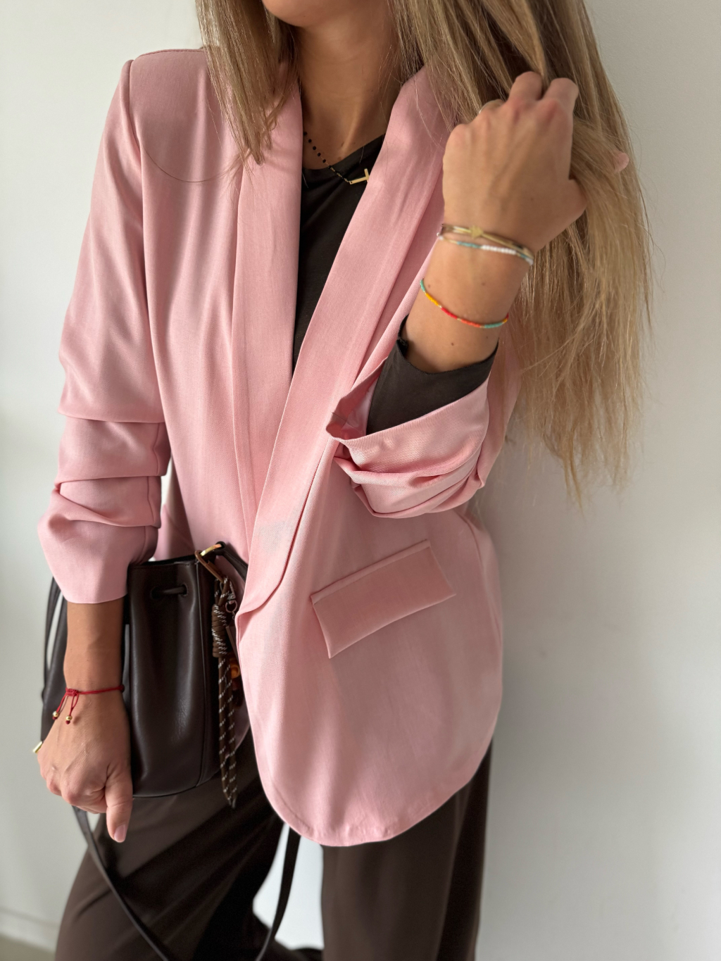 Jednoduché sako bez zapínání. Sako má nařasené rukávy, které lze nosit i ohrnuté.
