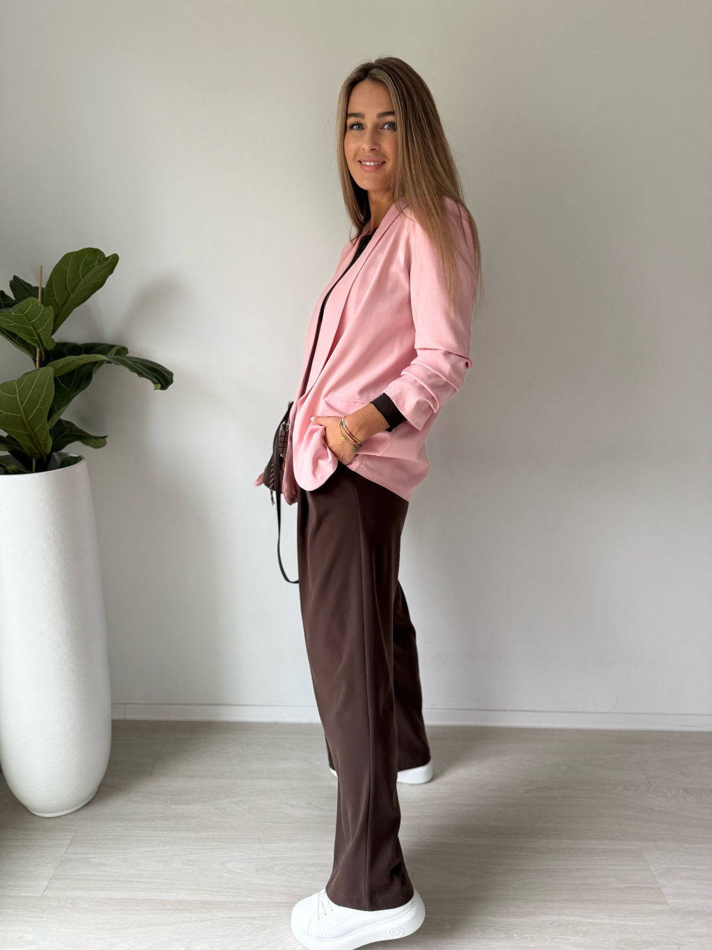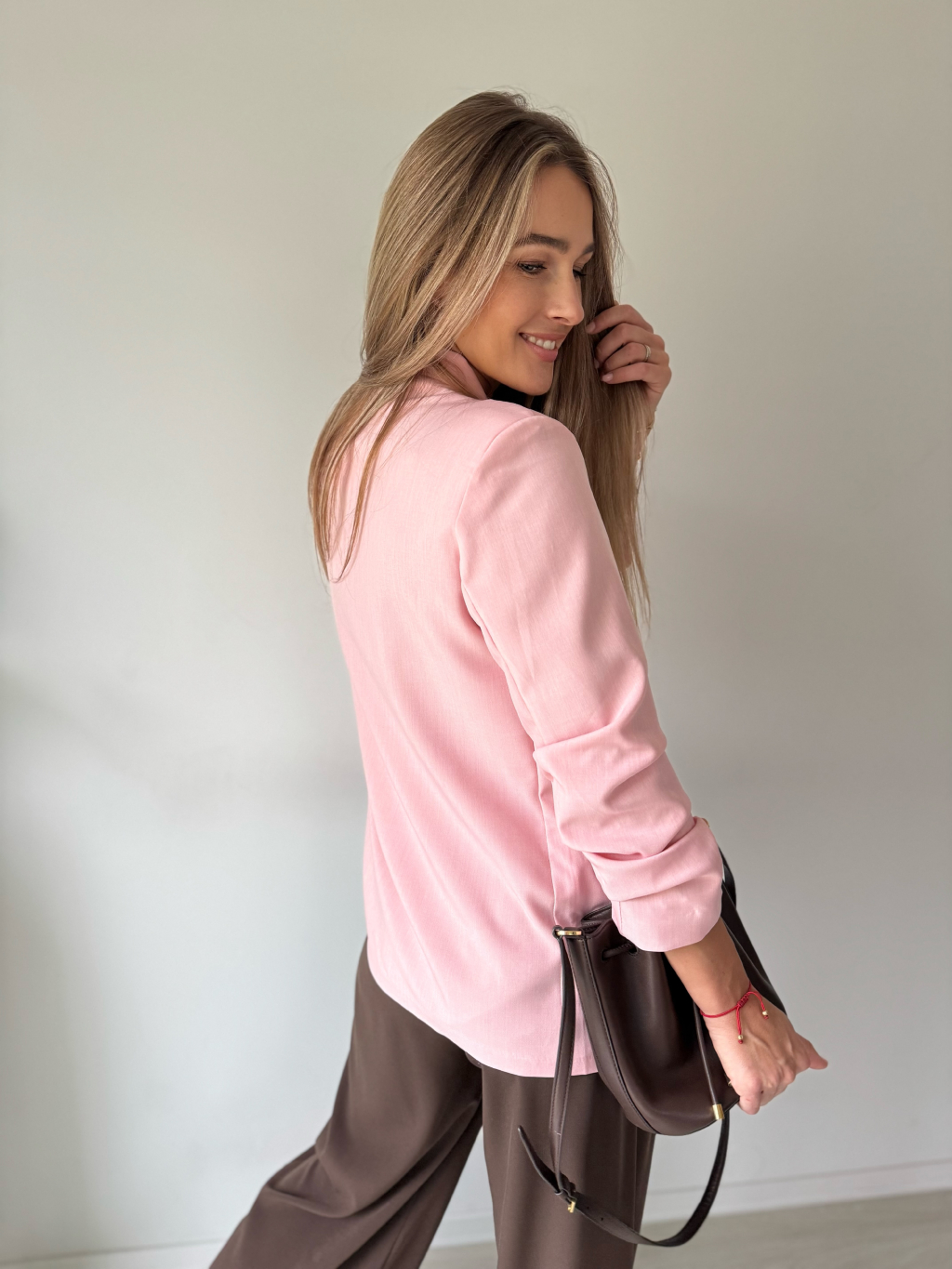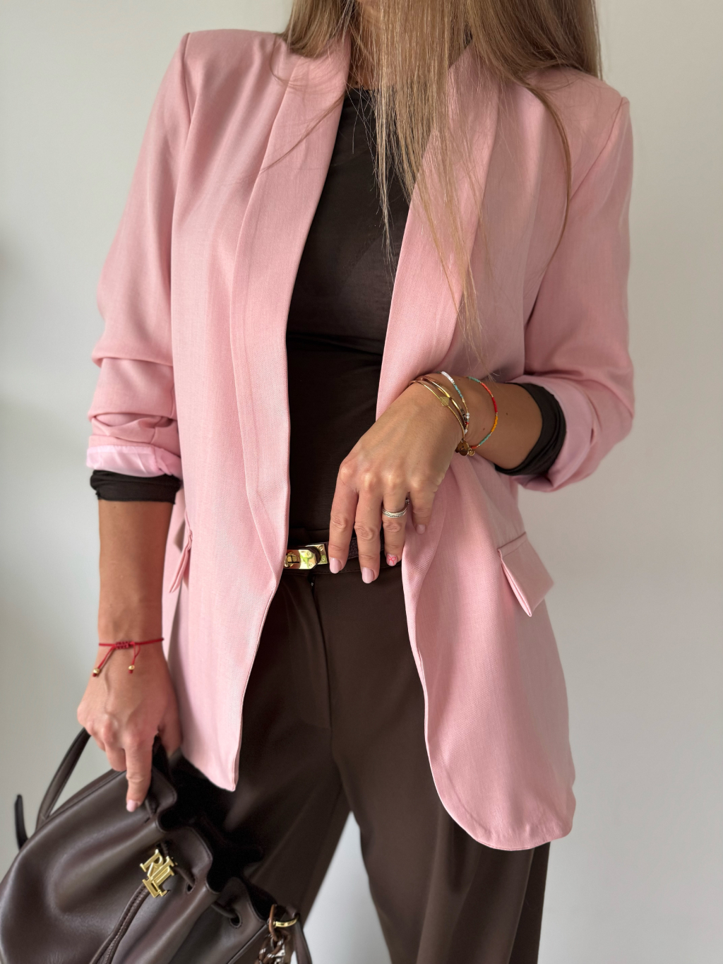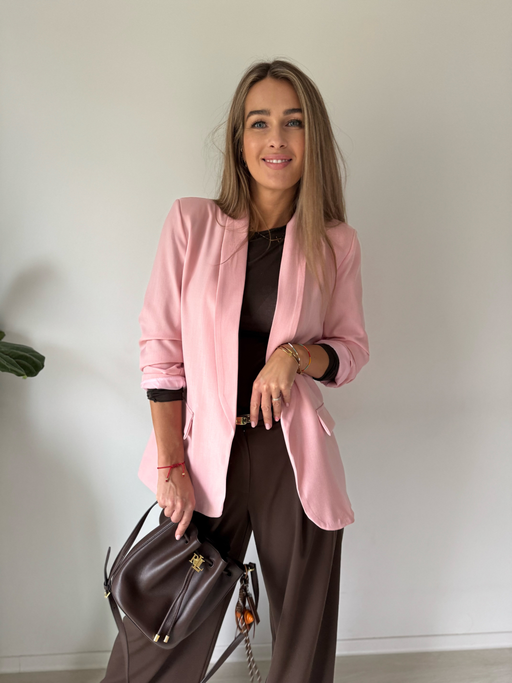 Jednoduché sako bez zapínání. Sako má nařasené rukávy, které lze nosit i ohrnuté.