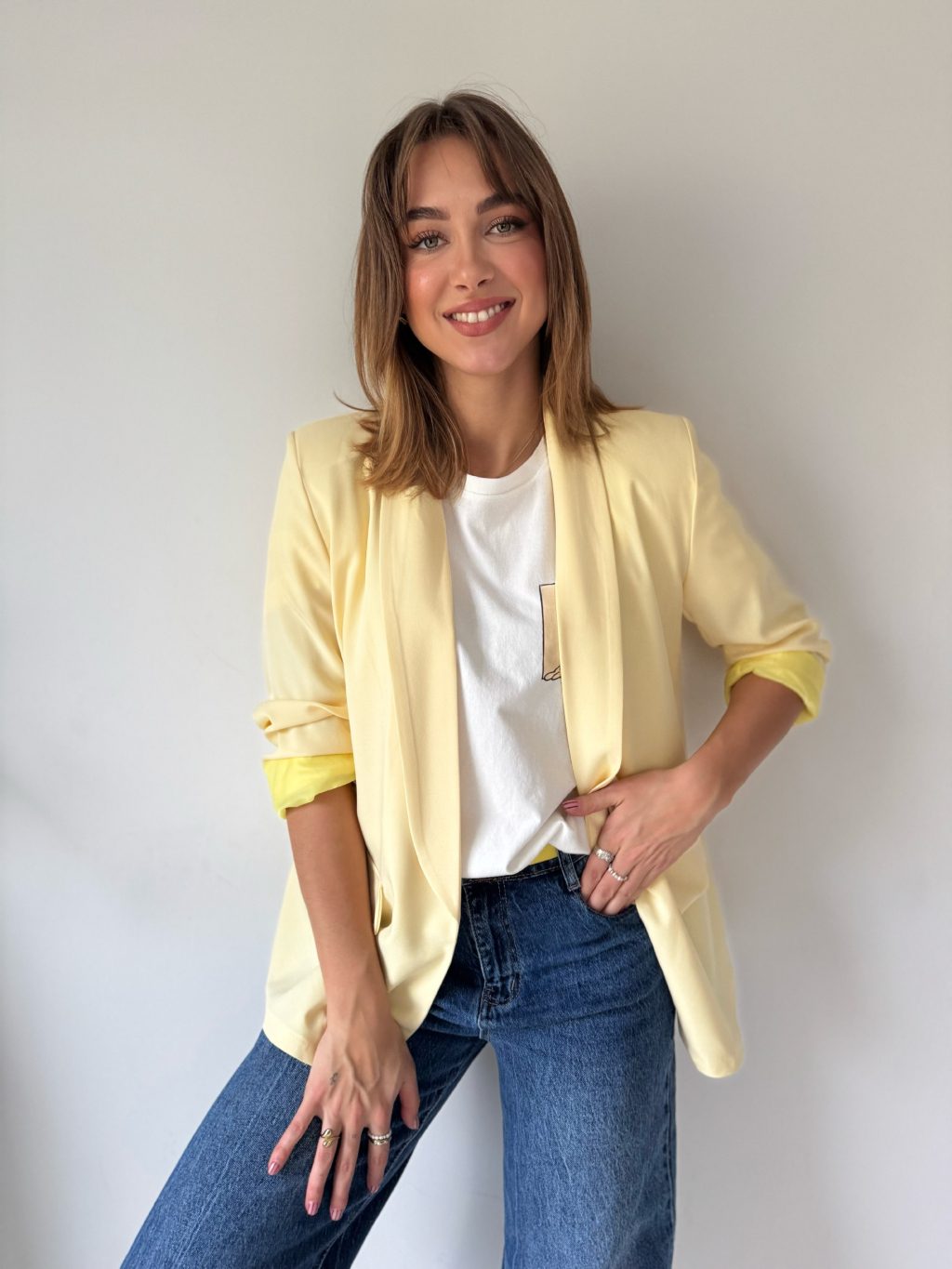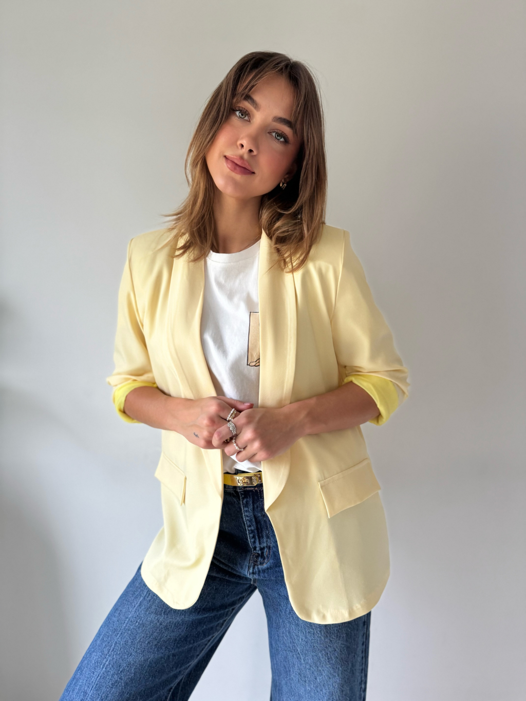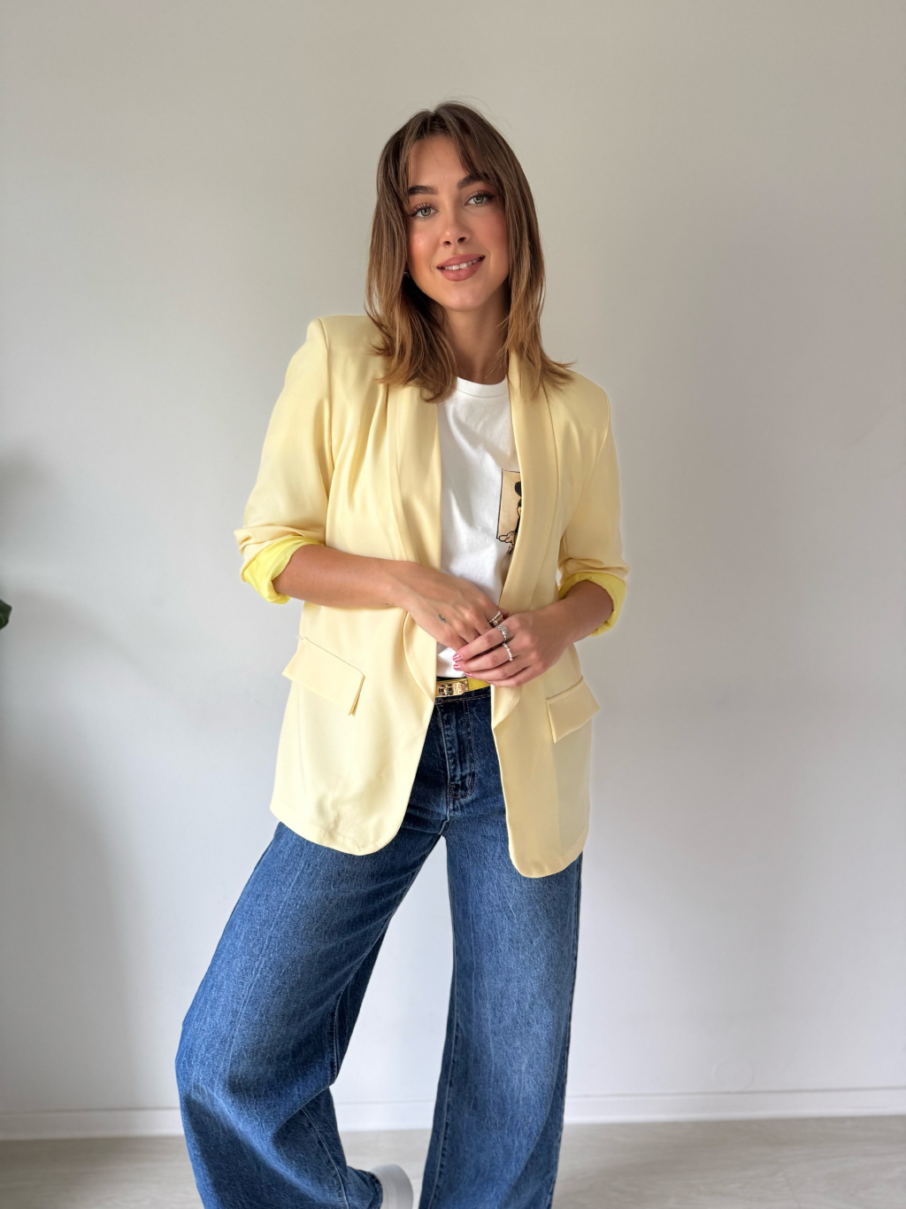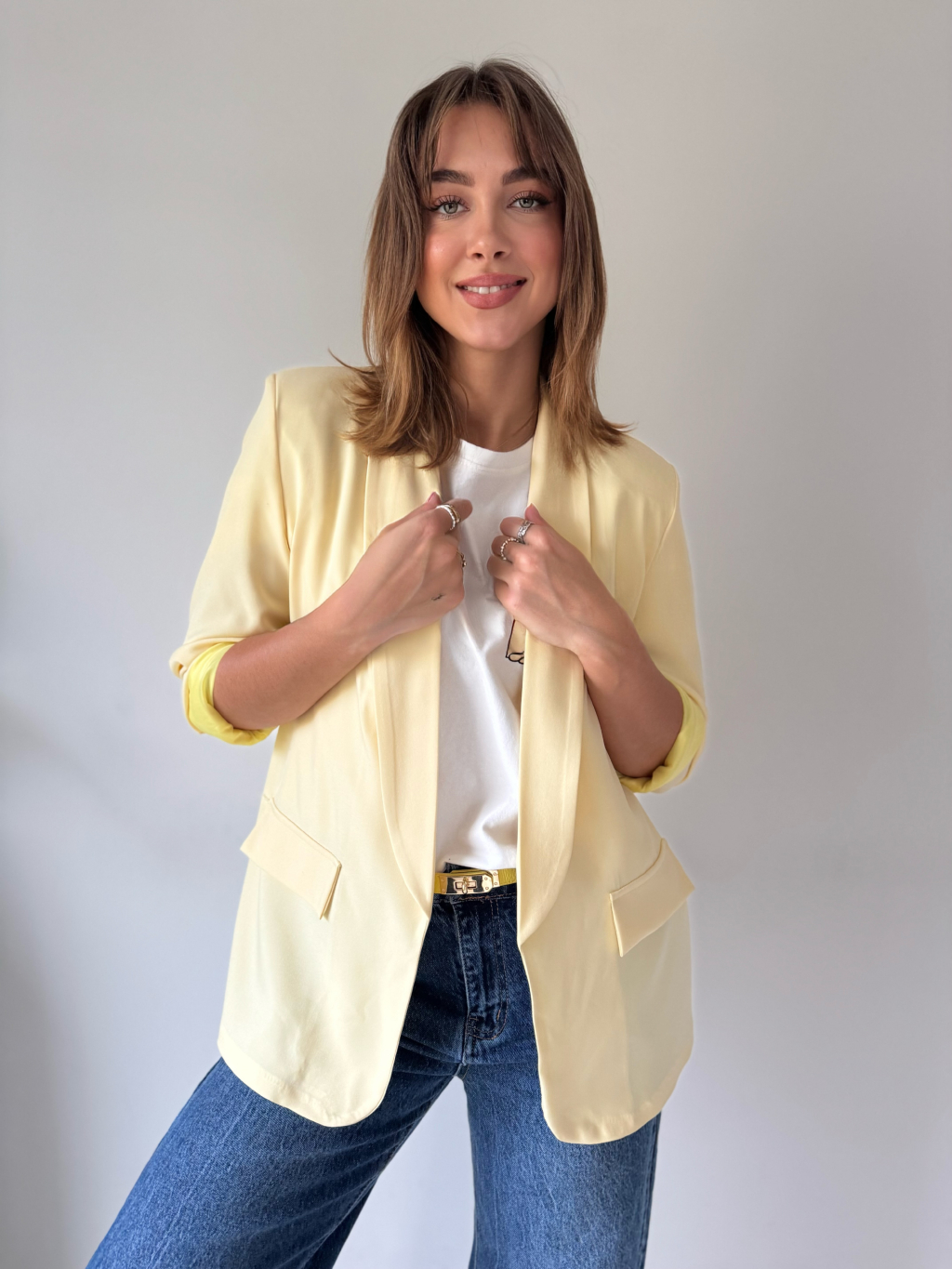 Jednoduché sako bez zapínání. Sako má nařasené rukávy, které lze nosit i ohrnuté.