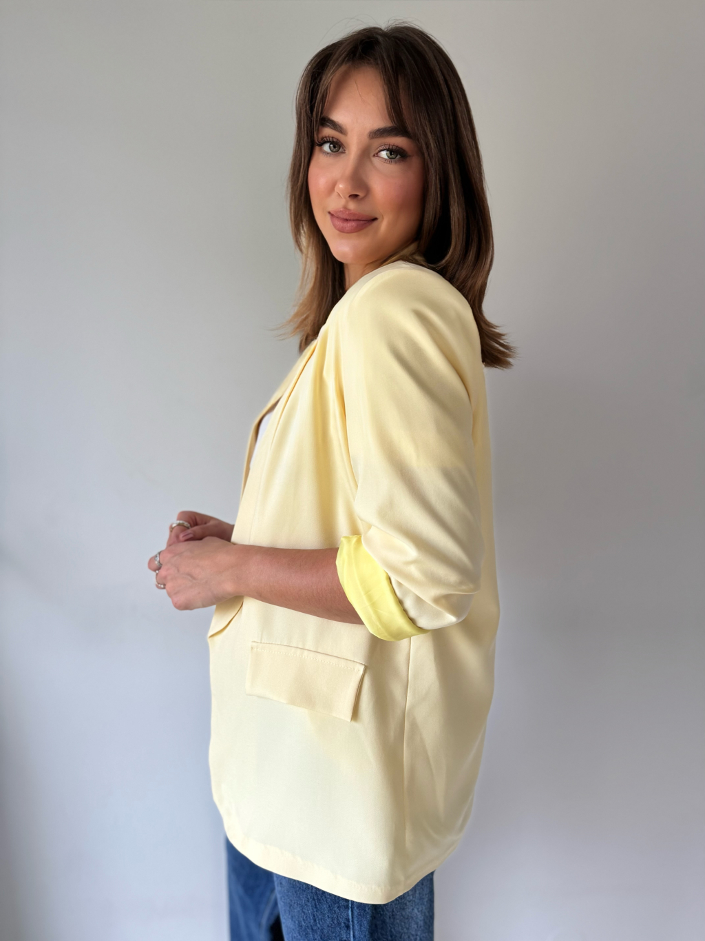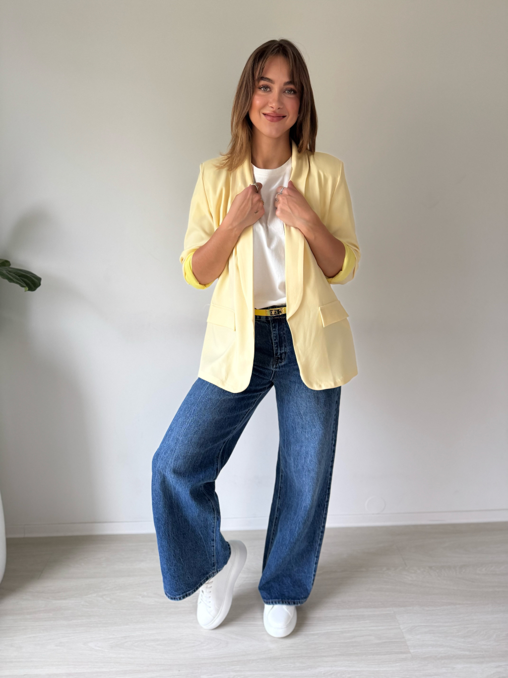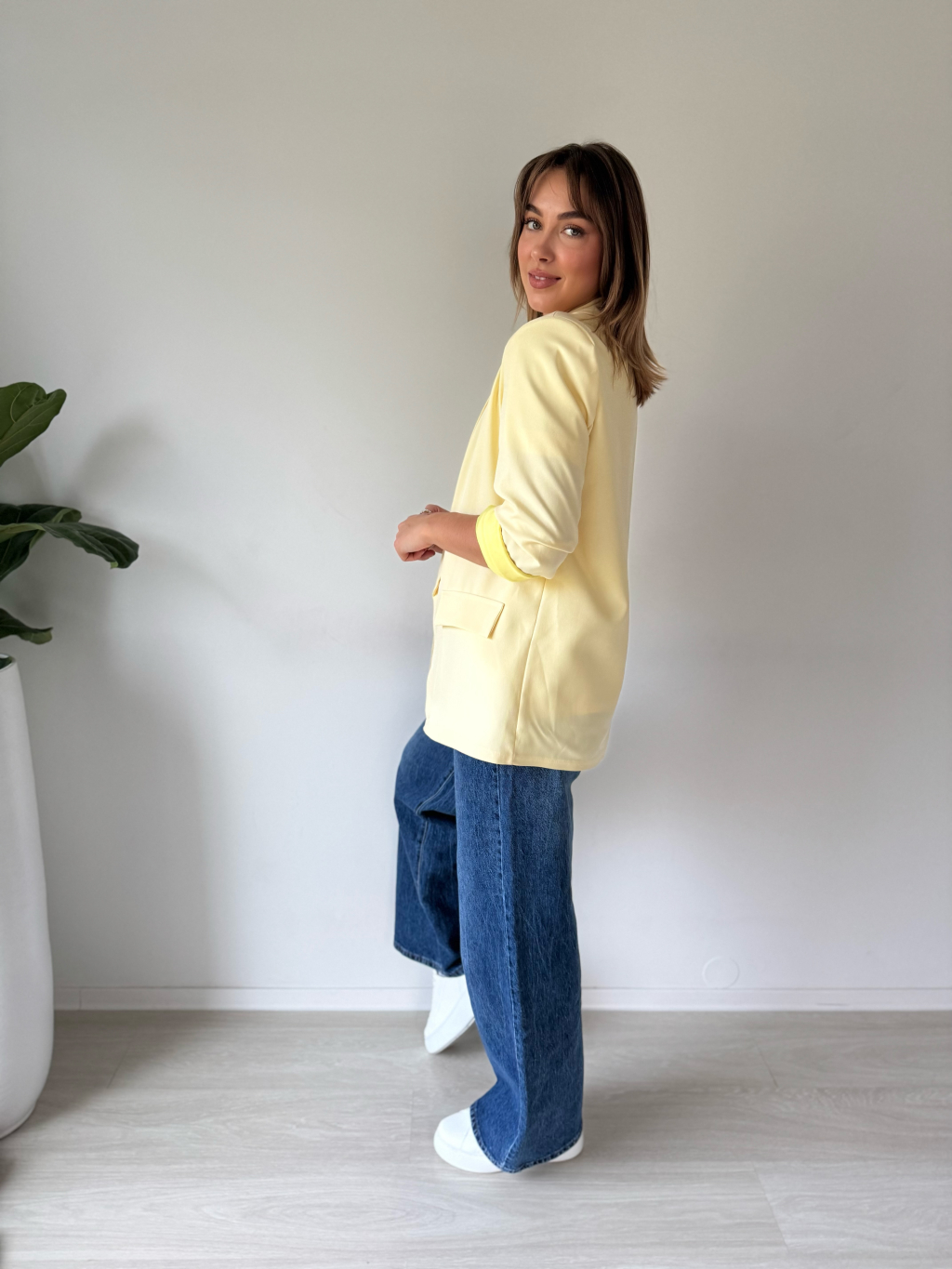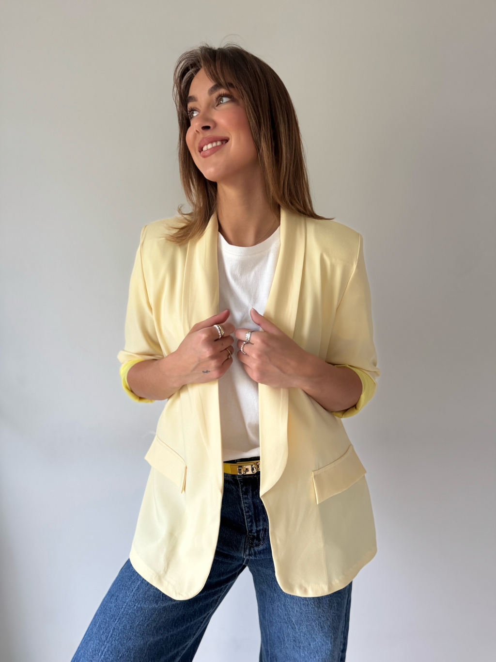Jednoduché sako bez zapínání. Sako má nařasené rukávy, které lze nosit i ohrnuté.