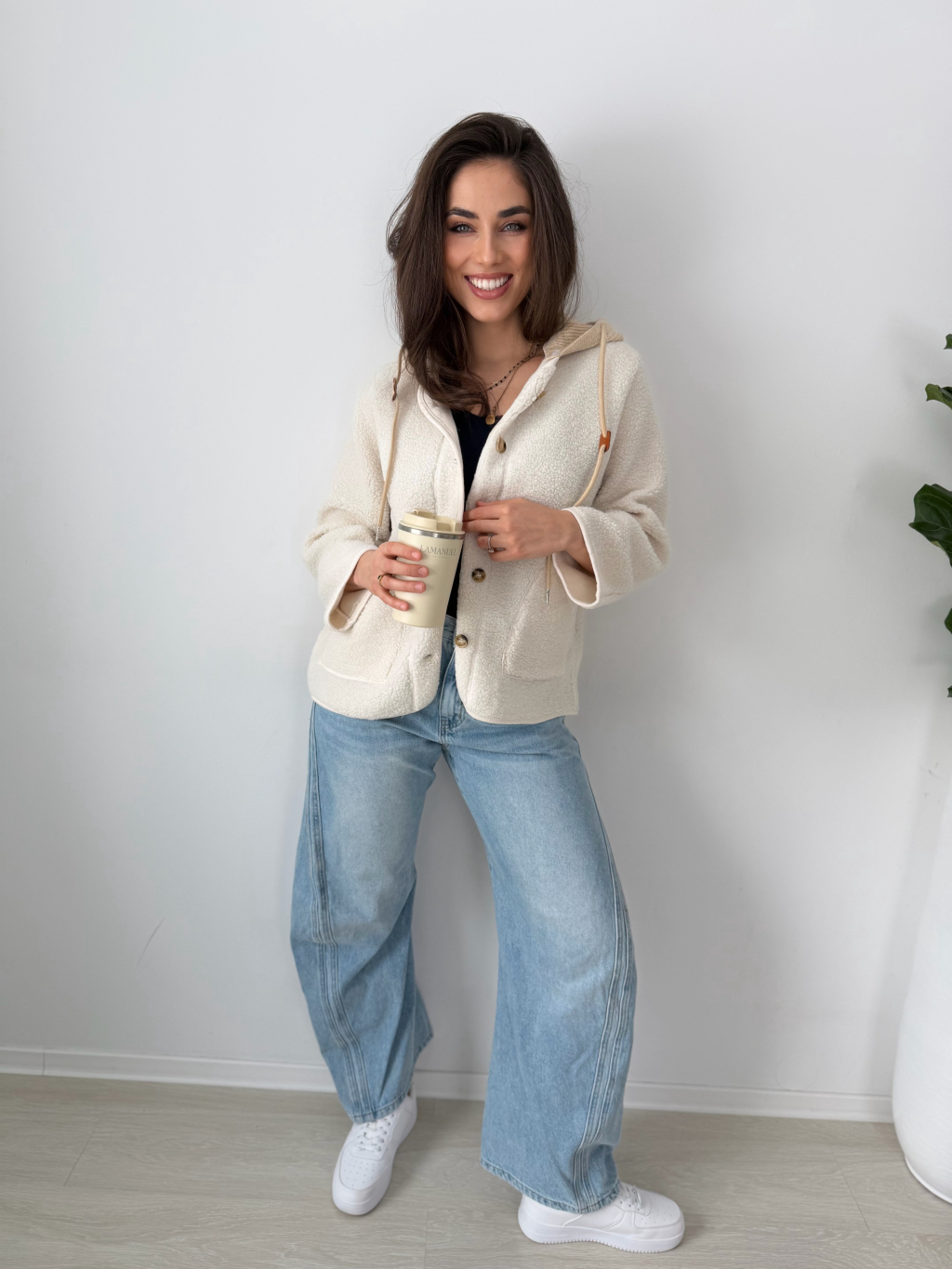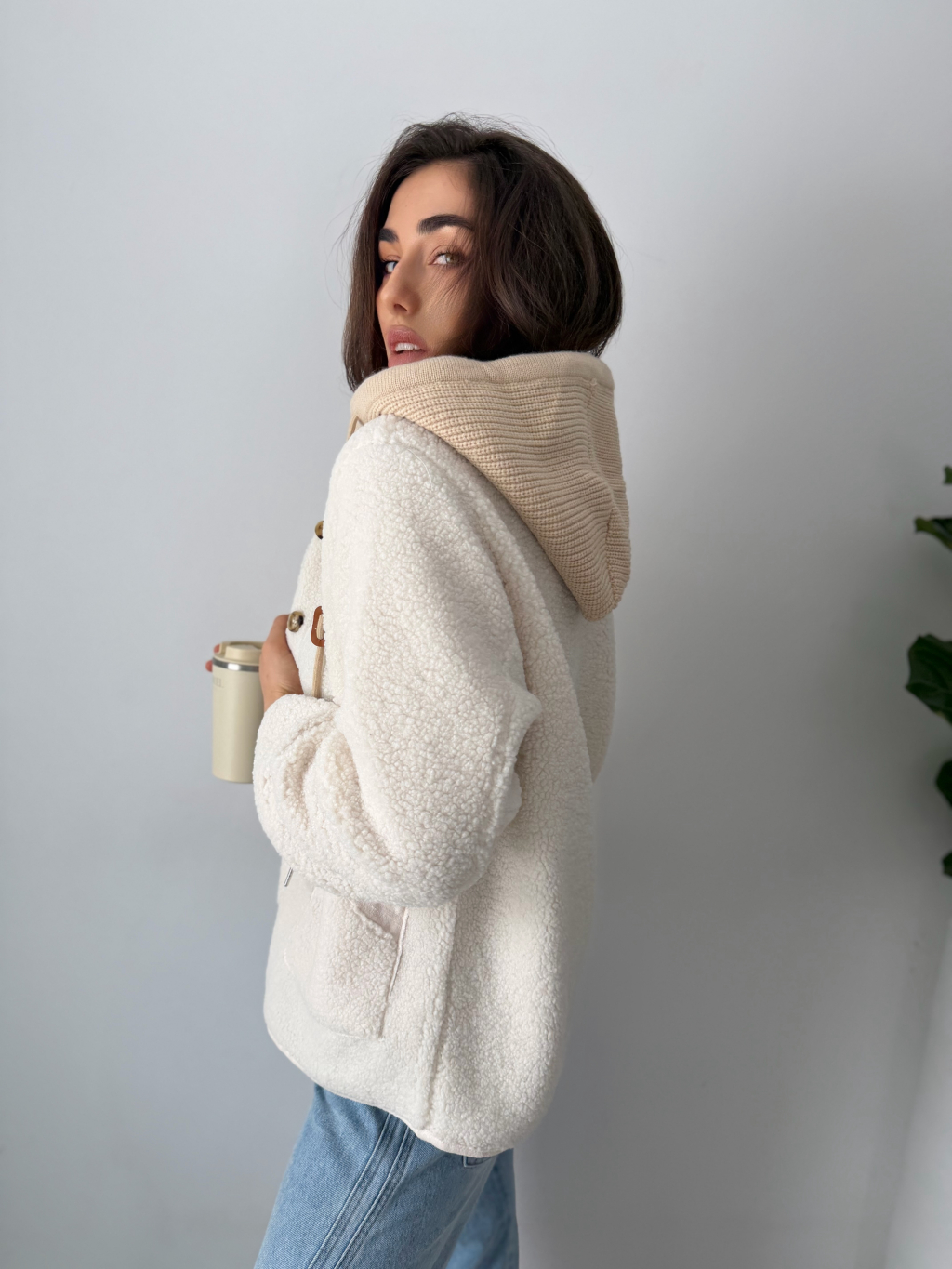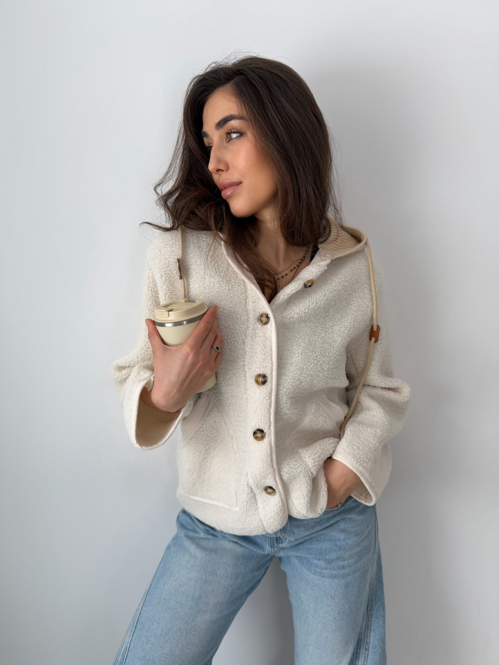 Bunda má zapínání na knoflíky. Dvě šikmé kapsy. Pletená odpínací kapuce.