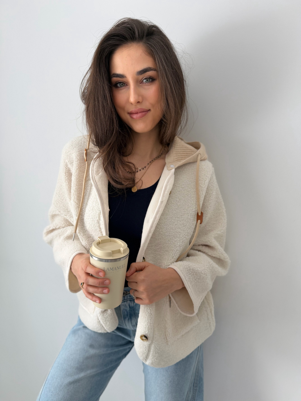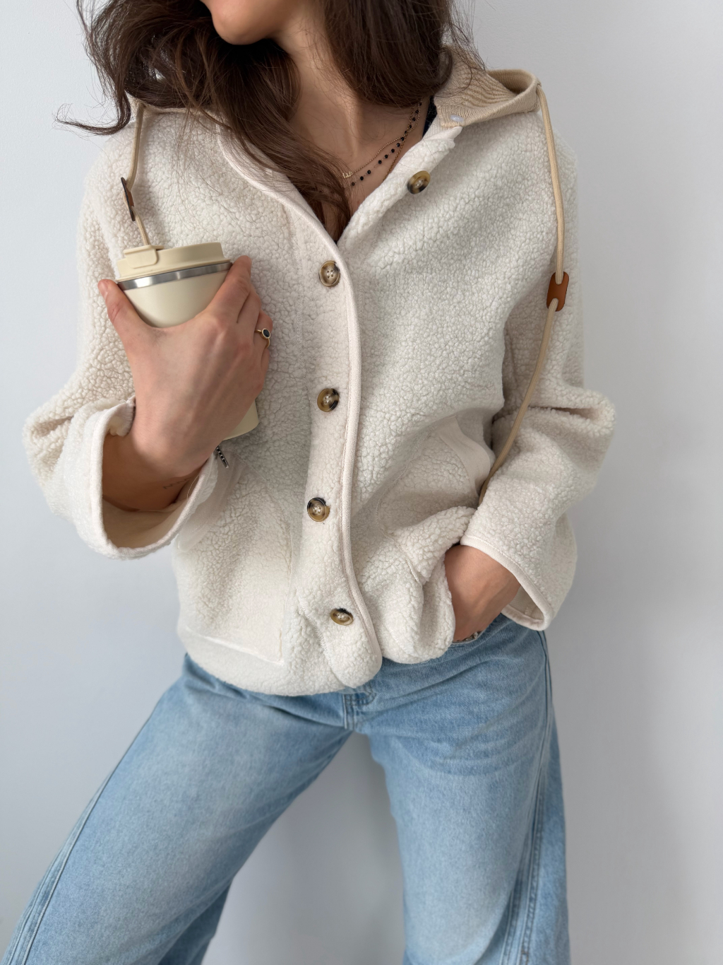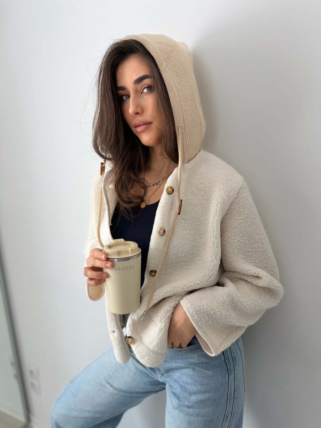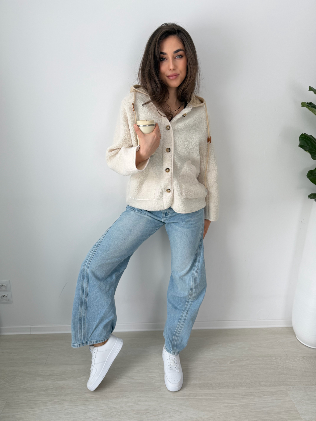 Bunda má zapínání na knoflíky. Dvě šikmé kapsy. Pletená odpínací kapuce.